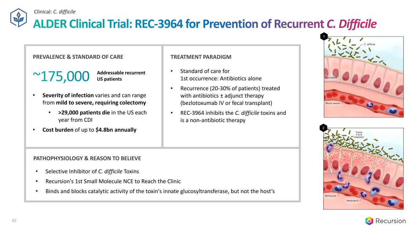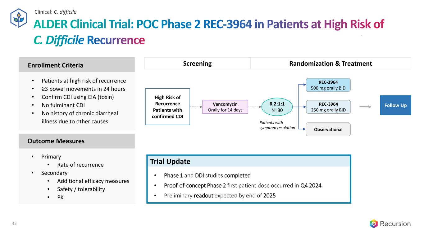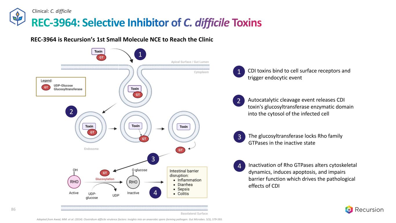 クロストリジオイデス・ディフィシル感染症(REC-3964):10月、再発性クロストリジオイデスディフィシル感染症に対するファースト・イン・クラスの可能性を秘めた経口非抗生低分子製剤であるREC-3964の第2相臨床試験において、最初の患者が投与されたことを発表した。当社の第2相臨床試験ALDERは、バンコマイシンによる初回治癒後の観察コホートと比較して、REC-3964を2用量投与した場合の再発率を評価するためにデザインされた非盲検多施設無作為化試験です。