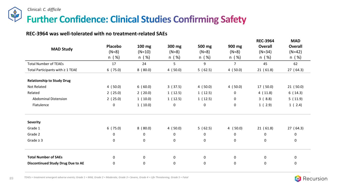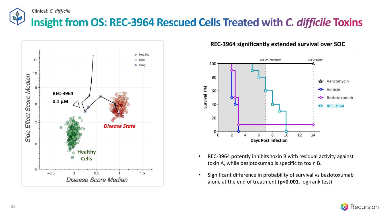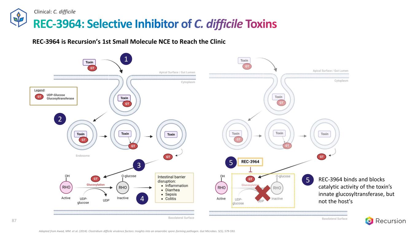 クロストリジオイデス・ディフィシル感染症(REC-3964):10月、再発性クロストリジオイデスディフィシル感染症に対するファースト・イン・クラスの可能性を秘めた経口非抗生低分子製剤であるREC-3964の第2相臨床試験において、最初の患者が投与されたことを発表した。当社の第2相臨床試験ALDERは、バンコマイシンによる初回治癒後の観察コホートと比較して、REC-3964を2用量投与した場合の再発率を評価するためにデザインされた非盲検多施設無作為化試験です。