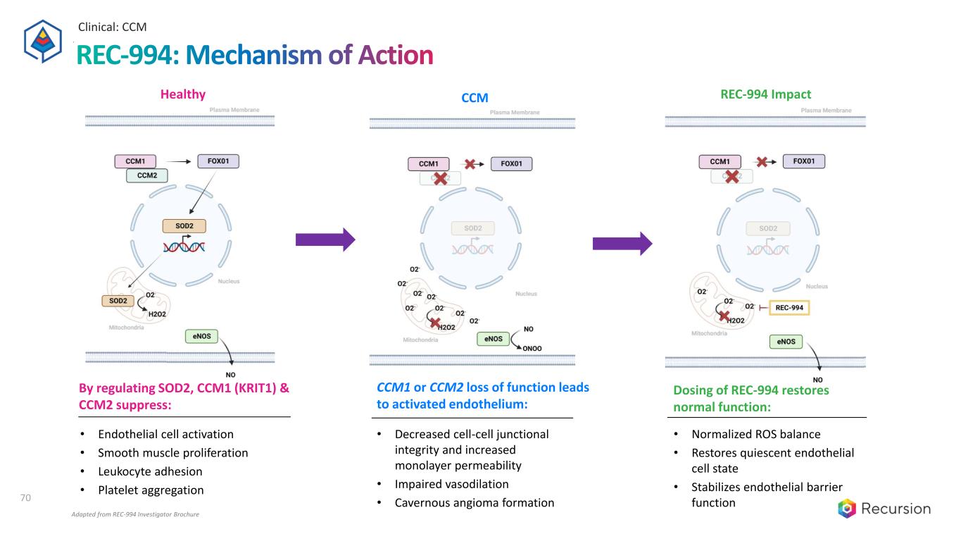 脳空洞奇形(CCM)(REC-994):CCM患者を対象にREC-994を2用量投与した無作為化二重盲検プラセボ対照第Ⅱ相臨床試験であるSYCAMORE試験は、主要評価項目である安全性を達成し、最高用量におけるMRIに基づく客観的な探索的有効性指標において、病変体積とヘモシデリン輪の大きさの減少という有望な傾向を示したと9月に発表した。我々は、FDAと面談し、その後の試験で症候性CCMの潜在的治療薬としてREC-994の開発を進める予定である。また、第2相データを医学学会で発表し、査読のある科学雑誌に結果を発表する予定である。
