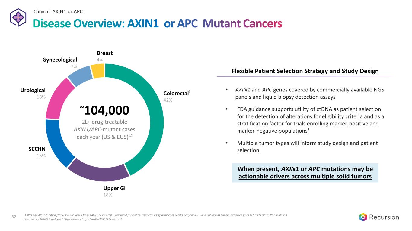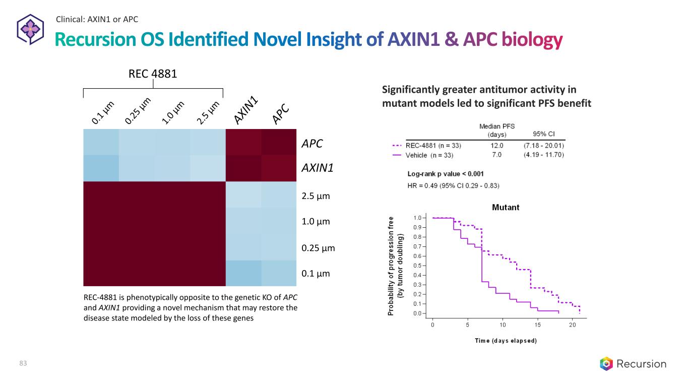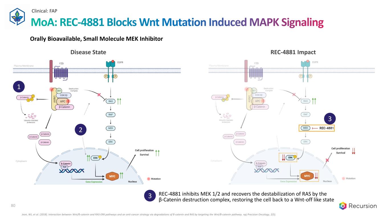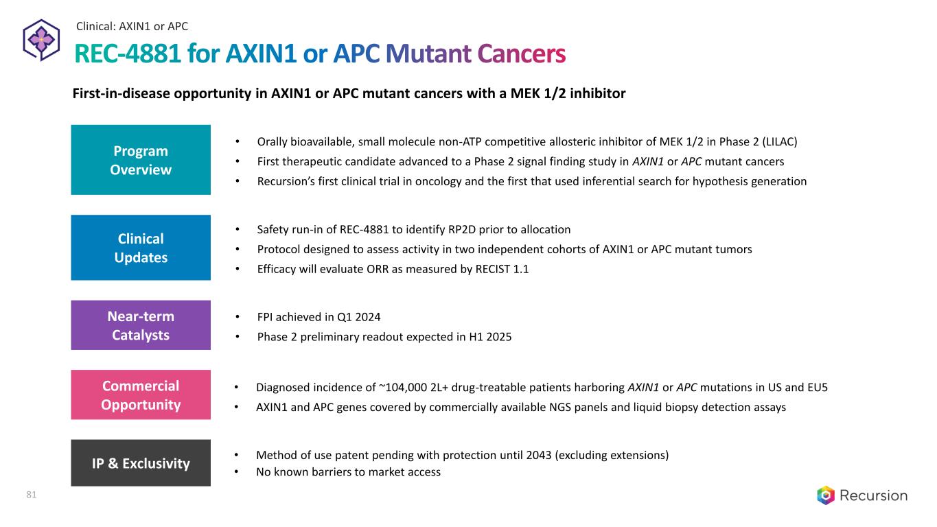 APCまたはAXIN1変異がん(REC-4881):当社の第2相LILAC臨床試験は、AXIN1またはAPC変異を有する切除不能な局所進行または転移性がん患者を対象としたREC-4881のオープンラベル多施設共同試験である。第 2 相試験の安全性および予備的有効性データを 2025 年上半期に公表する予定である。