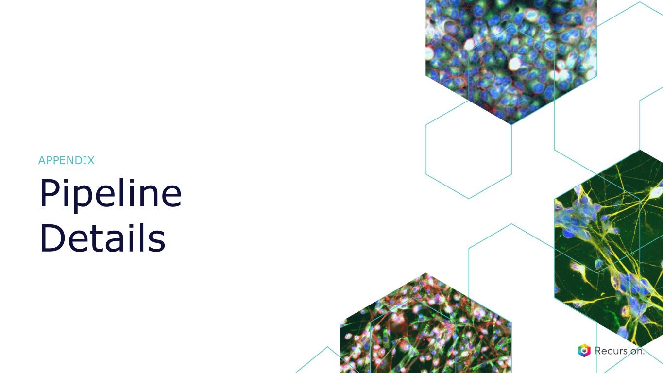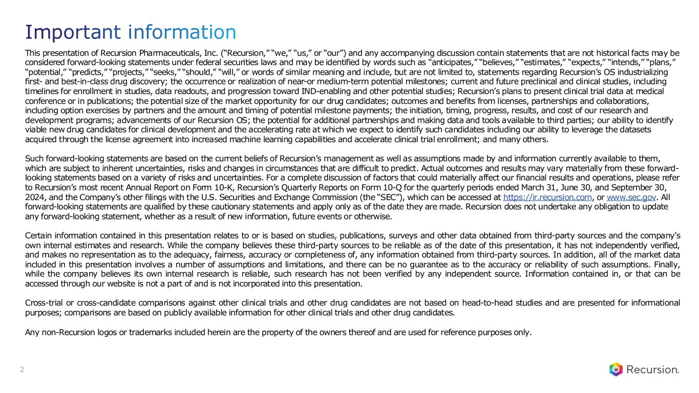 This presentation of Recursion Pharmaceuticals, Inc. (“Recursion,” “we,” “us,” or “our”) and any accompanying discussion contain statements that are not historical facts may be considered forward-looking statements under federal securities laws and may be identified by words such as “anticipates,” “believes,” “estimates,” “expects,” “intends,” “plans,” “potential,” “predicts,” “projects,” “seeks,” “should,” “will,” or words of similar meaning and include, but are not limited to, statements regarding Recursion’s OS industrializing first- and best-in-class drug discovery; the occurrence or realization of near-or medium-term potential milestones; current and future preclinical and clinical studies, including timelines for enrollment in studies, data readouts, and progression toward IND-enabling and other potential studies; Recursion’s plans to present clinical trial data at medical conference or in publications; the potential size of the market opportunity for our drug candidates; outcomes and benefits from licenses, partnerships and collaborations, including option exercises by partners and the amount and timing of potential milestone payments; the initiation, timing, progress, results, and cost of our research and development programs; advancements of our Recursion OS; the potential for additional partnerships and making data and tools available to third parties; our ability to identify viable new drug candidates for clinical development and the accelerating rate at which we expect to identify such candidates including our ability to leverage the datasets acquired through the license agreement into increased machine learning capabilities and accelerate clinical trial enrollment; and many others. Such forward-looking statements are based on the current beliefs of Recursion’s management as well as assumptions made by and information currently available to them, which are subject to inherent uncertainties, risks and changes in circumstances that are difficult to predict. Actual outcomes and results may vary materially from these forward- looking statements based on a variety of risks and uncertainties. For a complete discussion of factors that could materially affect our financial results and operations, please refer to Recursion’s most recent Annual Report on Form 10-K, Recursion’s Quarterly Reports on Form 10-Q for the quarterly periods ended March 31, June 30, and September 30, 2024, and the Company’s other filings with the U.S. Securities and Exchange Commission (the “SEC”), which can be accessed at https://ir.recursion.com, or www.sec.gov. All forward-looking statements are qualified by these cautionary statements and apply only as of the date they are made. Recursion does not undertake any obligation to update any forward-looking statement, whether as a result of new information, future events or otherwise. Certain information contained in this presentation relates to or is based on studies, publications, surveys and other data obtained from third-party sources and the company’s own internal estimates and research. While the company believes these third-party sources to be reliable as of the date of this presentation, it has not independently verified, and makes no representation as to the adequacy, fairness, accuracy or completeness of, any information obtained from third-party sources. In addition, all of the market data included in this presentation involves a number of assumptions and limitations, and there can be no guarantee as to the accuracy or reliability of such assumptions. Finally, while the company believes its own internal research is reliable, such research has not been verified by any independent source. Information contained in, or that can be accessed through our website is not a part of and is not incorporated into this presentation. Cross-trial or cross-candidate comparisons against other clinical trials and other drug candidates are not based on head-to-head studies and are presented for informational purposes; comparisons are based on publicly available information for other clinical trials and other drug candidates. Any non-Recursion logos or trademarks included herein are the property of the owners thereof and are used for reference purposes only. 2 Important information