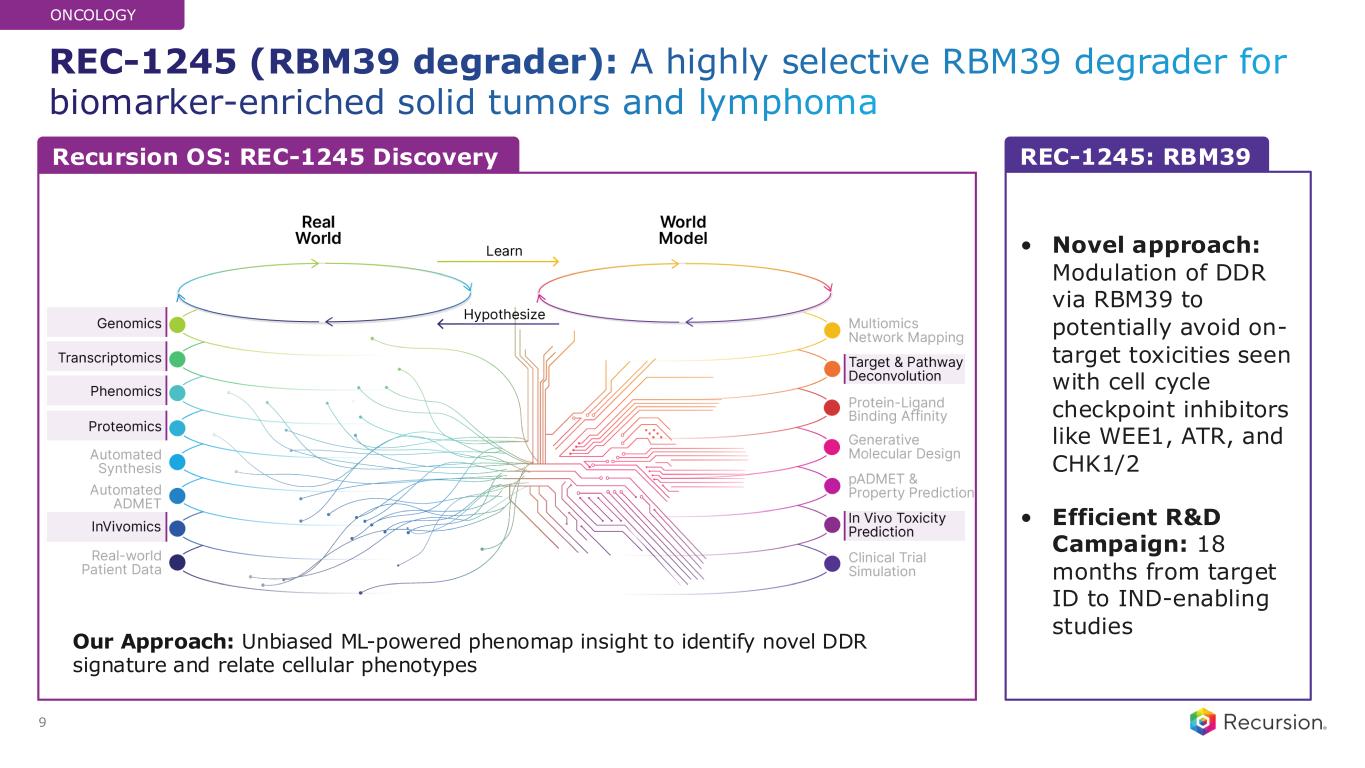 Program Status • Potential First-in-Class RBM39 degrader in solid tumors • First patient dosed in 4Q24 • Phase 1 monotherapy update on dose-escalation expected in 1H26 Mechanism of Action • Molecular glue that degrades RBM39 via E3 ligase adaptor DCAF15 • Disrupts RNA splicing to downregulate cell cycle checkpoints and DDR networks Thesis & Differentiation • RBM39 phenotypically mimics CDK12 and is distinct from CDK13 in Recursion OS • Novel approach to target DDR biology via RBM39 avoids on-target toxicities associated with cell cycle checkpoint inhibitors (e.g., CDK12, WEE1, ATR, ATM, PLK1) • Selective RBM39 degrader with minimal ITGA2 liability to limit thrombocytopenia Unmet Need1 • >100,000 patients with solid tumor or lymphoma experience disease progression while on frontline therapies • Potential to be used as a single agent or in combination with chemo/IO 40 1. Internal company estimates. Assumes US+EU5 addressable incidence with biomarker-enriched solid tumors and other select histologies. 2. Paul et al, Nat Rev Drug Discov (2010) Recursion Approach • Unbiased ML-aided genomics screen to identify biological signature and relate cellular phenotypes • Progressed REC-1245 from target biology to IND-Enabling studies in under 18 months (vs. 42 months in industry2) REC-1245: RBM39 Degrader A highly selective RBM39 degrader for Biomarker-Enriched Solid Tumors and Lymphoma
