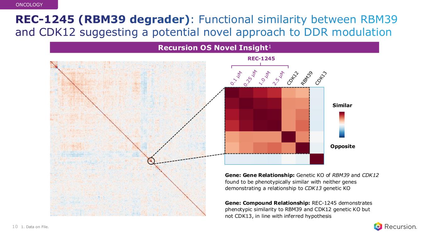 Similar Opposite Recursion OS Novel Insight1 Gene: Gene Relationship: Genetic KO of RBM39 and CDK12 found to be phenotypically similar with neither genes demonstrating a relationship to CDK13 genetic KO Gene: Compound Relationship: REC-1245 demonstrates phenotypic similarity to RBM39 and CDK12 genetic KO but not CDK13, in line with inferred hypothesis REC-1245 10 1. Data on File. ONCOLOGY REC-1245 (RBM39 degrader): Functional similarity between RBM39 and CDK12 suggesting a potential novel approach to DDR modulation