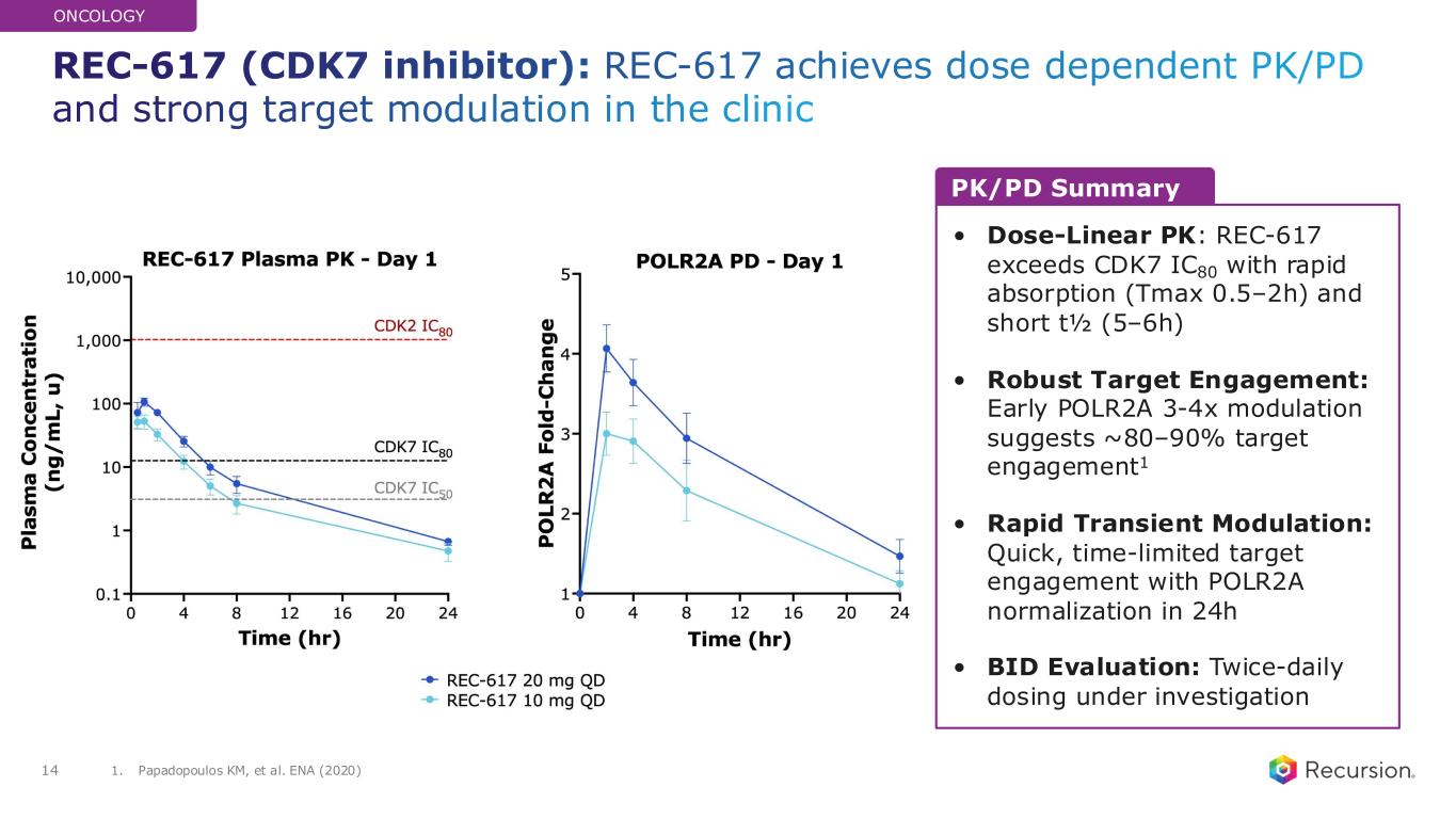 REC-617 (CDK7 inhibitor): first-in-human study in solid tumors enrolled a heterogenous and heavily pretreated population 2 mg QD (n=3) • Unresectable, locally recurrent, or metastatic cancer • Progressed following, or intolerant to, available standard of care treatments • ECOG PS 0-1 5 mg QD (n=4) 10 mg QD (n=7) 20 mg QD (n=3) 1 mg BID (n=2) Ongoing Phase 1 Design Ongoing Baseline Demographics • N=19 • Median of 4 prior lines of therapy in advanced setting • Heterogenous population, including: • Colorectal cancer • Breast cancer • Ovarian cancer • NSCLC • Pancreatic cancer Primary: • Monotherapy safety and recommended Phase 2 dose (RP2D) Key Secondary: • Pharmacokinetics Exploratory: • Preliminary antitumor activity (RECIST v1.1) • Pharmacodynamics: POLR2A gene expression in blood Endpoints ONCOLOGY 13