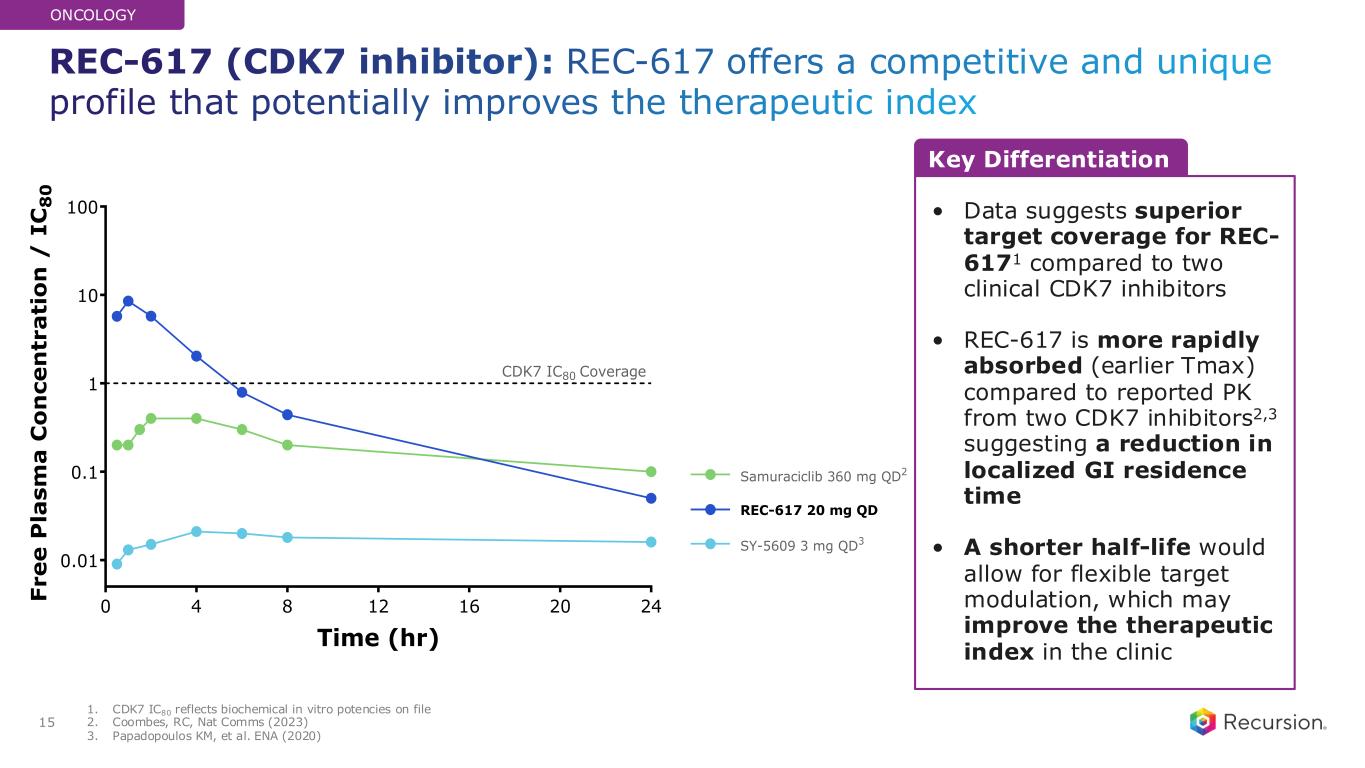 REC-617 (CDK7 inhibitor): REC-617 achieves dose dependent PK/PD and strong target modulation in the clinic 14 1. Papadopoulos KM, et al. ENA (2020) PK/PD Summary • Dose-Linear PK: REC-617 exceeds CDK7 IC80 with rapid absorption (Tmax 0.5–2h) and short t½ (5–6h) • Robust Target Engagement: Early POLR2A 3-4x modulation suggests ~80–90% target engagement1 • Rapid Transient Modulation: Quick, time-limited target engagement with POLR2A normalization in 24h • BID Evaluation: Twice-daily dosing under investigation ONCOLOGY