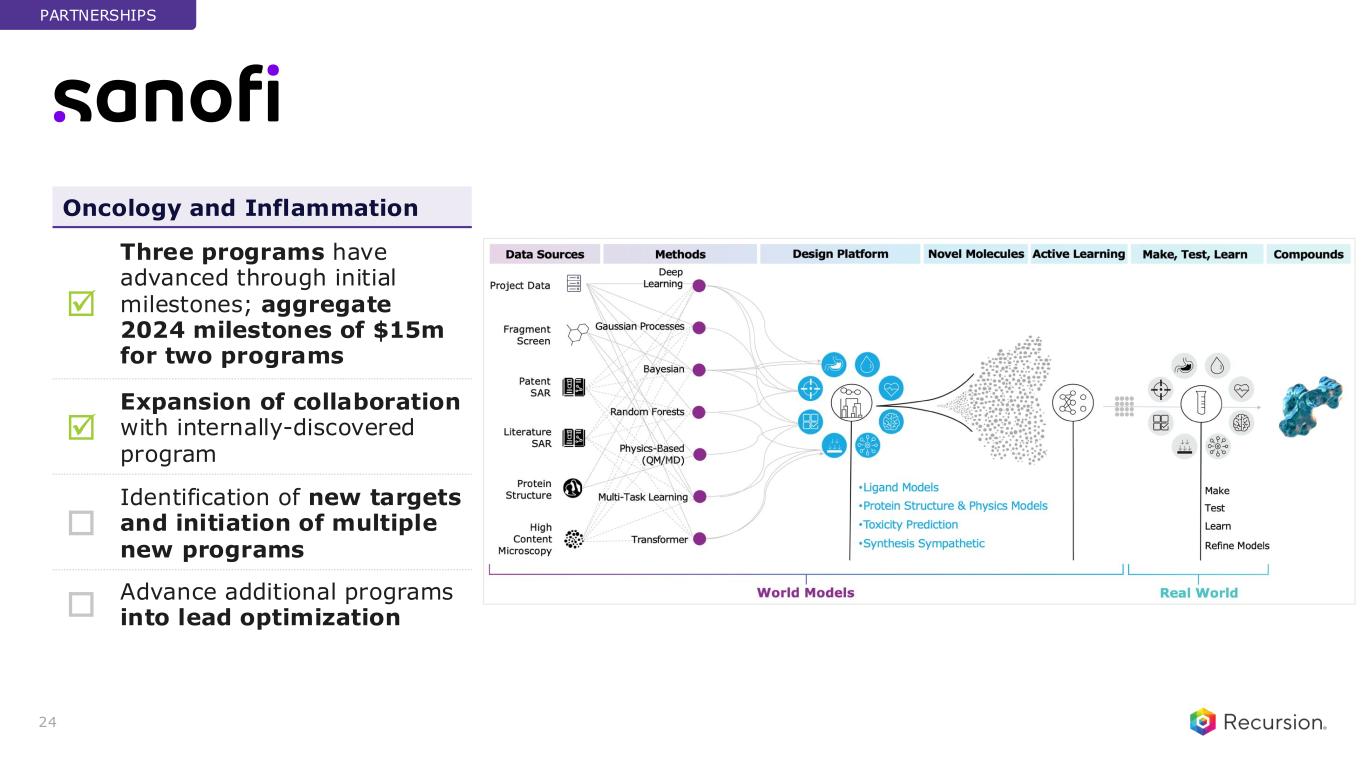 23 PARTNERSHIPS Multiple whole-genome phenomaps with chemical perturbations completed in disease relevant cell types First validated hit series now in hit-to-lead Additional near-term program options World's first neuro-specific whole- genome arrayed CRISPR KO phenomap optioned for $30M Target validation packages underway Additional neuroscience phenomap options Additional near-term program options GI Oncology Neuroscience Capture Data Query Maps Interrogate Biological Mechanisms Select cell type to profile 1 Pheno-map Transcripto-map Recursion to capture >17M images per cell type gRED to generate scRNA-seq data for whole genome CRISPR ● Validation ● Target Deconvolution ● Hit to Lead & Lead Op Pheno- transcripto map (neuro only) Expose cells to perturbations 2 Capture multi- modal data 3 Build (ML) and query maps 4 Target & drug discovery 5