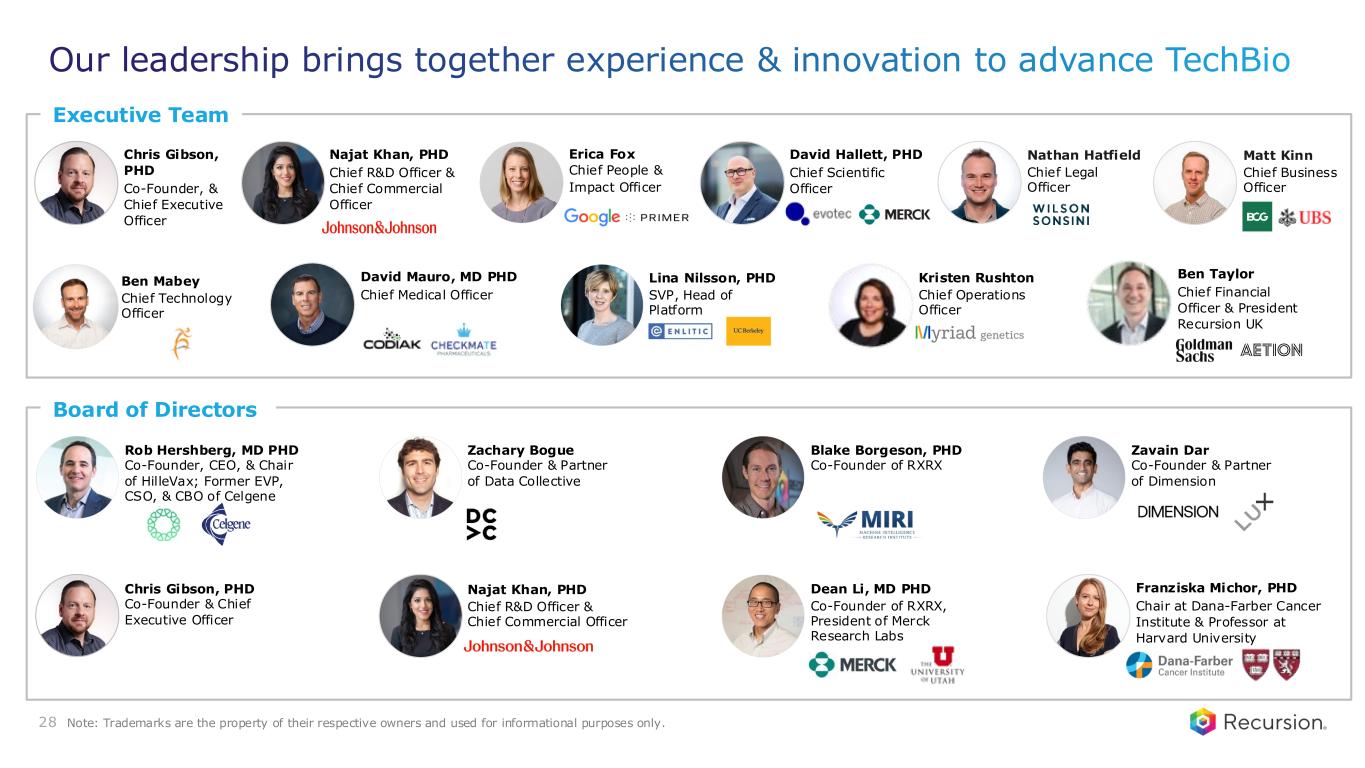 Board of Directors Dean Li, MD PHD Co-Founder of RXRX, President of Merck Research Labs Zavain Dar Co-Founder & Partner of Dimension Rob Hershberg, MD PHD Co-Founder, CEO, & Chair of HilleVax; Former EVP, CSO, & CBO of Celgene Zachary Bogue Co-Founder & Partner of Data Collective Najat Khan, PHD Chief R&D Officer & Chief Commercial Officer Franziska Michor, PHD Chair at Dana-Farber Cancer Institute & Professor at Harvard University Executive Team Ben Mabey Chief Technology Officer Kristen Rushton Chief Operations Officer David Mauro, MD PHD Chief Medical Officer Matt Kinn Chief Business Officer Najat Khan, PHD Chief R&D Officer & Chief Commercial Officer Erica Fox Chief People & Impact Officer David Hallett, PHD Chief Scientific Officer Lina Nilsson, PHD SVP, Head of Platform Blake Borgeson, PHD Co-Founder of RXRX Note: Trademarks are the property of their respective owners and used for informational purposes only.28 Chris Gibson, PHD Co-Founder, & Chief Executive Officer Chris Gibson, PHD Co-Founder & Chief Executive Officer Our leadership brings together experience & innovation to advance TechBio Ben Taylor Chief Financial Officer & President Recursion UK Nathan Hatfield Chief Legal Officer