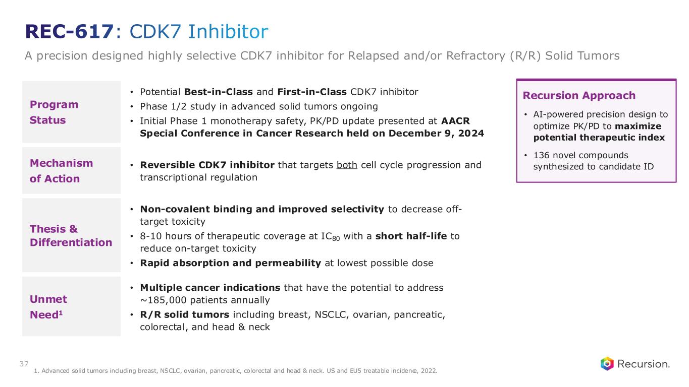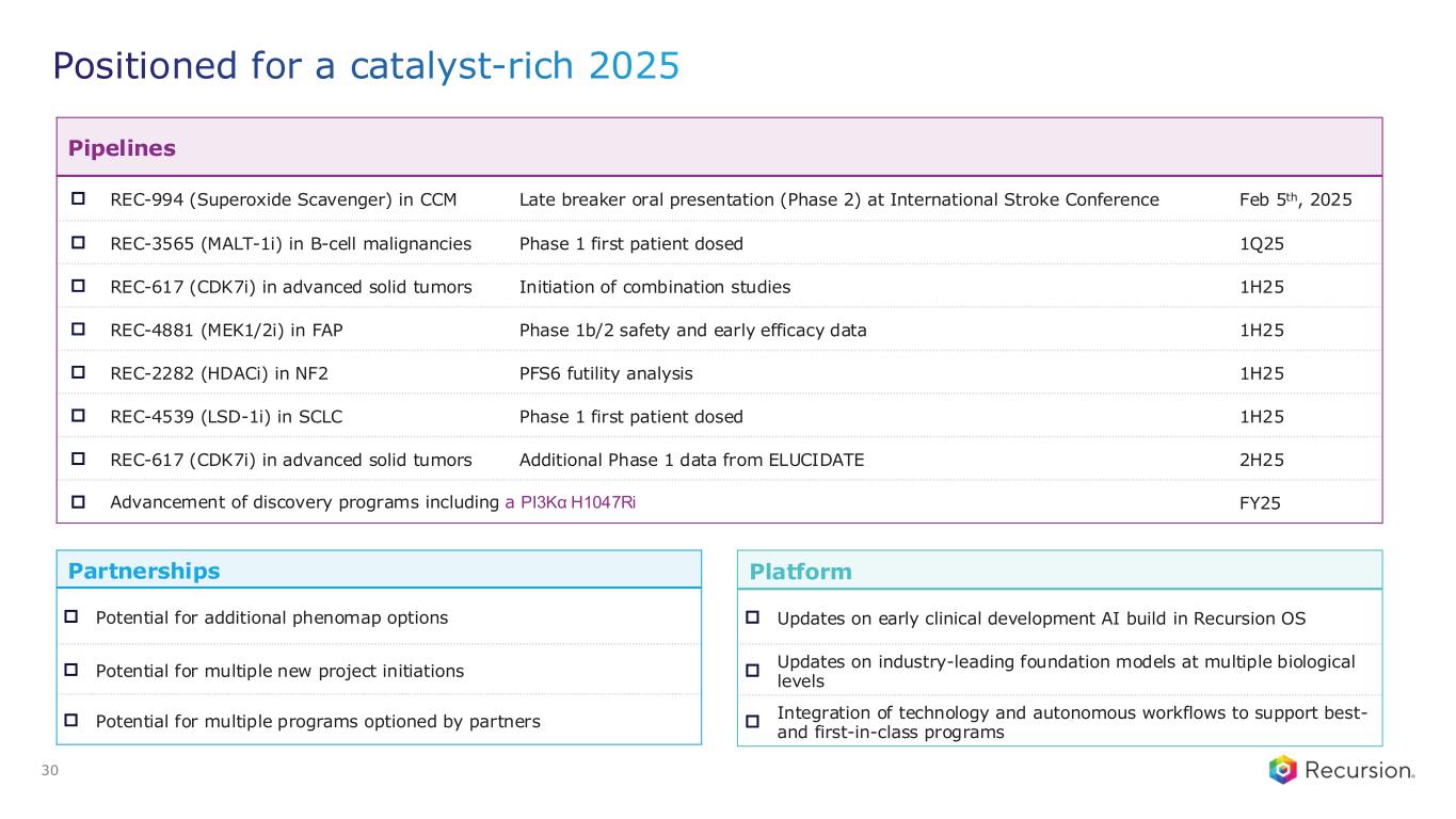 Positioned for a catalyst-rich 2025 30 Pipelines REC-994 (Superoxide Scavenger) in CCM Late breaker oral presentation (Phase 2) at International Stroke Conference Feb 5th, 2025 REC-3565 (MALT-1i) in B-cell malignancies Phase 1 first patient dosed 1Q25 REC-617 (CDK7i) in advanced solid tumors Initiation of combination studies 1H25 REC-4881 (MEK1/2i) in FAP Phase 1b/2 safety and early efficacy data 1H25 REC-2282 (HDACi) in NF2 PFS6 futility analysis 1H25 REC-4539 (LSD-1i) in SCLC Phase 1 first patient dosed 1H25 REC-617 (CDK7i) in advanced solid tumors Additional Phase 1 data from ELUCIDATE 2H25 Advancement of discovery programs including a PI3Kα H1047Ri FY25 Partnerships Potential for additional phenomap options Potential for multiple new project initiations Potential for multiple programs optioned by partners Platform Updates on early clinical development AI build in Recursion OS Updates on industry-leading foundation models at multiple biological levels Integration of technology and autonomous workflows to support best- and first-in-class programs