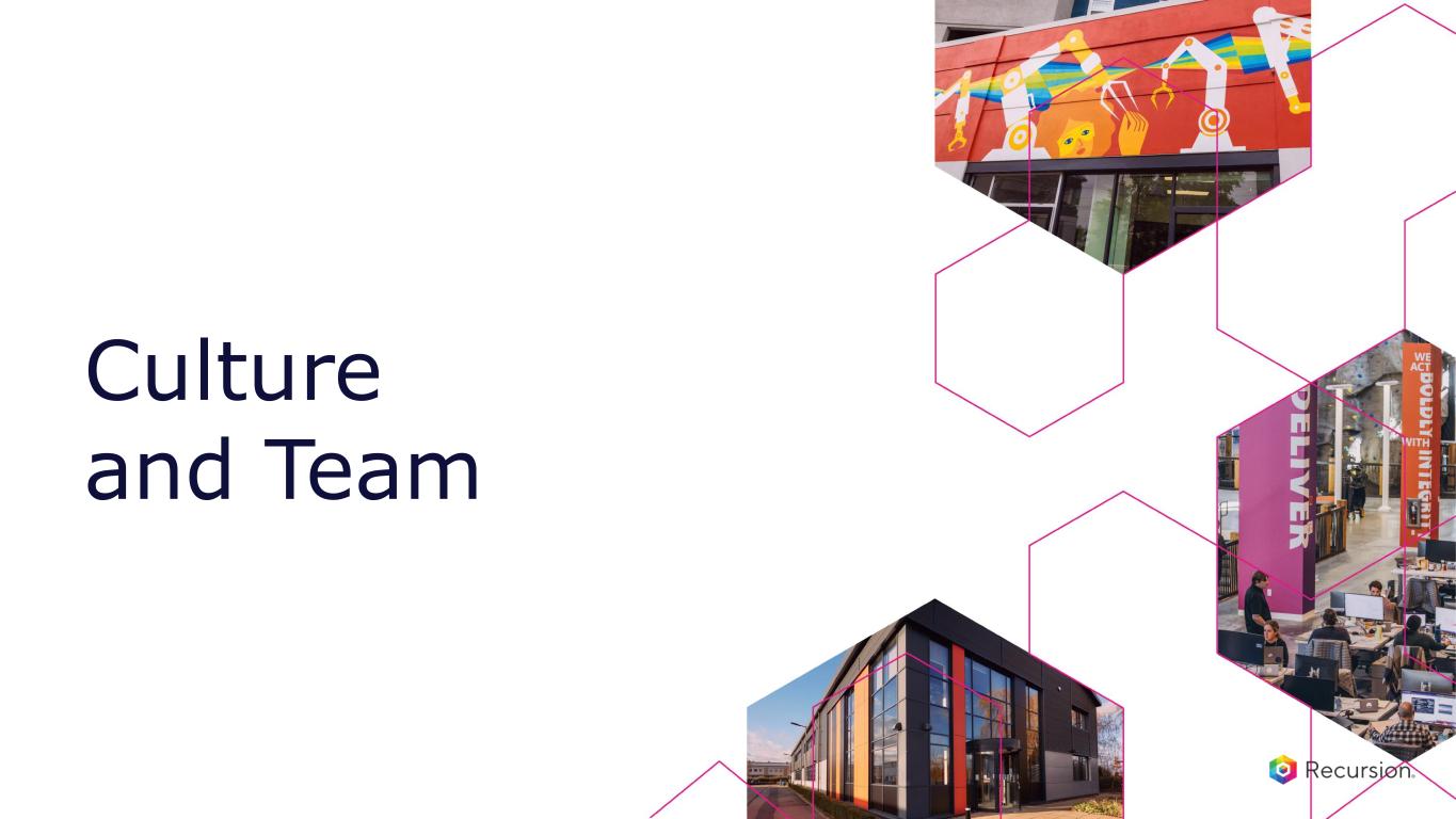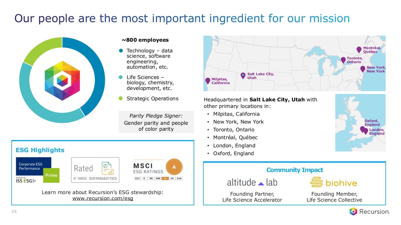 Parity Pledge Signer: Gender parity and people of color parity Technology – data science, software engineering, automation, etc. Life Sciences – biology, chemistry, development, etc. Strategic Operations ~800 employees Community Impact Founding Partner, Life Science Accelerator Founding Member, Life Science Collective ESG Highlights Learn more about Recursion’s ESG stewardship: www.recursion.com/esg Milpitas, California Salt Lake City, Utah Toronto, Ontario Montréal, Québec London, England Oxford, England New York, New York Headquartered in Salt Lake City, Utah with other primary locations in: • Milpitas, California • New York, New York • Toronto, Ontario • Montréal, Québec • London, England • Oxford, England 34 Our people are the most important ingredient for our mission