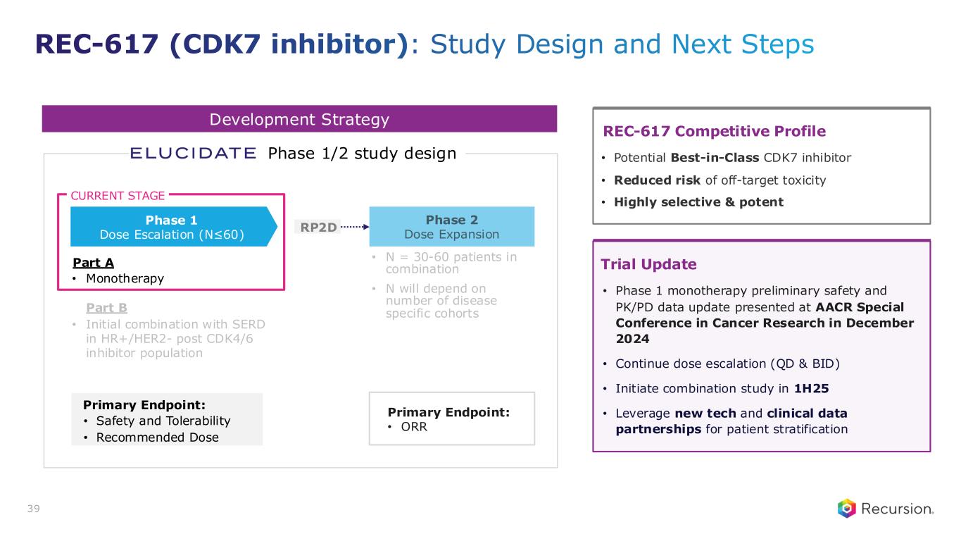 Assay DC Criteria Ph 1 Competitor Ph 1/2 Competitor REC-617 CDK7 IC50 (nM) <10 CDK family selectivity >100-fold HCC70 (breast cancer) IC50 (nM) <100 Caco-2 A2B (efflux) 10⁻⁶ cm/s >5 (<3) Predicted human half-life (hr) <15 Potent tumor regression with minimal IC80 exposureREC-617 has Best-in-Class potential1 Designed to avoid efflux transporter substrate to minimize GI adverse events Key Preclinical Data 38 1. Data on File. 2. Besnard et al, AACR (2022). 3. PK studies conducted in CD1 mice, single-dose administration. >10 hr IC80 results in significant body weight loss Meets or exceeds criteria Minor deviation Major deviation Development Candidate (DC) Criteria: • CDK7 IC50: green <10nM; yellow 10-30nM; red >30nM • CDK7 selectivity: green >100-fold; yellow 30-100-fold; red <30-fold • HCC70 IC50: green <100nM; yellow 100-500nM; red >500 nM • Caco-2 A2B (efflux): green >5(<3); yellow >1.5 (<10); red <1.5 (>30) • Half-life: green <15, yellow <24, red >24 • REC-617 demonstrates potent tumor regression with less than 10 hours of exposure above IC80 to optimize benefit-risk CDX Model: OVCAR32 Mouse PK3 REC-617: Robust antitumor activity demonstrated in disease relevant preclinical tumor models Initial clinical safety and PK/PD presented at AACR Special Congress in December 2024