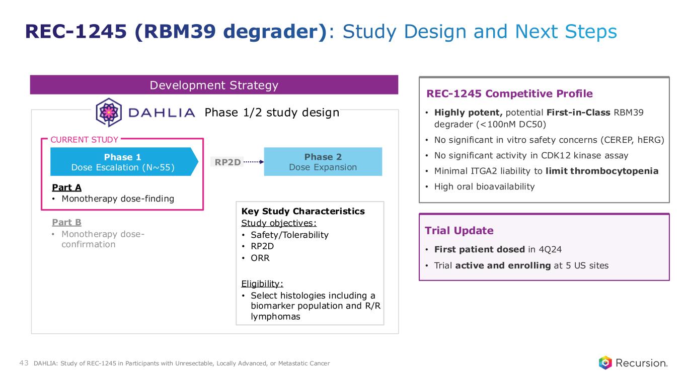 Key Preclinical Data1 REC-1245 is highly selective and potent1 Assay DC Criteria REC-1245 RBM39 Degradation DC50 <100 nM CDK12 Kinase No sig. activity CEREP Safety Panel No sig. activity hERG IC50 (µM) >30 Oral Bioavailability (%F) >30 REC-1245 has compelling efficacy and PK/PD in preclinical models 42 1. Data on File. 2. N=8 mice per group in TV portion. REC-1245 administered BID PO. 3. PD evaluated after 5 days BID oral of REC-1245 at doses noted ; N=3 mice per group in PD portion Meets or exceeds criteria Minor deviation Major deviation • REC-1245 shows significant monotherapy regressions • Dose-dependent antitumor activity correlates with PD CDX Model: OVK182 PD: Target Engagement3 REC-1245 (RBM39 degrader): Robust efficacy/PK/PD in biomarker-positive disease relevant preclinical tumor models – Phase 1 initiated in 4Q24