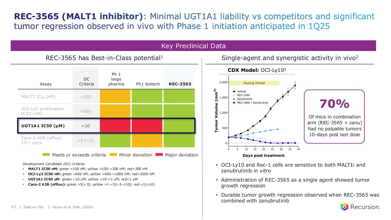 Program Status • Potential Best-in-Class MALT1 inhibitor • Phase 1 initiation in B-Cell Malignancies (e.g., chronic lymphocytic leukemia), expected 1Q25 Mechanism of Action • Reversible allosteric MALT1 inhibitor that can dampen NF-κB signaling • Selectively inhibits CLL proliferation with limited impact on T-Cell viability Thesis & Differentiation • Low UGT1A1 liability with potential for reduced risk of hyperbilirubinemia • Potential for reduced liver toxicity and enhanced efficacy in combination with BTK and BCL2 inhibitors • Low predicted human clearance and high oral bioavailability Unmet Need1 • Current monotherapy treatments in B-cell malignancies not curative and prone to resistance • ~41,000 patients with R/R B-cell malignancies (treatable in US and EU5) – targeting CLL combination therapy 44 *Formerly EXS73565. 1. Cerner Enviza Treatment Architecture Reports 2023, rounded to nearest 1,000 patients per year. Recursion Approach • AI powered precision- designed novel molecule using molecular dynamics and hotspot analysis • 344 novel compounds synthesized to candidate ID • Maintain selectivity and deliver a candidate with lower predicted safety risk in the clinic REC-3565*: MALT1 Inhibitor A precision designed selective MALT1 inhibitor for B-Cell Malignancies