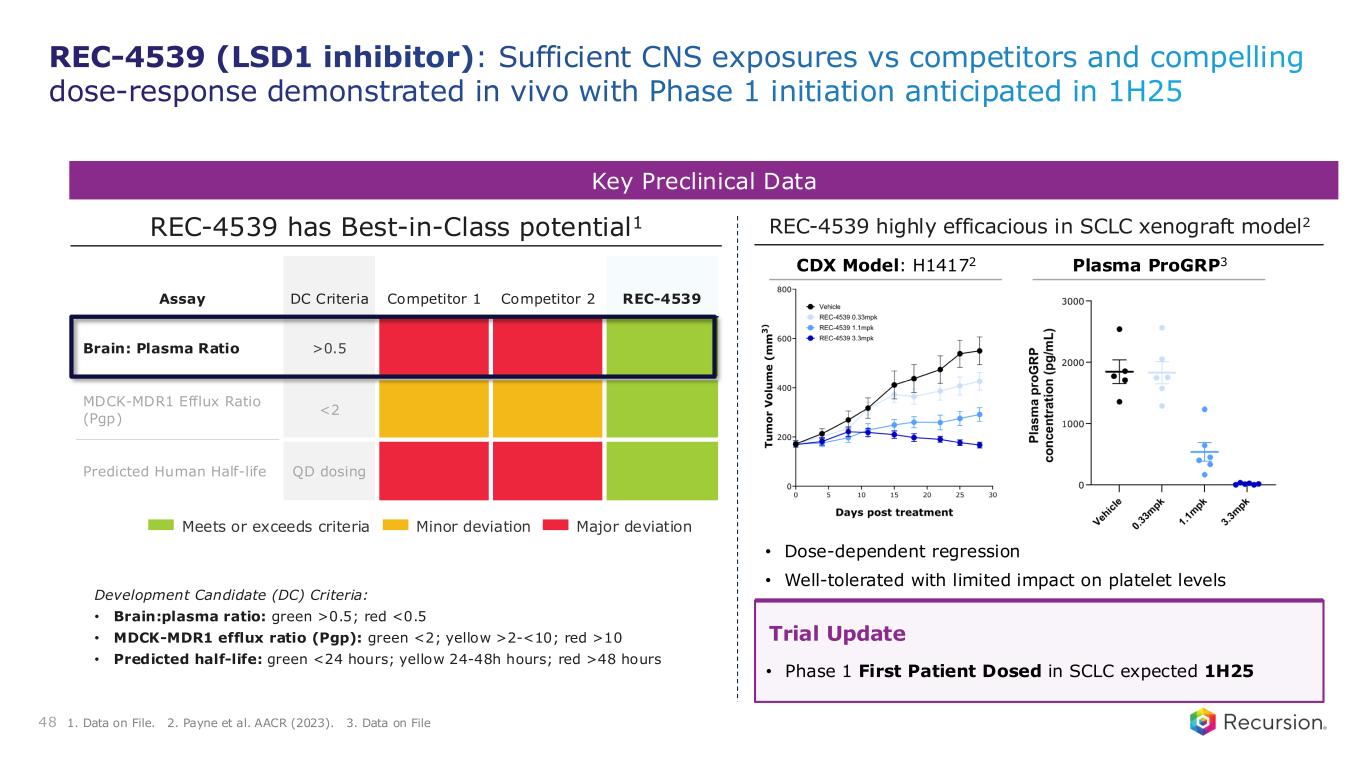 Program Status • Potential Best-in-Class LSD1 inhibitor • Phase 1 initiation in SCLC expected 1H25 Mechanism of Action • Reversible LSD1 inhibitor that can selectively upregulate NOTCH signaling • Promotes differentiation of neuroendocrine cancer cells • Impairs DNA repair pathways sensitizing SCLC cells to immune checkpoint inhibitors Thesis & Differentiation • LSD1 inhibitor designed to be reversible and brain penetrant • Shorter-predicted half life versus competitors to manage on-target toxicity • Highly selective to reduce off-target toxicity • Preclinical data shows therapeutic exposures have minimal effects on platelets, suggesting potential reduced risk of thrombocytopenia Unmet Need1 • >45,000 patients with treatable Stage III/IV SCLC • Limited treatment options post progression on frontline therapies 47 1. EvaluatePharma Epidemiology 2023 (US and EU5) Recursion Approach • Precision design using active learning to select most information rich compounds • 414 novel compounds synthesized to candidate ID • Used multiparameter optimization to design a unique candidate combining reversibility with CNS penetration REC-4539: LSD1 Inhibitor A precision designed unique LSD1 inhibitor with CNS penetrance