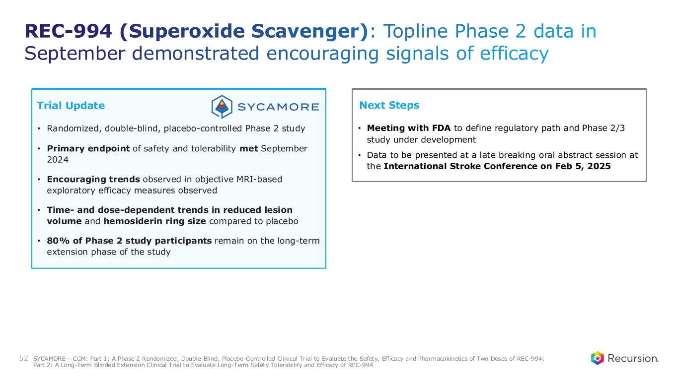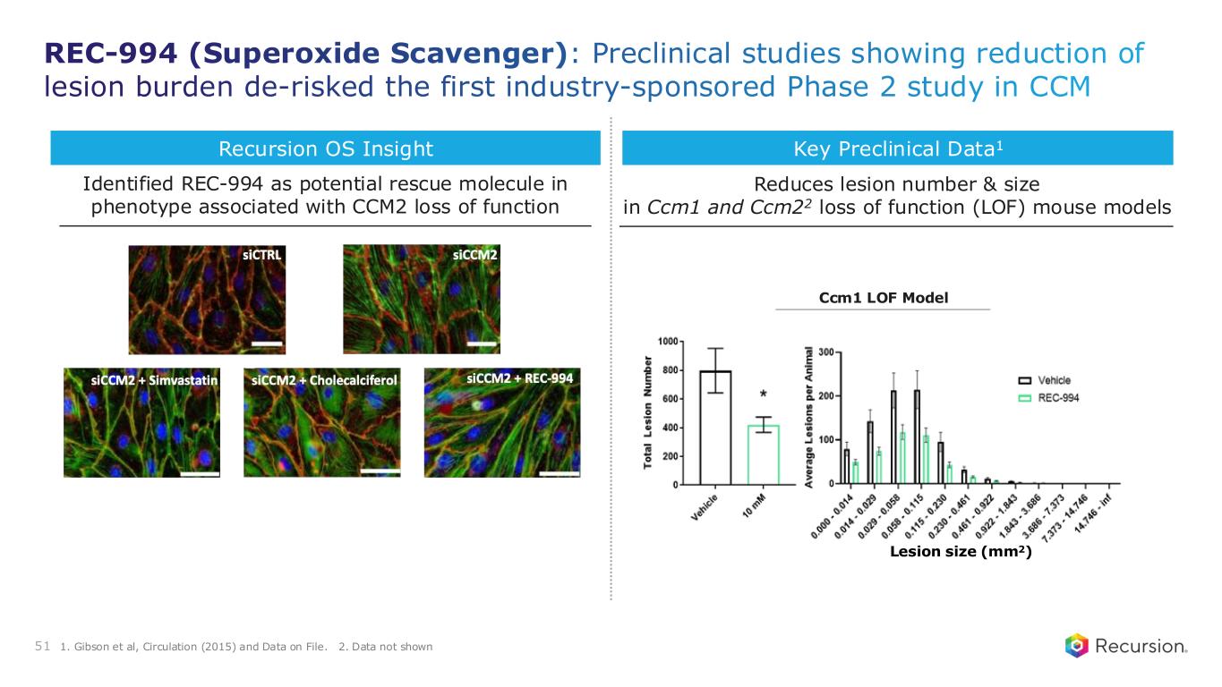 Program Status • First therapeutic candidate advanced to an industry-sponsored Phase 2 trial • Phase 2 primary endpoint of safety met with similar AE profile across arms • Meeting with FDA anticipated in 2H25 to discuss plans for additional clinical study Mechanism of Action • Selective, orally bioavailable, redox-cycling nitroxide • Promotes the metabolism of ROS to reduce oxidative stress within cells • Stabilizes endothelial barrier function Thesis & Differentiation • Develop the first oral therapy for the treatment of symptomatic CCM • Target the underlying genetic mechanisms that drive the disease pathophysiology of CCM Unmet Need1 • ~360,000 symptomatic CCM patients with no approved therapies – ~63,000 patients harboring brainstem lesions and elevated bleeding risk – ~36,000 patients with cavernoma-related epilepsy2,3 50 1. Prevalence for hereditary and sporadic symptomatic population, Internal company estimates. 2. Smith ER. N Engl J Med (2024). 3. Horne MA, et al. Lancet Neuro, (2016). Recursion Approach • Unbiased ML-aided phenotypic drug screen to identify effective therapeutics driving CCM • In vivo POC demonstrated lesion reductions that were also observed in the Ph2 trial REC-994: Superoxide Scavenger A safe and well tolerated superoxide scavenger for the treatment of Cerebral Cavernous Malformation (CCM)