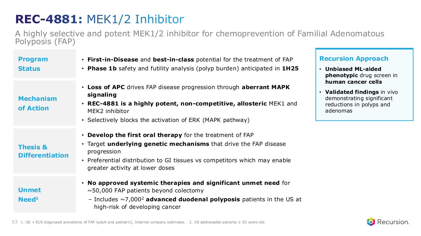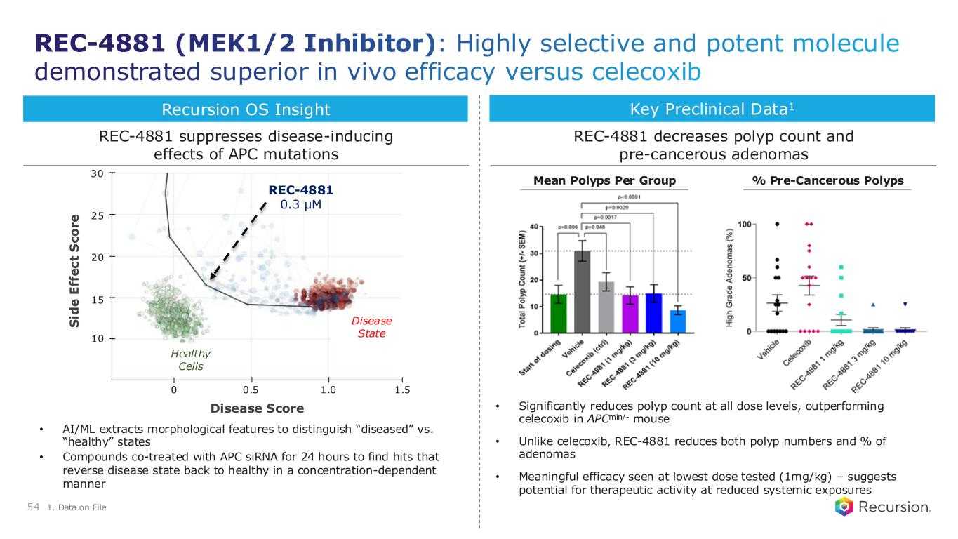 Program Status • First-in-Disease and best-in-class potential for the treatment of FAP • Phase 1b safety and futility analysis (polyp burden) anticipated in 1H25 Mechanism of Action • Loss of APC drives FAP disease progression through aberrant MAPK signaling • REC-4881 is a highly potent, non-competitive, allosteric MEK1 and MEK2 inhibitor • Selectively blocks the activation of ERK (MAPK pathway) Thesis & Differentiation • Develop the first oral therapy for the treatment of FAP • Target underlying genetic mechanisms that drive the FAP disease progression • Preferential distribution to GI tissues vs competitors which may enable greater activity at lower doses Unmet Need1 • No approved systemic therapies and significant unmet need for ~50,000 FAP patients beyond colectomy – Includes ~7,0002 advanced duodenal polyposis patients in the US at high-risk of developing cancer 53 1. US + EU5 diagnosed prevalence of FAP (adult and pediatric), Internal company estimates. 2. US addressable patients ≥ 55 years old. Recursion Approach • Unbiased ML-aided phenotypic drug screen in human cancer cells • Validated findings in vivo demonstrating significant reductions in polyps and adenomas REC-4881: MEK1/2 Inhibitor A highly selective and potent MEK1/2 inhibitor for chemoprevention of Familial Adenomatous Polyposis (FAP)