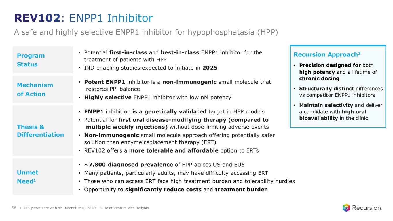 Program Status • Potential first-in-class and best-in-class ENPP1 inhibitor for the treatment of patients with HPP • IND enabling studies expected to initiate in 2025 Mechanism of Action • Potent ENPP1 inhibitor is a non-immunogenic small molecule that restores PPi balance • Highly selective ENPP1 inhibitor with low nM potency Thesis & Differentiation • ENPP1 inhibition is a genetically validated target in HPP models • Potential for first oral disease-modifying therapy (compared to multiple weekly injections) without dose-limiting adverse events • Non-immunogenic small molecule approach offering potentially safer solution than enzyme replacement therapy (ERT) • REV102 offers a more tolerable and affordable option to ERTs Unmet Need1 • ~7,800 diagnosed prevalence of HPP across US and EU5 • Many patients, particularly adults, may have difficulty accessing ERT • Those who can access ERT face high treatment burden and tolerability hurdles • Opportunity to significantly reduce costs and treatment burden 56 1. HPP prevalence at birth. Mornet et al, 2020. 2. Joint Venture with Rallybio Recursion Approach2 • Precision designed for both high potency and a lifetime of chronic dosing • Structurally distinct differences vs competitor ENPP1 inhibitors • Maintain selectivity and deliver a candidate with high oral bioavailability in the clinic REV102: ENPP1 Inhibitor A safe and highly selective ENPP1 inhibitor for hypophosphatasia (HPP)