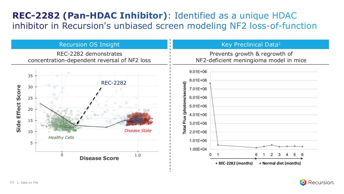 Program Status • Potential first-in-disease and best-in-class therapy for NF2 mutant meningioma • Data maturing with PFS6 results expected 1H25 Mechanism of Action • Orally bioavailable, CNS penetrant, and potent pan-HDAC inhibitor • Loss of Merlin (NF2) leads to PI3K signaling and meningioma proliferation REC-2282 indirectly facilitates AKT dephosphorylation by disrupting the PP1-HDAC interaction Thesis & Differentiation • Develop the first therapeutic for NF2 meningioma • Highly selective molecule with favorable brain exposure and reduced risk of cardiac toxicity Unmet Need1 • No approved therapy for ~33,000 NF2 meningioma patients beyond surgery • Surgery only feasible in a limited number of patients and carries high rate of recurrence2 58 1. US + EU5 treatable incidence for all NF2-driven meningiomas. 2. Rogers et al. J Neurosurg, (2015) Recursion Approach • Unbiased ML-aided phenomap insight and drug screen in human cells • Identify effective therapeutics that rescue disease-inducing effects of NF2 loss REC-2282: Pan-HDAC Inhibitor CNS-penetrating pan-HDAC inhibitor for the first oral therapeutic to treat Neurofibromatosis Type 2 (NF2)