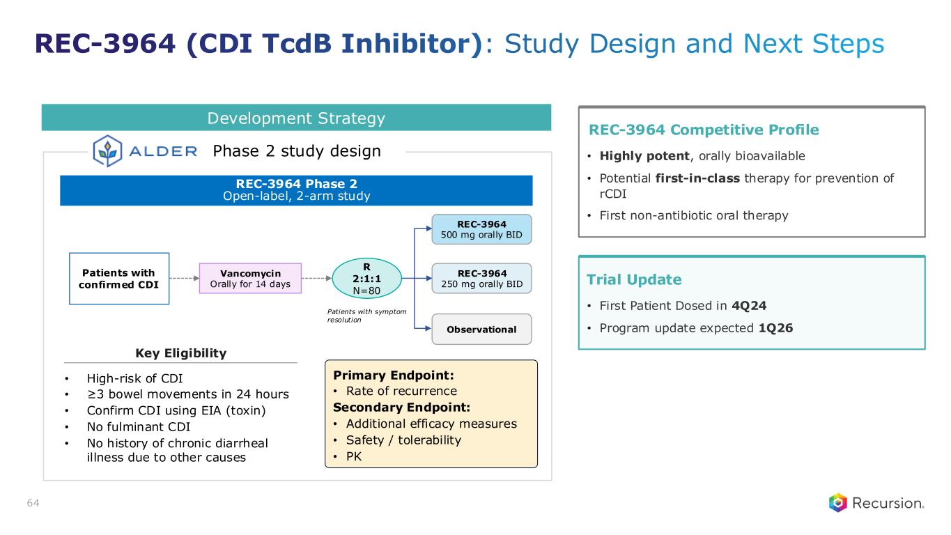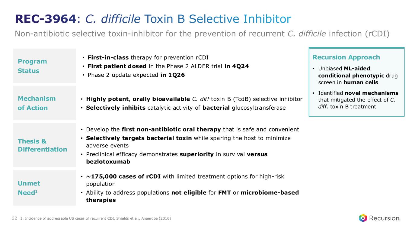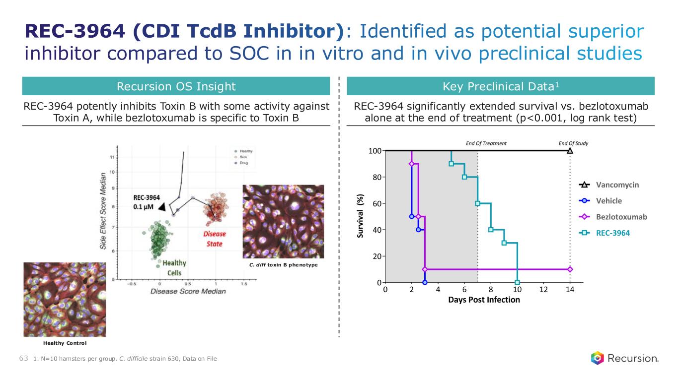 Program Status • First-in-class therapy for prevention rCDI • First patient dosed in the Phase 2 ALDER trial in 4Q24 • Phase 2 update expected in 1Q26 Mechanism of Action • Highly potent, orally bioavailable C. diff toxin B (TcdB) selective inhibitor • Selectively inhibits catalytic activity of bacterial glucosyltransferase Thesis & Differentiation • Develop the first non-antibiotic oral therapy that is safe and convenient • Selectively targets bacterial toxin while sparing the host to minimize adverse events • Preclinical efficacy demonstrates superiority in survival versus bezlotoxumab Unmet Need1 • ~175,000 cases of rCDI with limited treatment options for high-risk population • Ability to address populations not eligible for FMT or microbiome-based therapies 62 Recursion Approach • Unbiased ML-aided conditional phenotypic drug screen in human cells • Identified novel mechanisms that mitigated the effect of C. diff. toxin B treatment 1. Incidence of addressable US cases of recurrent CDI, Shields et al., Anaerobe (2016) REC-3964: C. difficile Toxin B Selective Inhibitor Non-antibiotic selective toxin-inhibitor for the prevention of recurrent C. difficile infection (rCDI)