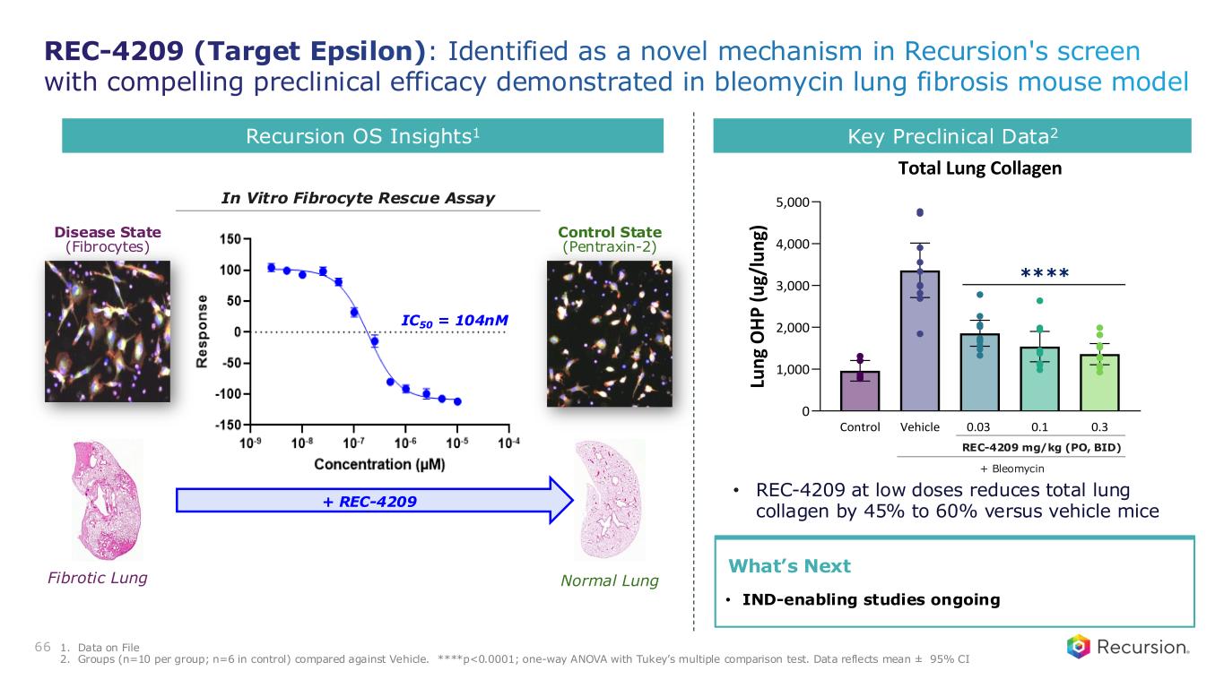Program Status • First-in-class therapeutic for treatment of IPF • IND enabling studies ongoing Mechanism of Action • Reversible, orally bioavailable, and potent Target Epsilon inhibitor • Promotes tissue repair and reverses fibrosis by potentially modulating TGF-ß Thesis & Differentiation • Develop a novel preferred treatment option that is safe and well-tolerated • In vitro models suggest capability of reversing the fibrotic process driving IPF progression Unmet Need1 • ~130,000 patients with IPF in the US • Approved therapies show modest slowing of IPF progression • No improvement in survival (mOS 3-5 years) or quality of life with current treatments 65 Recursion Approach • Unbiased ML-powered phenomap drug screen in human cells • Identify novel mechanisms that reversed the differentiation of fibrocytes 1. Global Data, Internal company estimates on IPF prevalence, Collard et al., Chest (2014) REC-4209: Target Epsilon Highly potent and potential First-in-Class medicine for the treatment of Idiopathic Pulmonary Fibrosis (IPF)