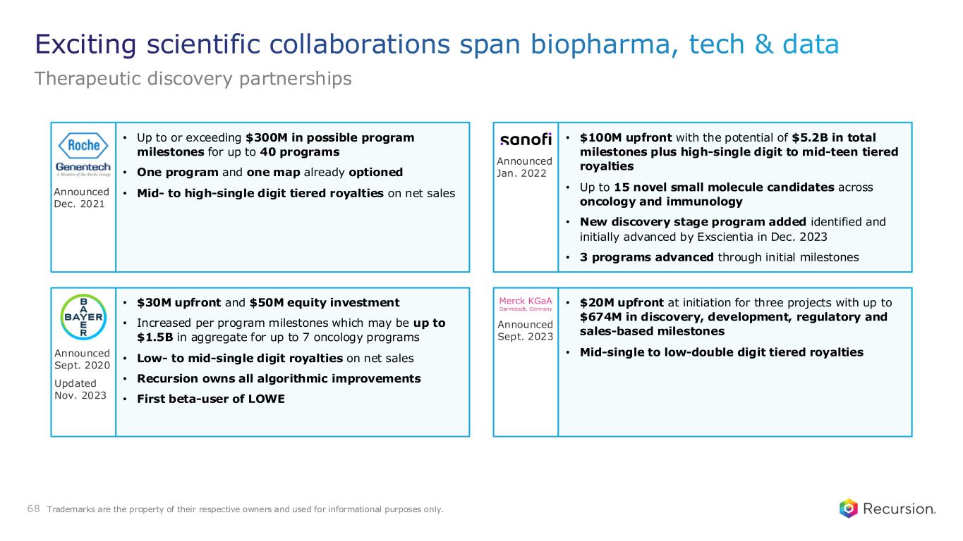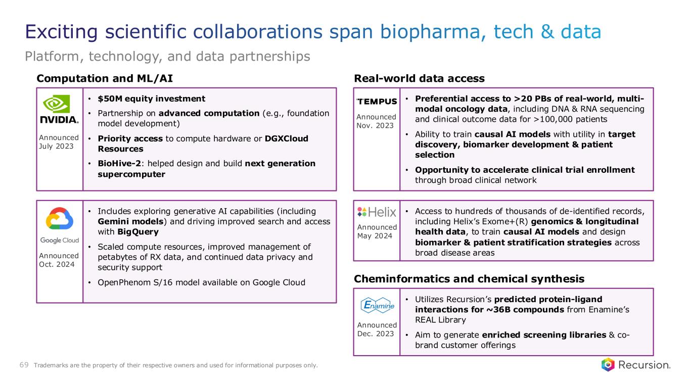 68 Trademarks are the property of their respective owners and used for informational purposes only. • Up to or exceeding $300M in possible program milestones for up to 40 programs • One program and one map already optioned • Mid- to high-single digit tiered royalties on net sales • $30M upfront and $50M equity investment • Increased per program milestones which may be up to $1.5B in aggregate for up to 7 oncology programs • Low- to mid-single digit royalties on net sales • Recursion owns all algorithmic improvements • First beta-user of LOWE • $100M upfront with the potential of $5.2B in total milestones plus high-single digit to mid-teen tiered royalties • Up to 15 novel small molecule candidates across oncology and immunology • New discovery stage program added identified and initially advanced by Exscientia in Dec. 2023 • 3 programs advanced through initial milestones • $20M upfront at initiation for three projects with up to $674M in discovery, development, regulatory and sales-based milestones • Mid-single to low-double digit tiered royalties Announced Dec. 2021 Announced Jan. 2022 Announced Sept. 2023 Announced Sept. 2020 Updated Nov. 2023 Exciting scientific collaborations span biopharma, tech & data Therapeutic discovery partnerships