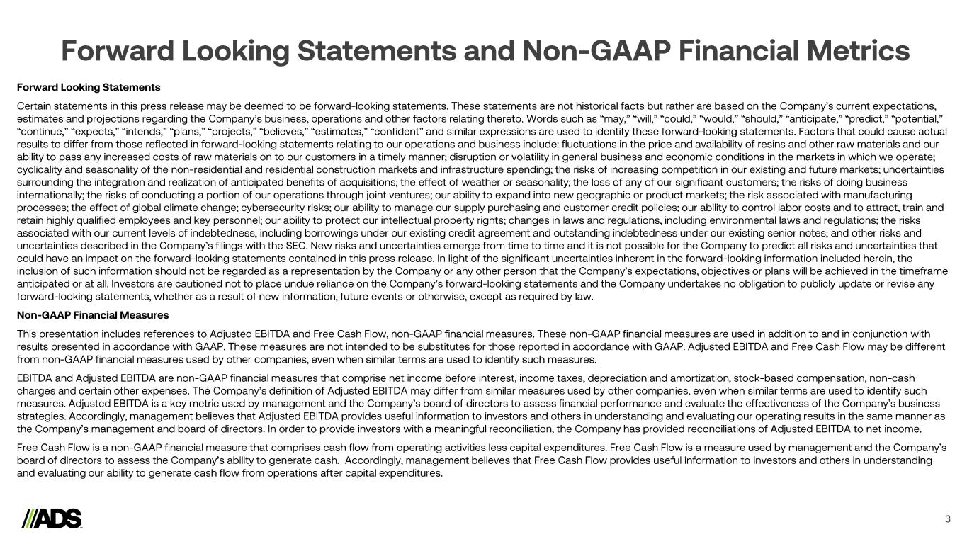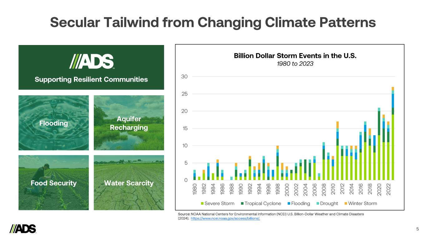 より広い意味で、私たちの成功は、水を保護し管理するための高度で持続可能な水管理ソリューションを提供する純粋な水企業としてのADSの位置づけによってもたらされ続けるでしょう。気候パターンが変化する中、ADSとインフィルトレーターのソリューションは、地域社会の保護に重要な役割を果たしています。2023年には、米国で推定880億ドルの損害を与えた27件の大規模な暴風雨が発生しました。これらの暴風雨は、激しい暴風雨や熱帯低気圧から洪水や干ばつに至るまで、地域社会に壊滅的な影響を及ぼし、既存の雨水インフラが気候に関する課題の増加に追いついていないことを浮き彫りにしています。私たちが提供する製品とソリューション、そして北米全域の地域レベルにおける専門知識は、地域社会が抱えるこれらの問題を解決し、ADSに長期的な成長をもたらす鍵となります。