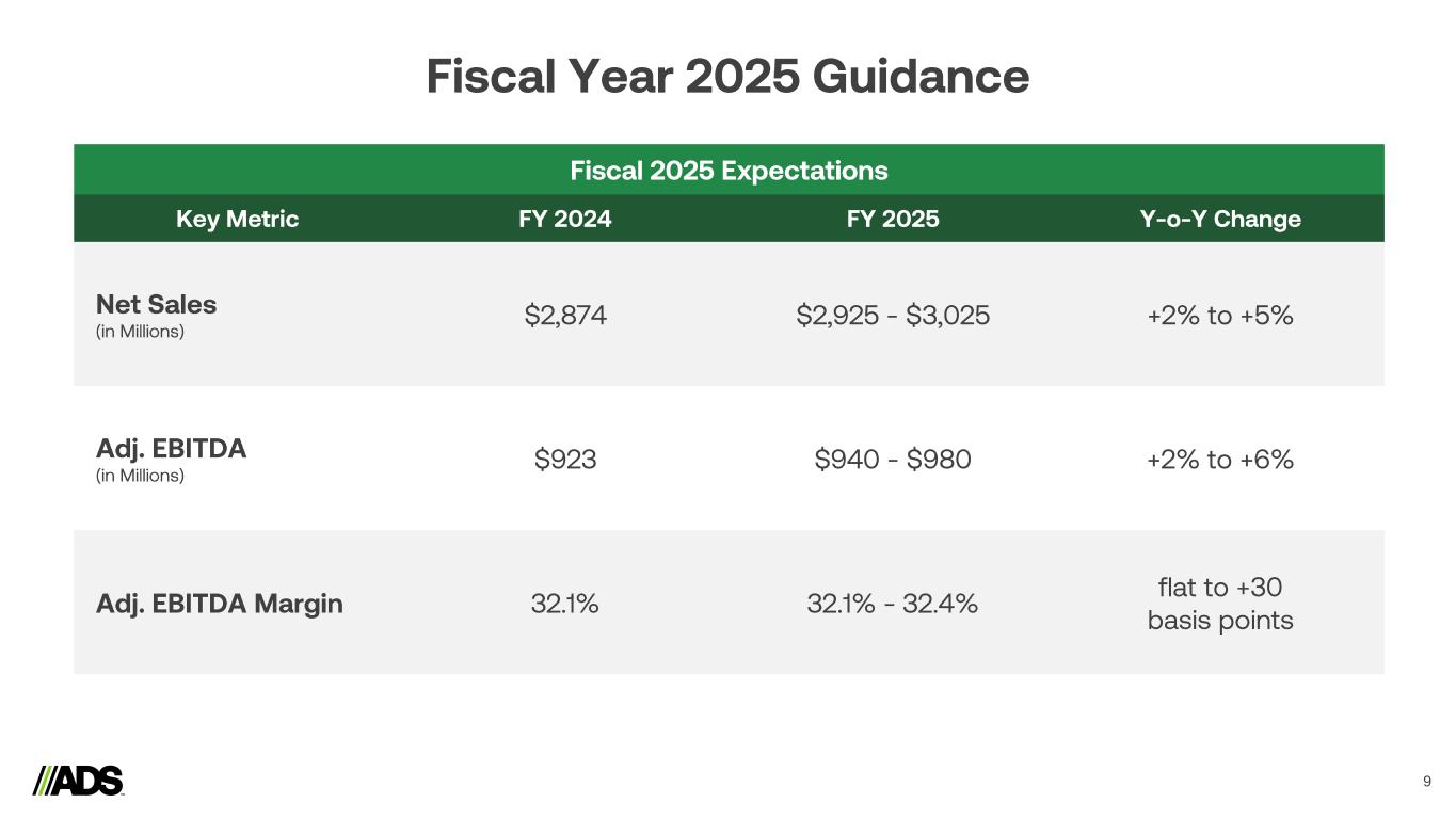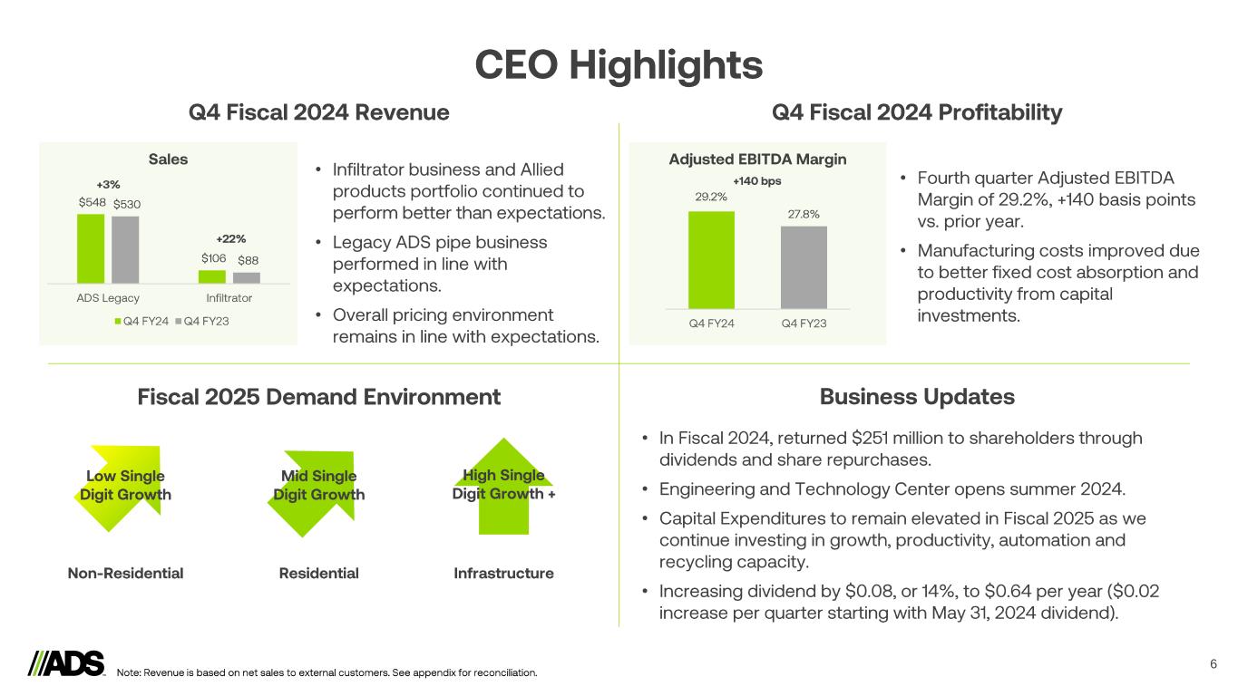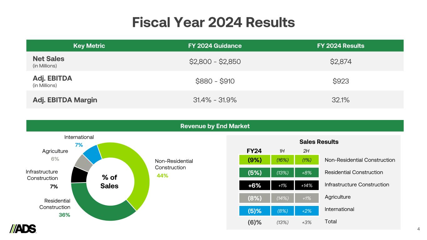 ADSの社長兼最高経営責任者(CEO)であるスコット・バーバーは、「2024年度はADSにとって9年連続で記録的な収益性を達成することができました。調整後EBITDAは、価格/コストの効果的な管理と強力な業務遂行により、2%増の9億2,300万ドルとなりました。また、調整後EBITDAマージンは270bp増の32.1%となり、当社史上最高の年間利益率となりました。上半期の需要低迷が売上高を6%減の29億ドルに押し下げたことを考えれば、当期の収益性結果は特に印象的である。私たちは今年の業績を誇りに思うと同時に、雨水および現場浄化槽廃水業界を発展させるため、市場を上回る業績を達成することに引き続き全力を尽くします。高度に設計されたソリューションに重点を置く当社は、世界で最も貴重な資源である水の管理を成功させる上で、極めて重要なプレーヤーとしての地位を確立しています。