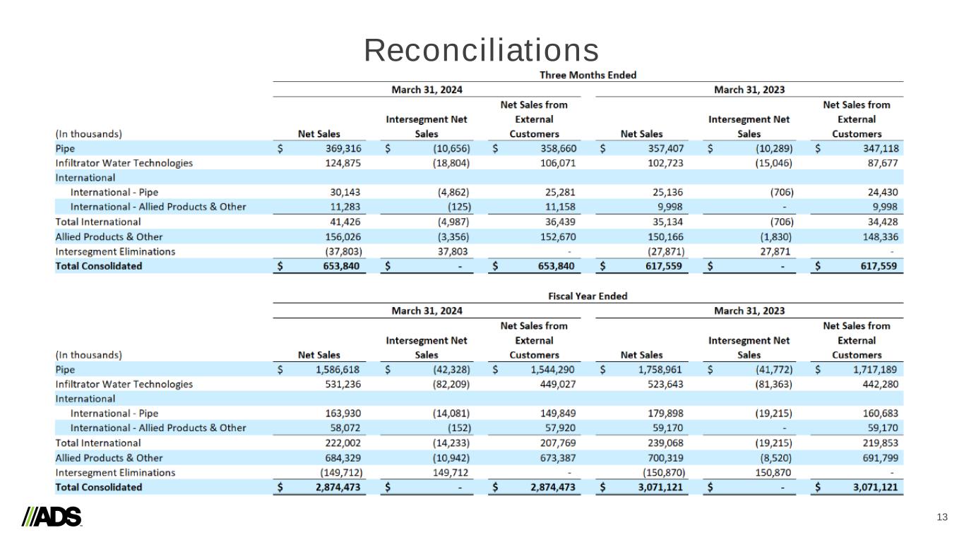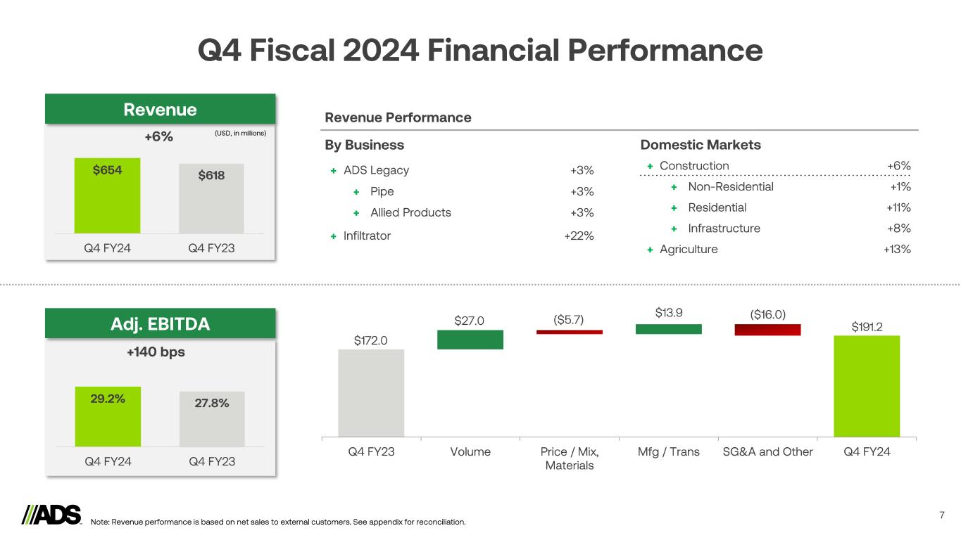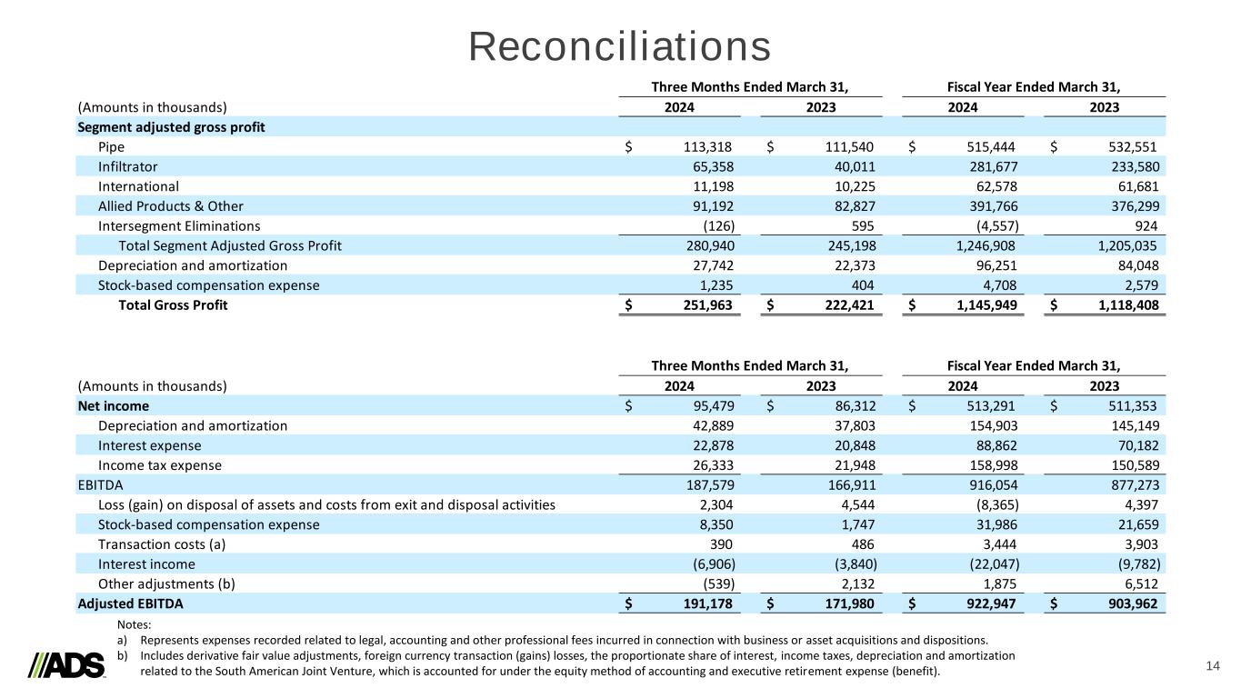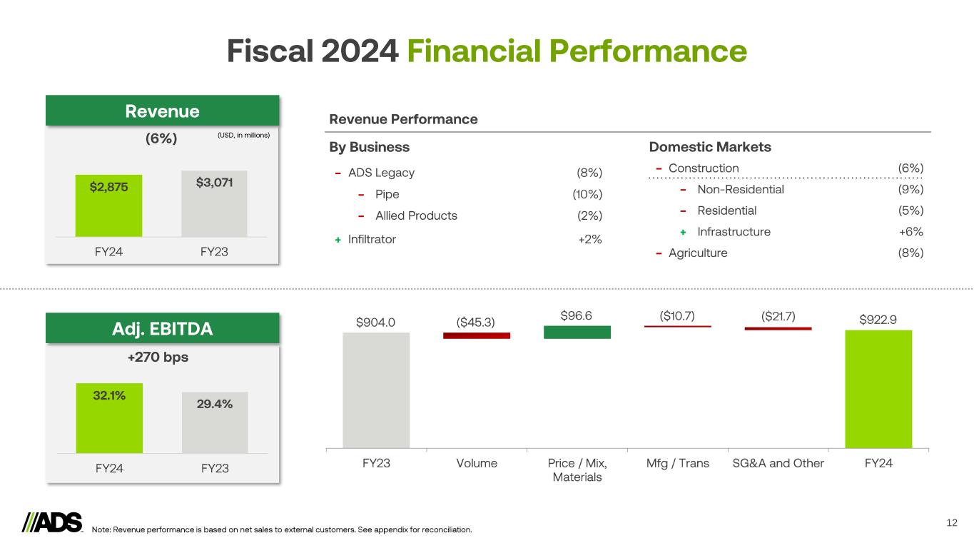 オハイオ州ヒリアード - (2024年5月16日) - 雨水および現場浄化槽廃水業界における革新的な水管理ソリューションのリーディングプロバイダーであるアドバンスト・ドレナージ・システムズ社(NYSE: WMS)(以下「ADS」または「当社」)は本日、2024年3月31日を期末とする第4四半期および会計年度の業績を発表した。