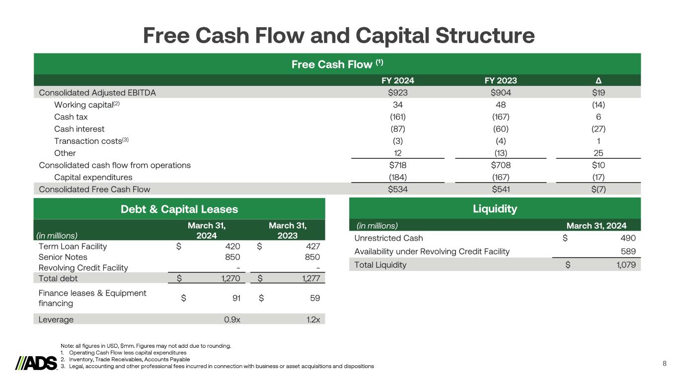ADSの総流動性は10億7,900万ドルで、2024年3月31日現在の現金4億9,020万ドルと、コミットメント・クレジット枠5億8,890万ドルで構成されている。2024年3月31日現在のレバレッジ比率は0.9倍であった。