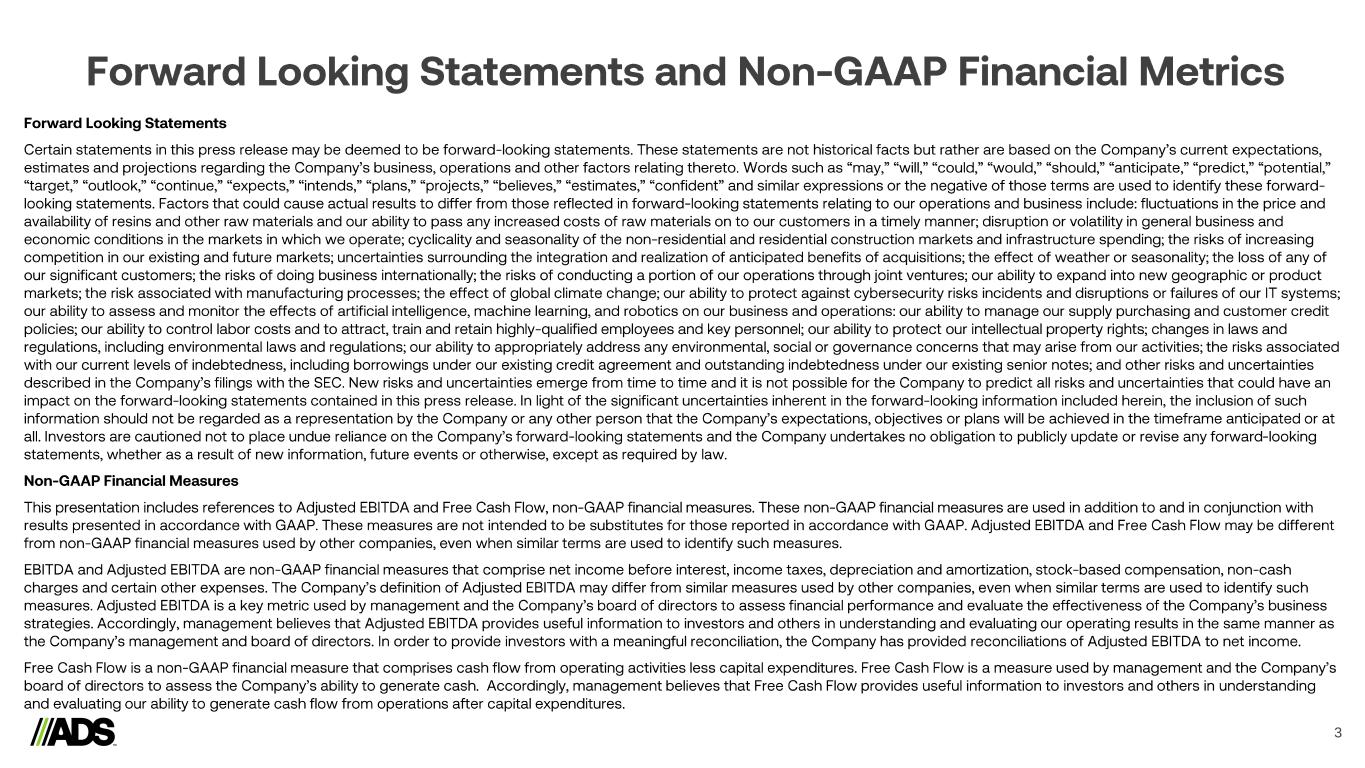 Advanced Drainage Systems is a leading manufacturer of innovative stormwater and onsite wastewater solutions that manage the world’s most precious resource: water. ADS and its subsidiary, Infiltrator Water Technologies, provide superior stormwater drainage and onsite wastewater products used in a wide variety of markets and applications including commercial, residential, infrastructure and agriculture, while delivering unparalleled customer service. ADS manages the industry’s largest company-owned fleet, an expansive sales team, and a vast manufacturing network of approximately 64 manufacturing plants and 35 distribution centers. The company is one of the largest plastic recycling companies in North America, ensuring over half a billion pounds of plastic is kept out of landfills every year. Founded in 1966, ADS’ water management solutions are designed to last for decades. To learn more, visit the Company’s website at www.adspipe.com.