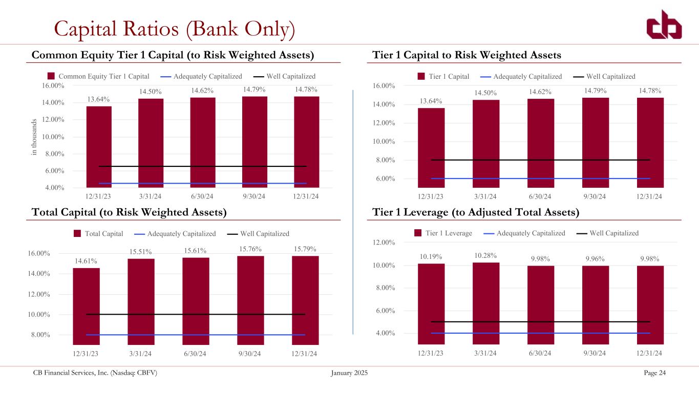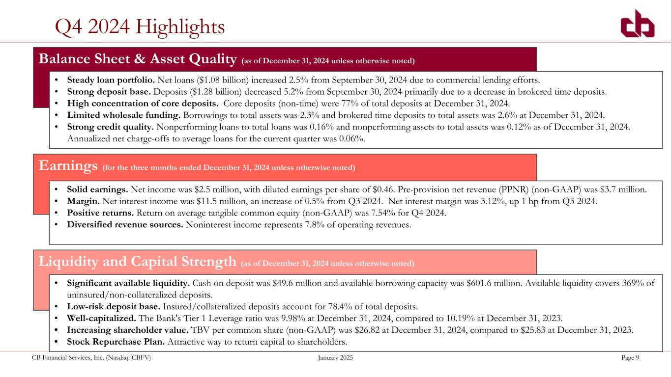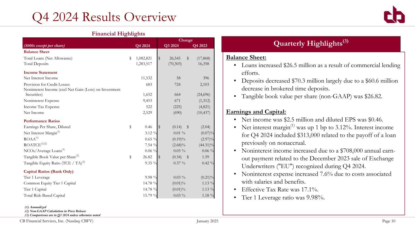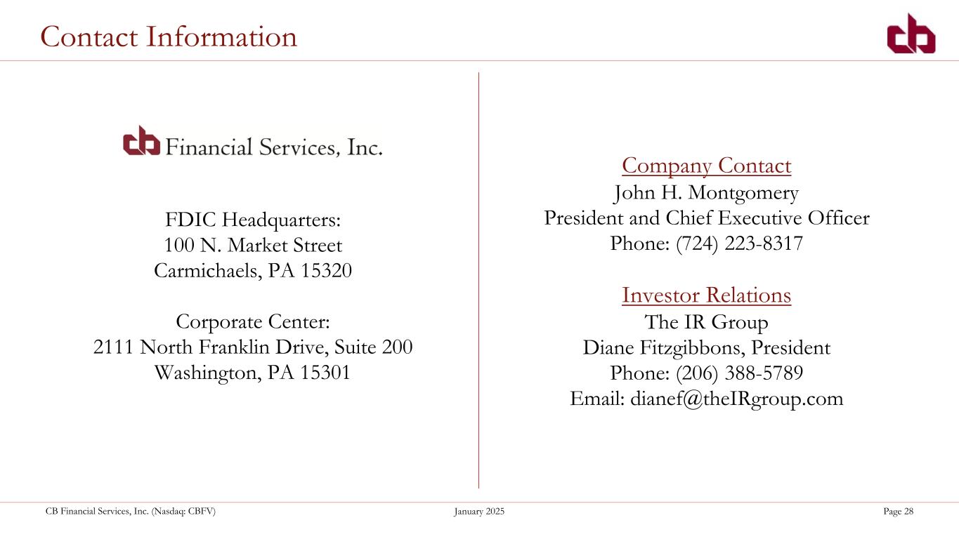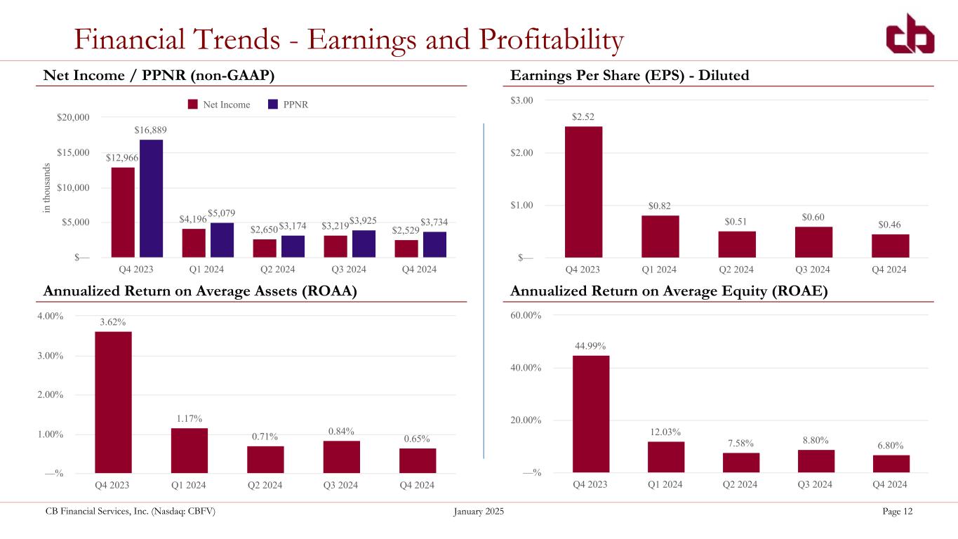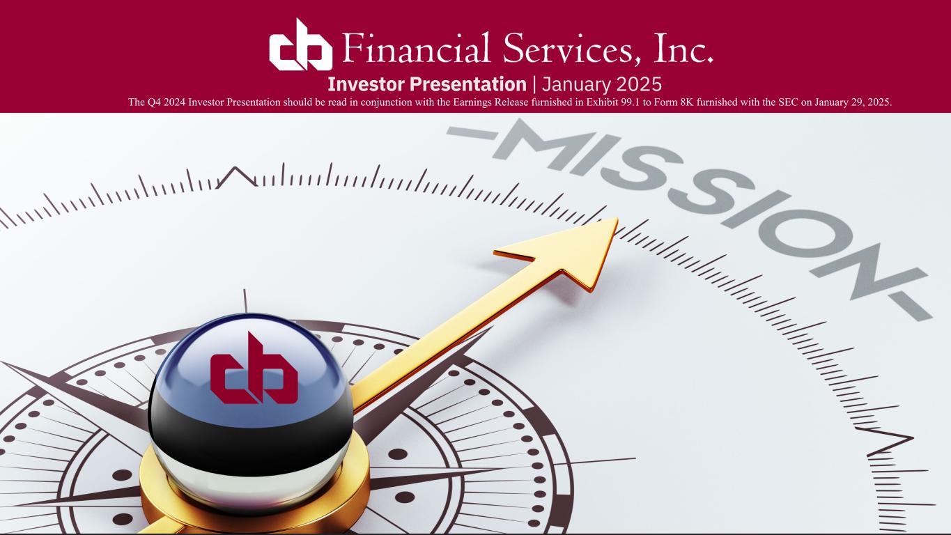 ペンシルベニア州ウォシントン、2025年1月29日--コミュニティ・バンク(以下「当行」)の持株会社であるCBファイナンシャル・サービシズ・インク(以下「CB」または「当行」)(NASDAQGM:CBFV)は本日、2024年第4四半期決算を発表した。