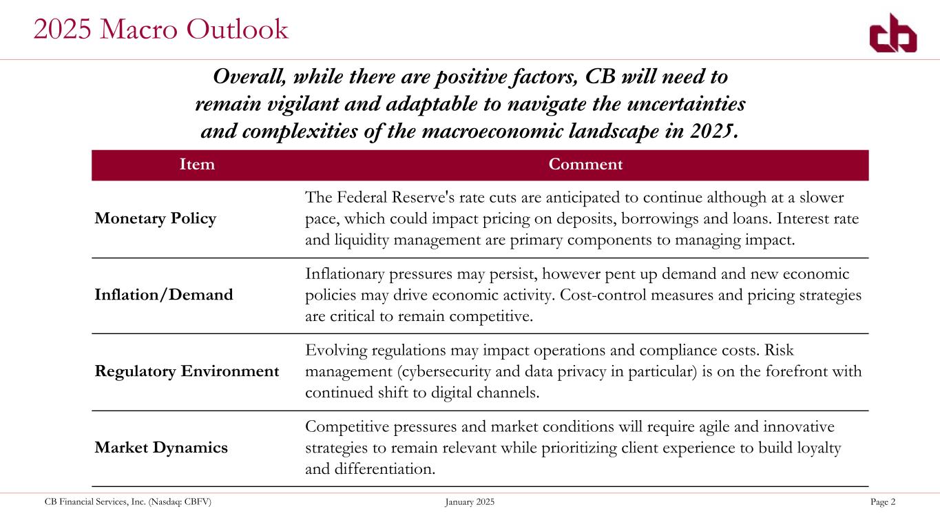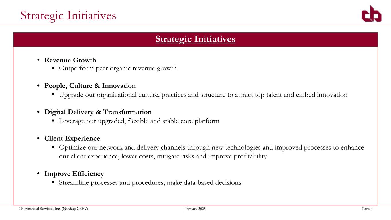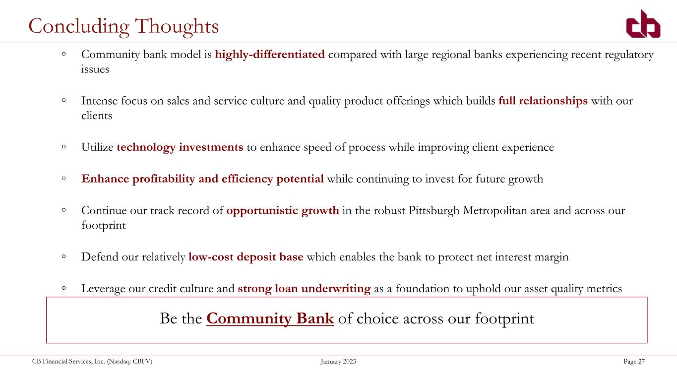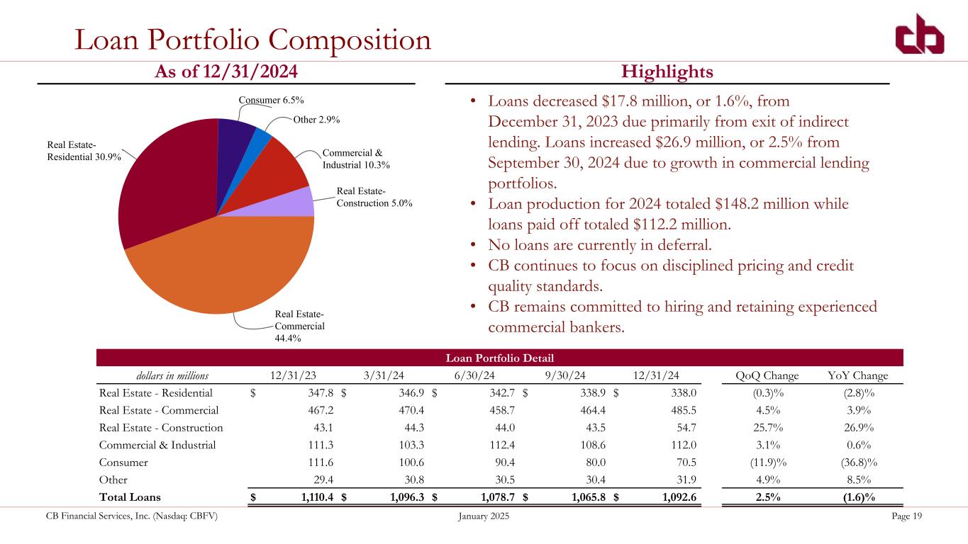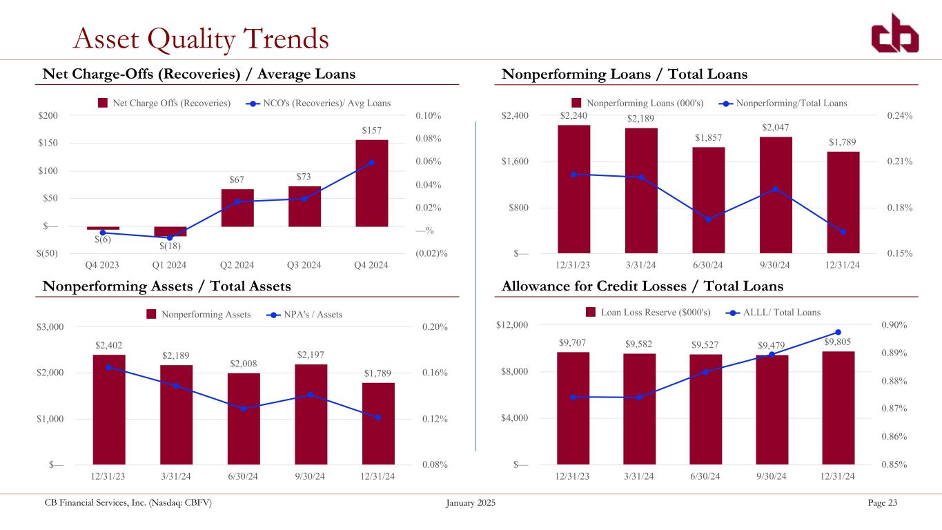 ペンシルベニア州ウォシントン、2025年1月29日--コミュニティ・バンク(以下「当行」)の持株会社であるCBファイナンシャル・サービシズ・インク(以下「CB」または「当行」)(NASDAQGM:CBFV)は本日、2024年第4四半期決算を発表した。