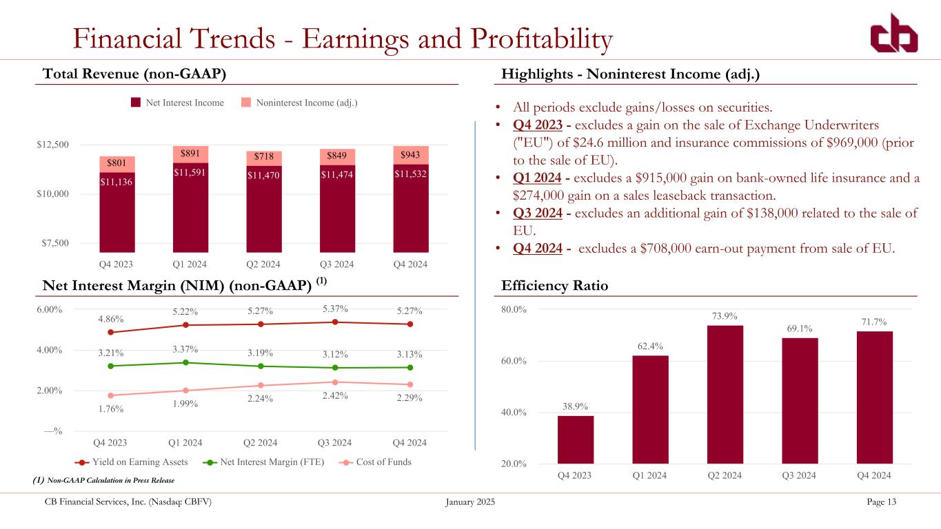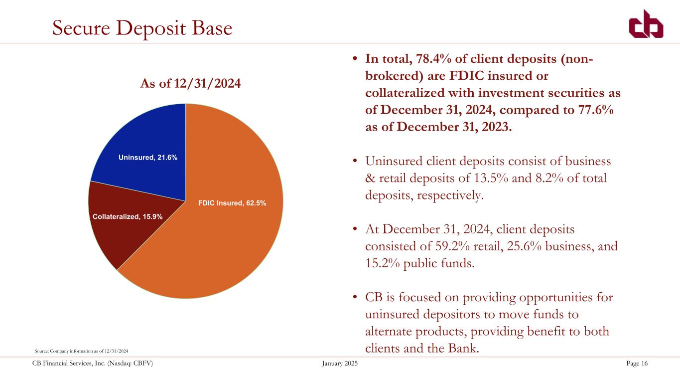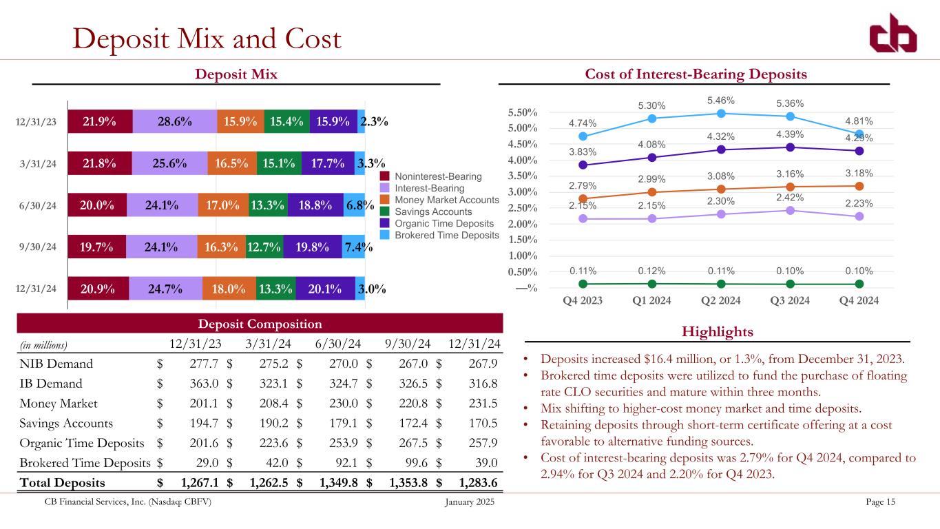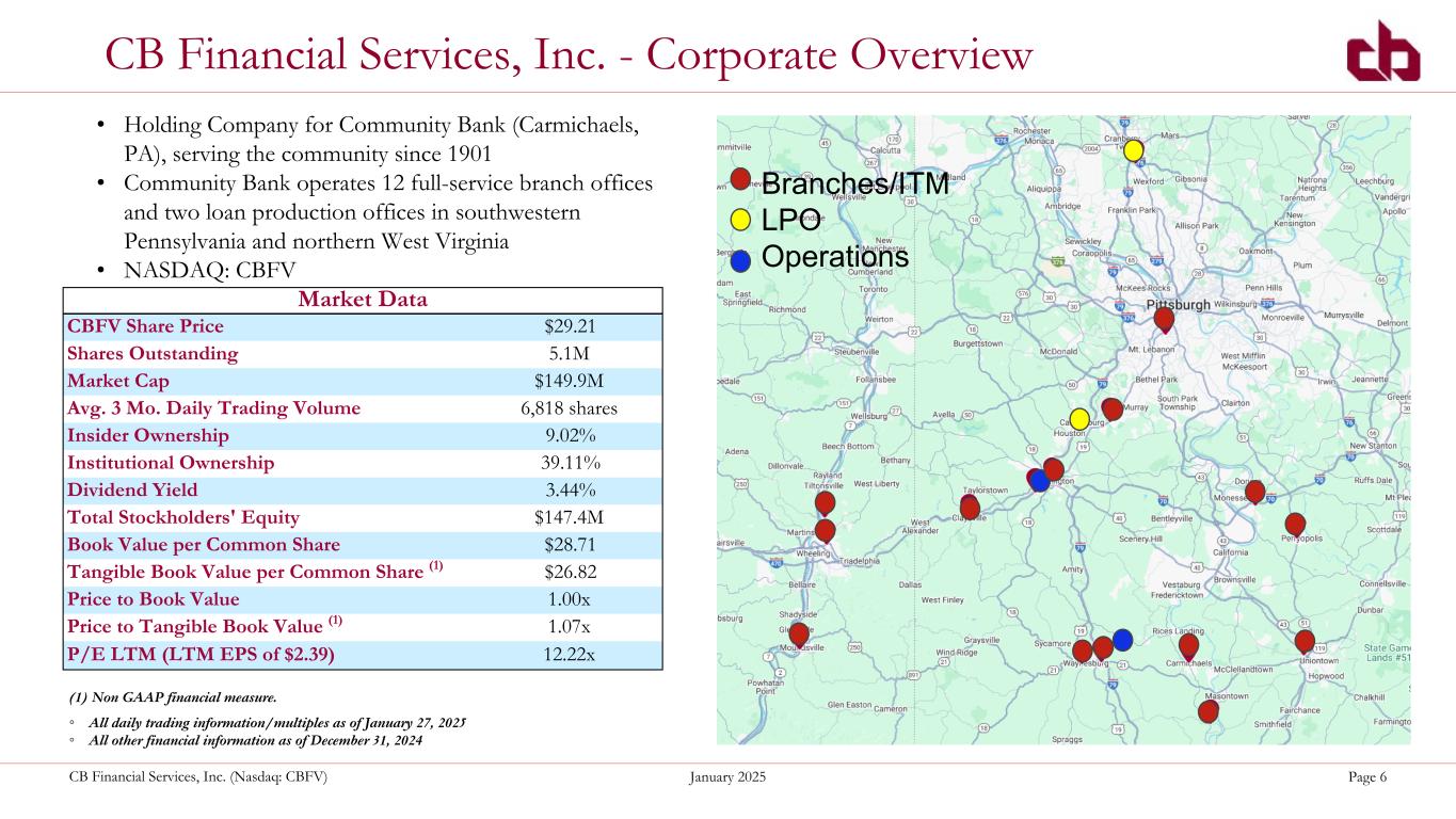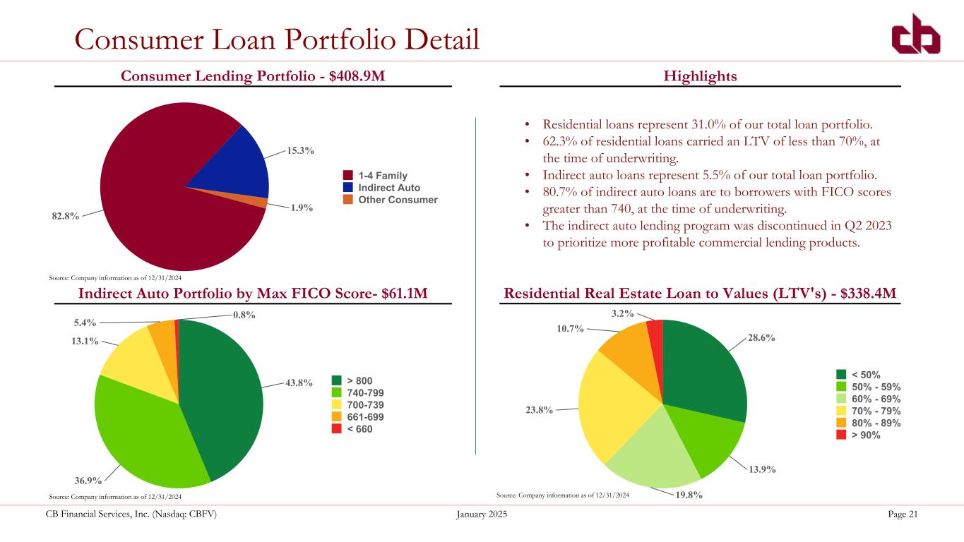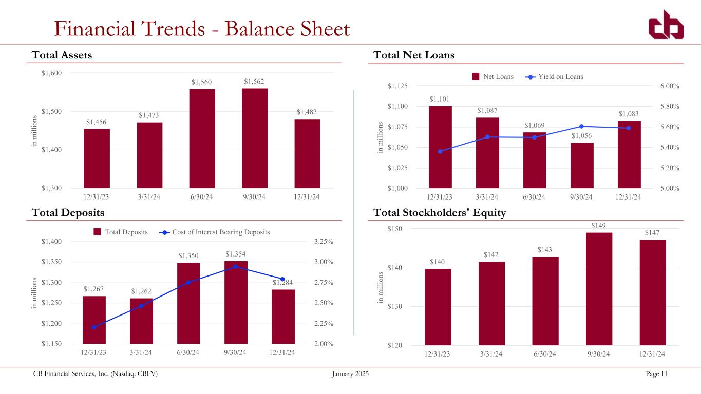 ペンシルベニア州ウォシントン、2025年1月29日--コミュニティ・バンク(以下「当行」)の持株会社であるCBファイナンシャル・サービシズ・インク(以下「CB」または「当行」)(NASDAQGM:CBFV)は本日、2024年第4四半期決算を発表した。