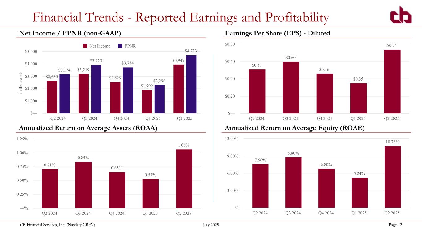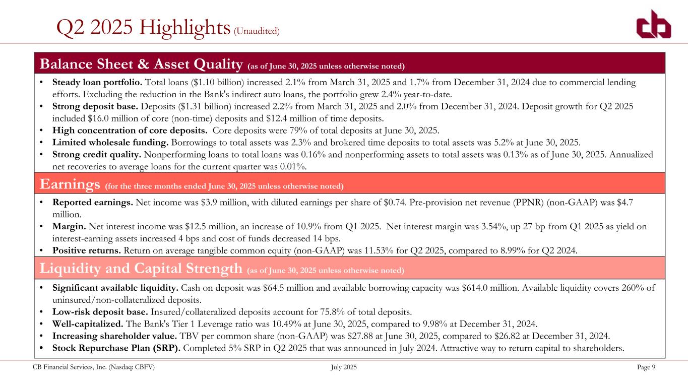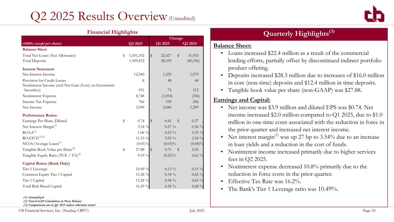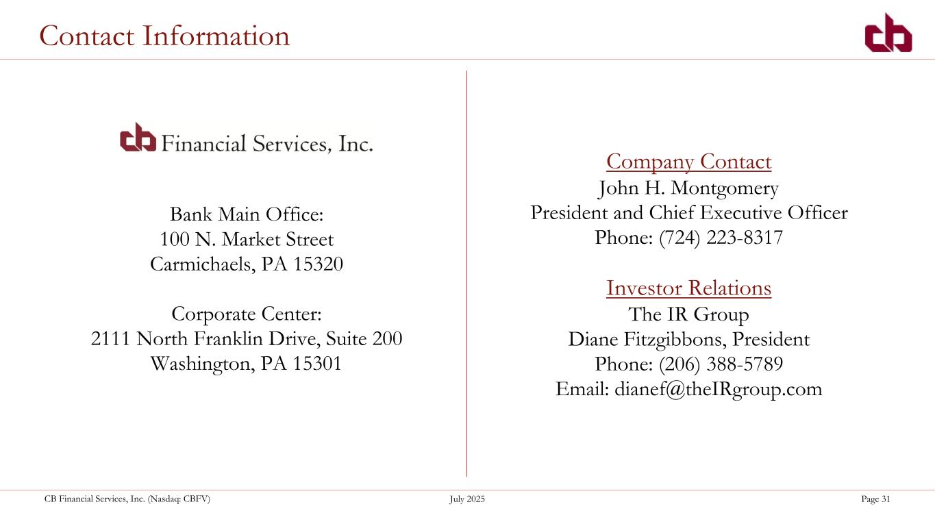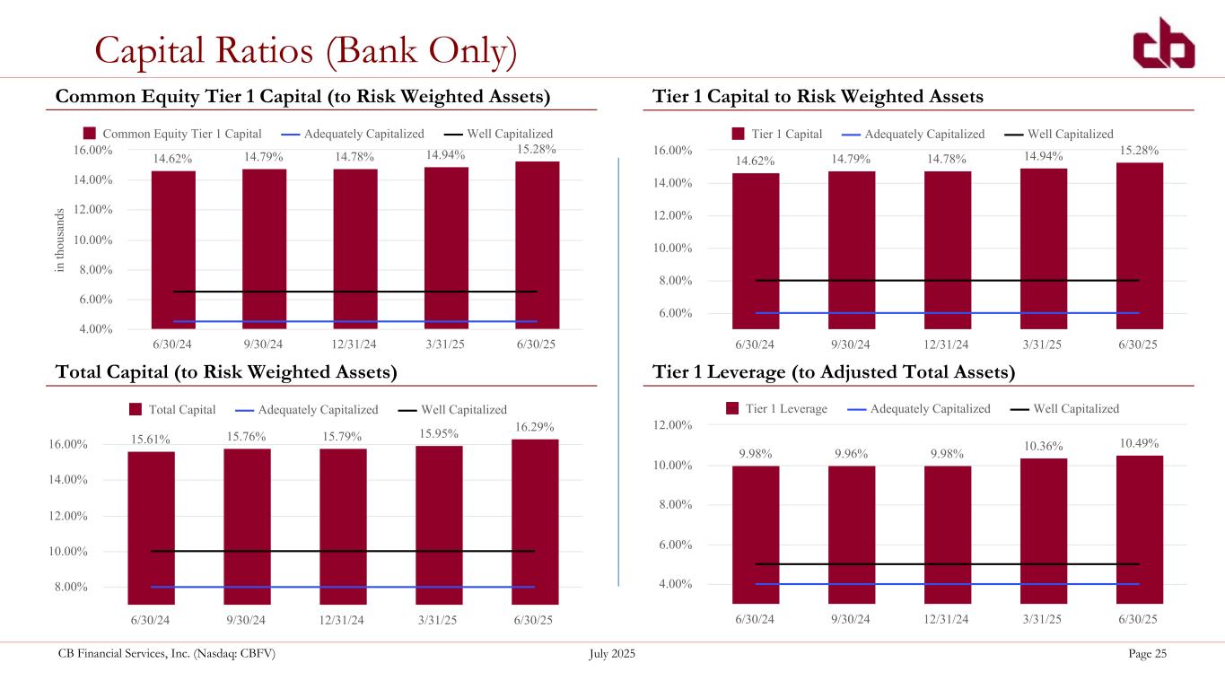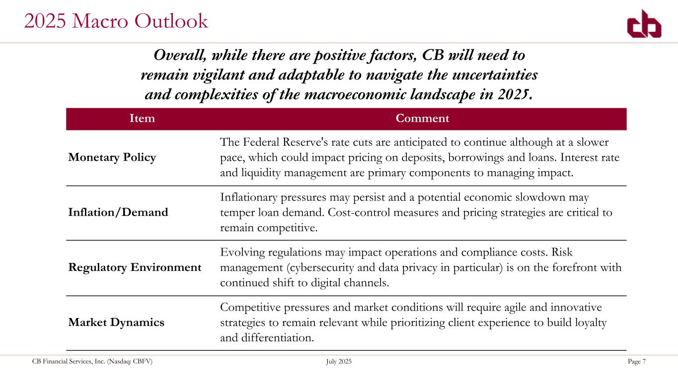 ペンシルベニア州ウォシントン、2025年7月22日--コミュニティ・バンク(以下「当行」)の持株会社であるCBファイナンシャル・サービシズ(以下「CB」または「当行」)(NASDAQGM:CBFV)は本日、2025年第2四半期および累計決算を発表した。