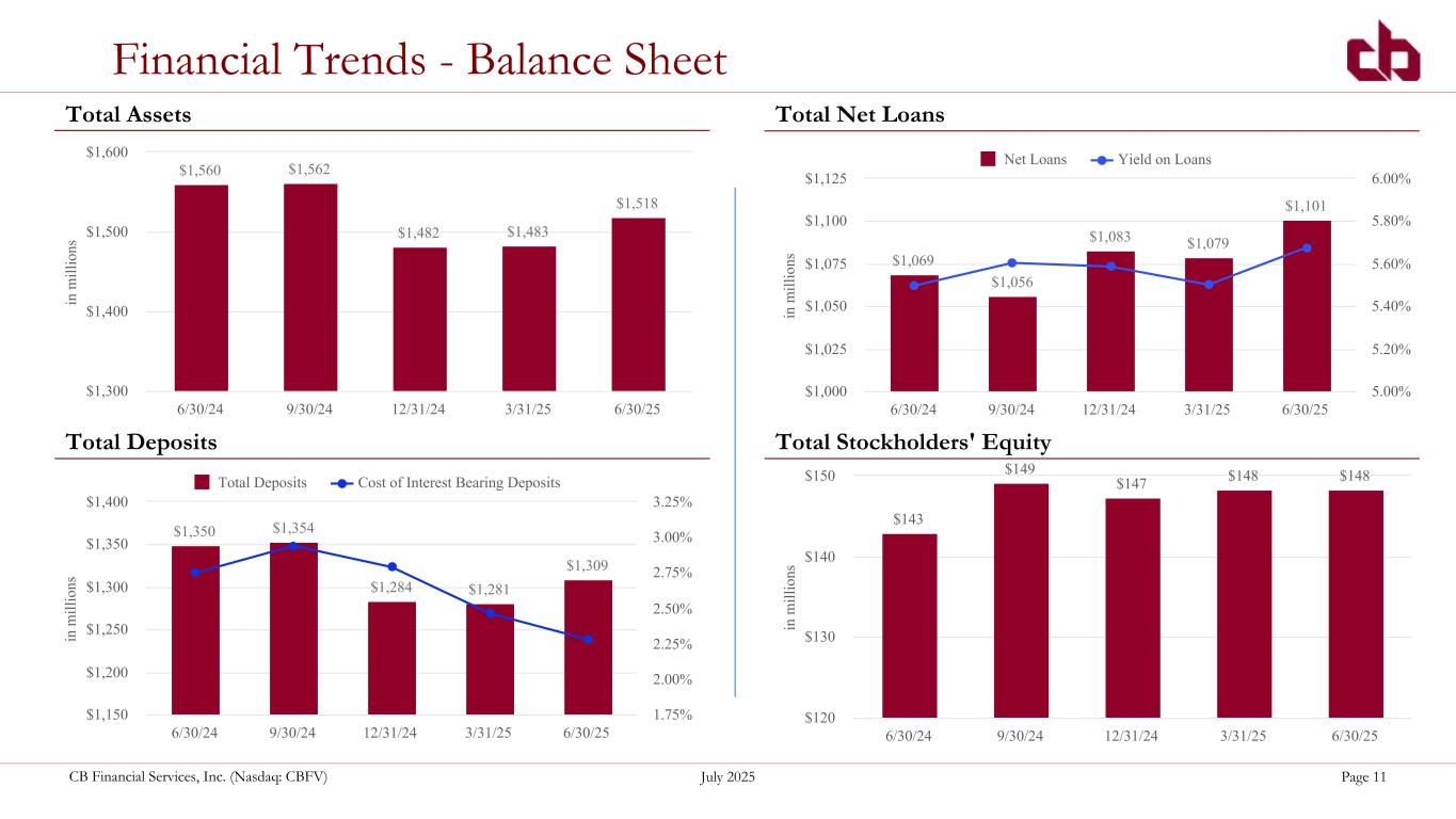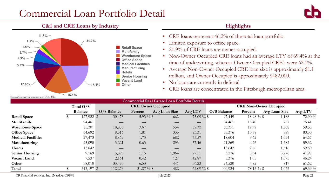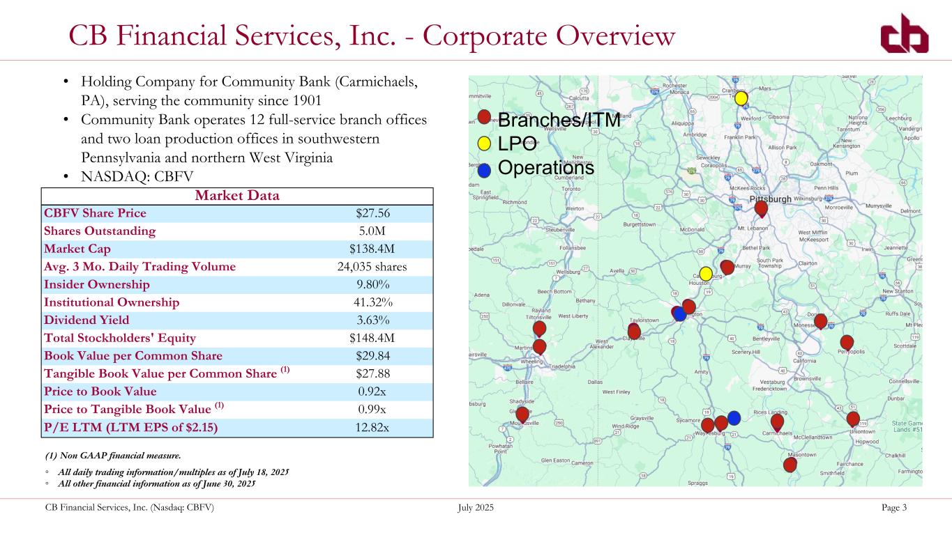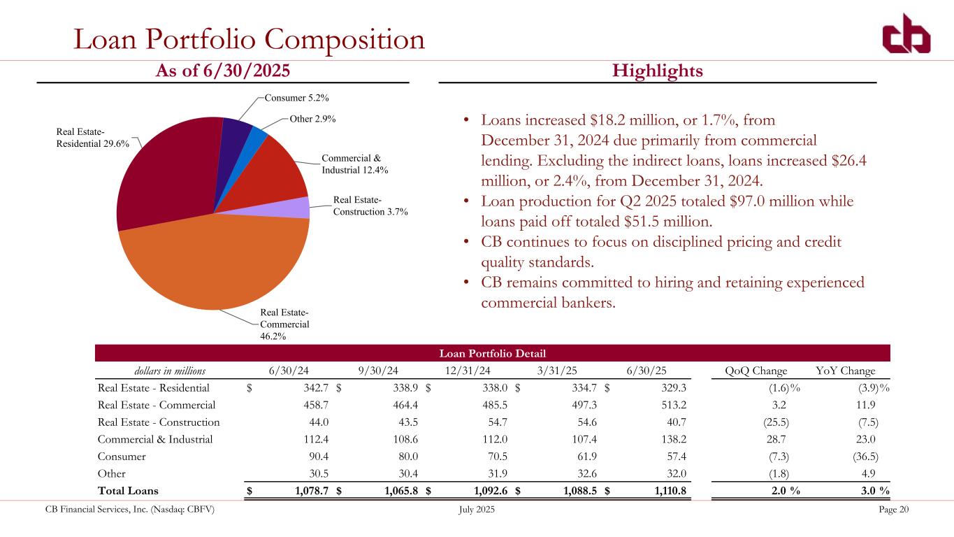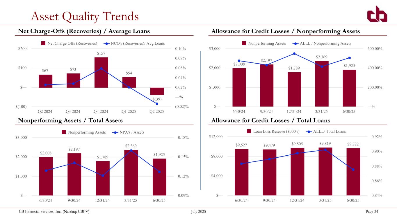 ペンシルベニア州ウォシントン、2025年7月22日--コミュニティ・バンク(以下「当行」)の持株会社であるCBファイナンシャル・サービシズ(以下「CB」または「当行」)(NASDAQGM:CBFV)は本日、2025年第2四半期および累計決算を発表した。