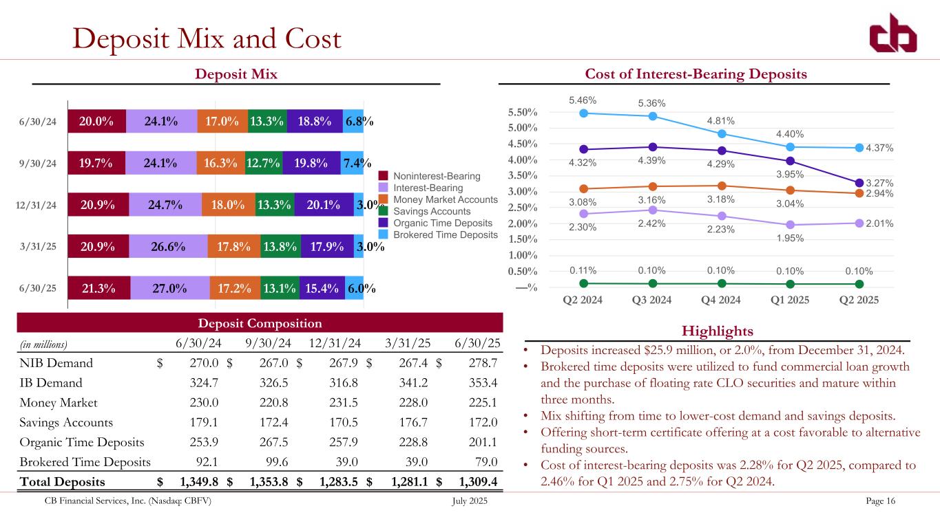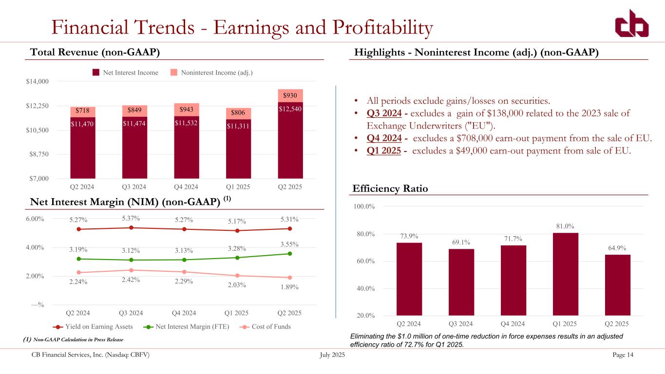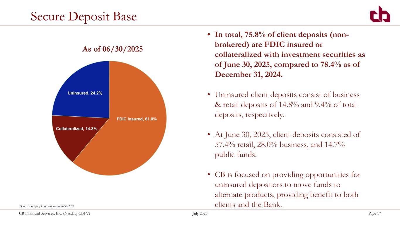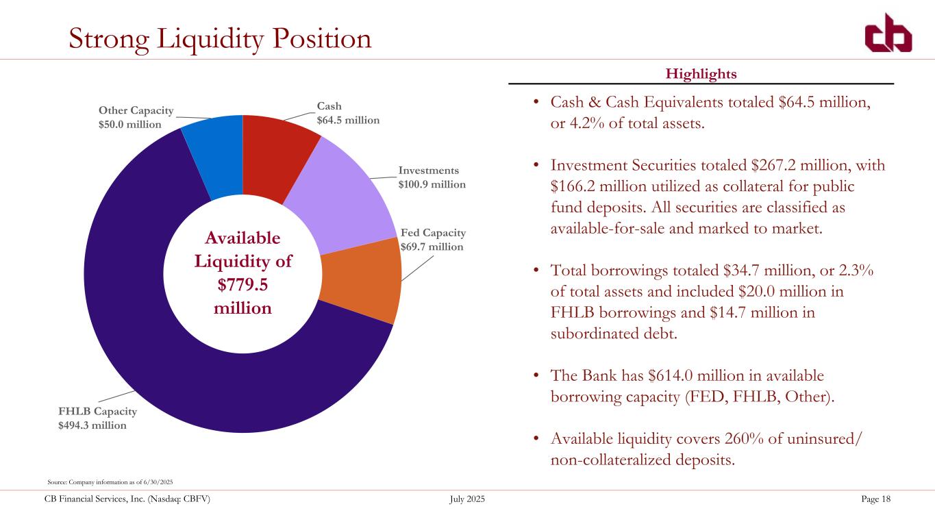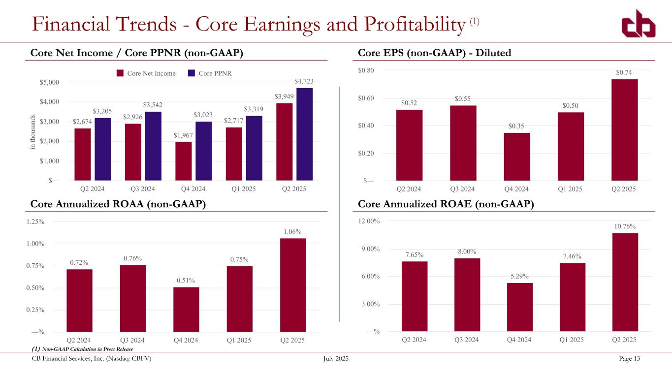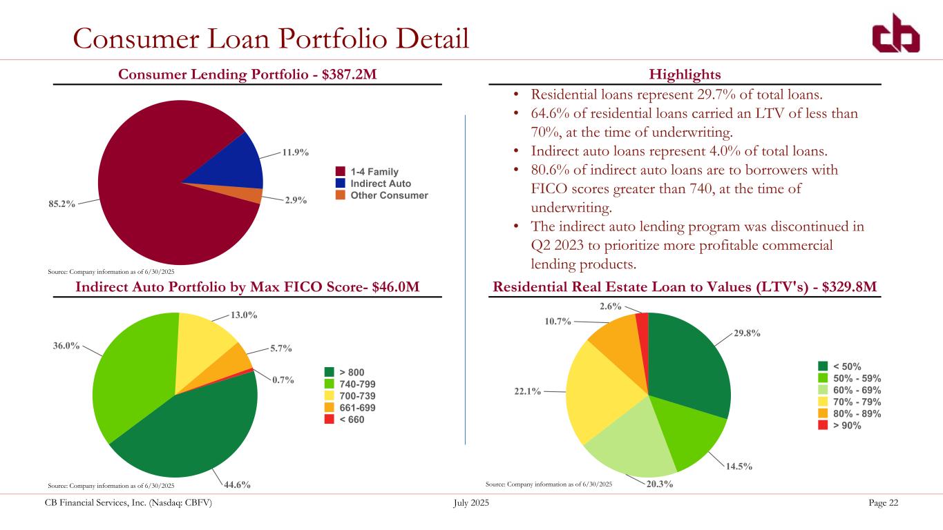 ペンシルベニア州ウォシントン、2025年7月22日--コミュニティ・バンク(以下「当行」)の持株会社であるCBファイナンシャル・サービシズ(以下「CB」または「当行」)(NASDAQGM:CBFV)は本日、2025年第2四半期および累計決算を発表した。