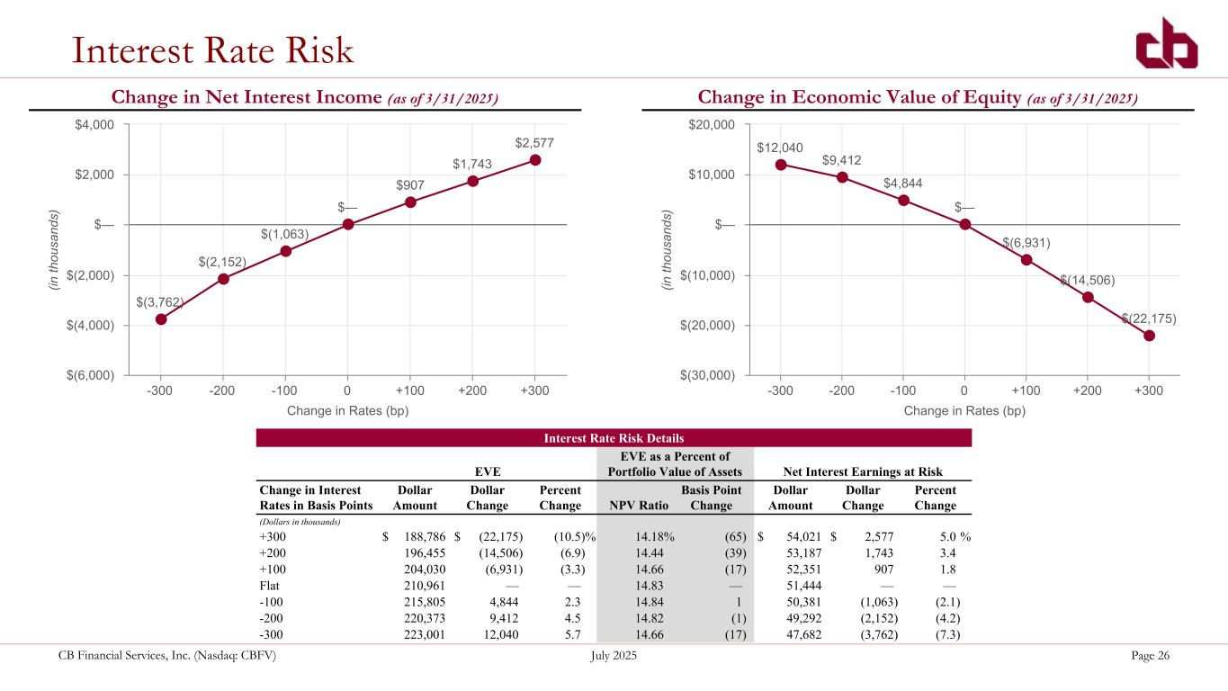 -2025年6月30日現在の総資産は15億2,000万ドルで、2025年3月31日より3,450万ドル増加した。商業用不動産および商業用・産業用ローンの好調な貸出が、コア預金口座の増加による資金調達に大きく寄与し、成長を牽引してきた。当行はまた、従来のリスク・プロファイルを維持しつつ収益を最大化するため、バランスシートの再ポジショニングに引き続き注力している。こうした戦略的な動きには以下が含まれる: