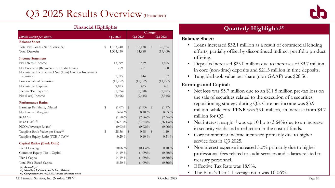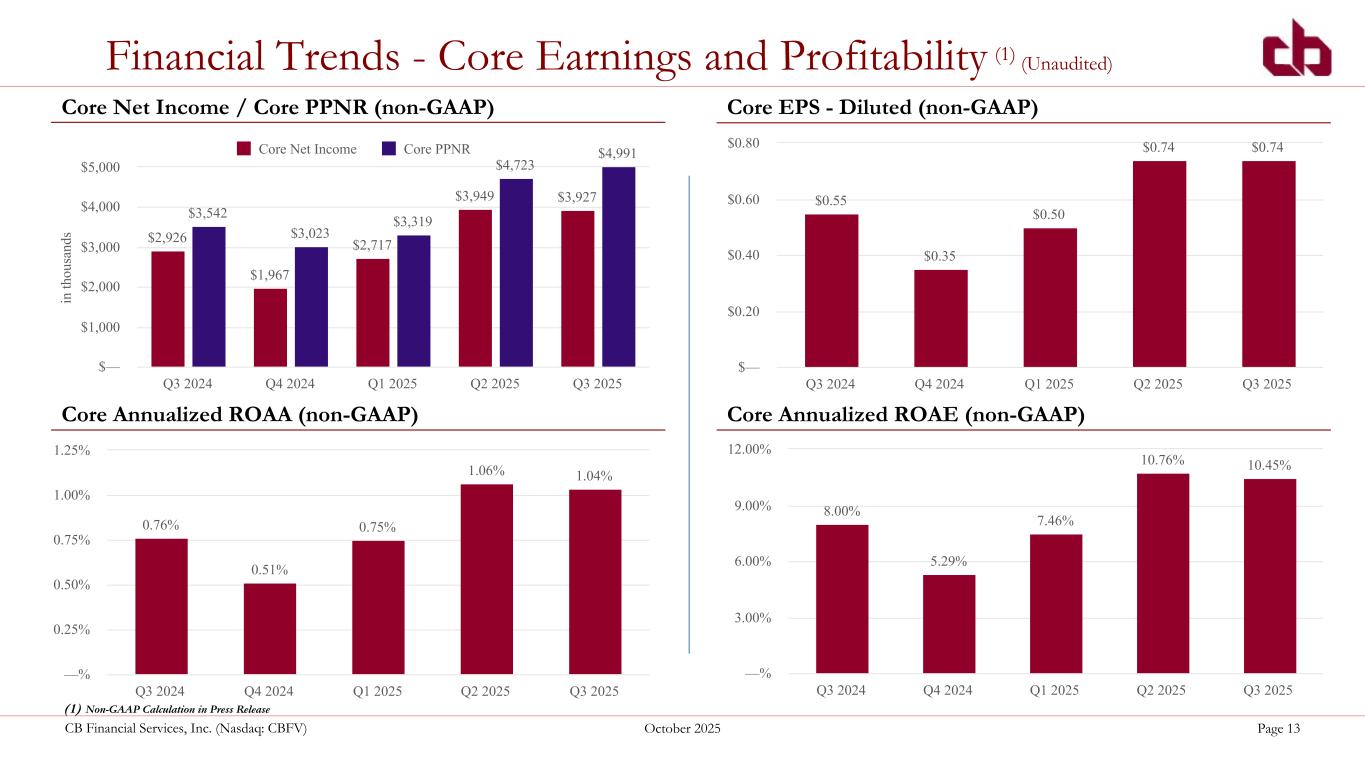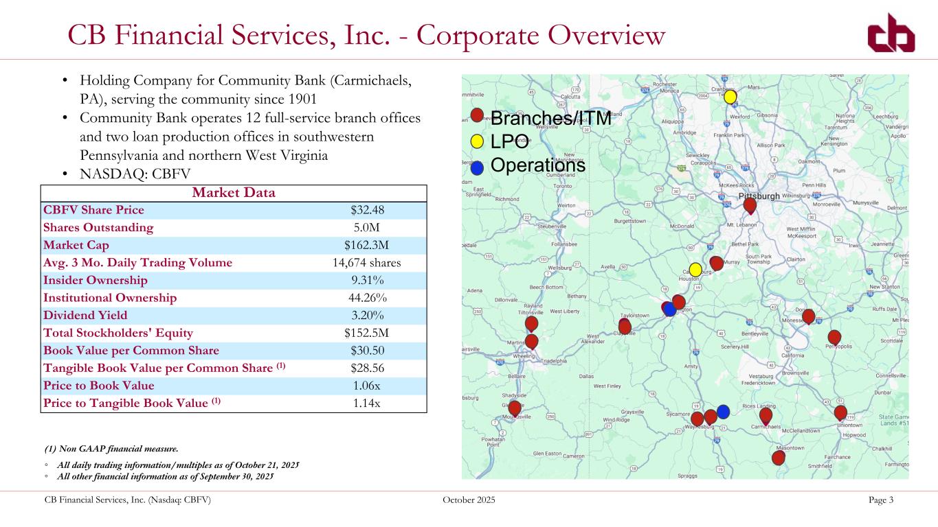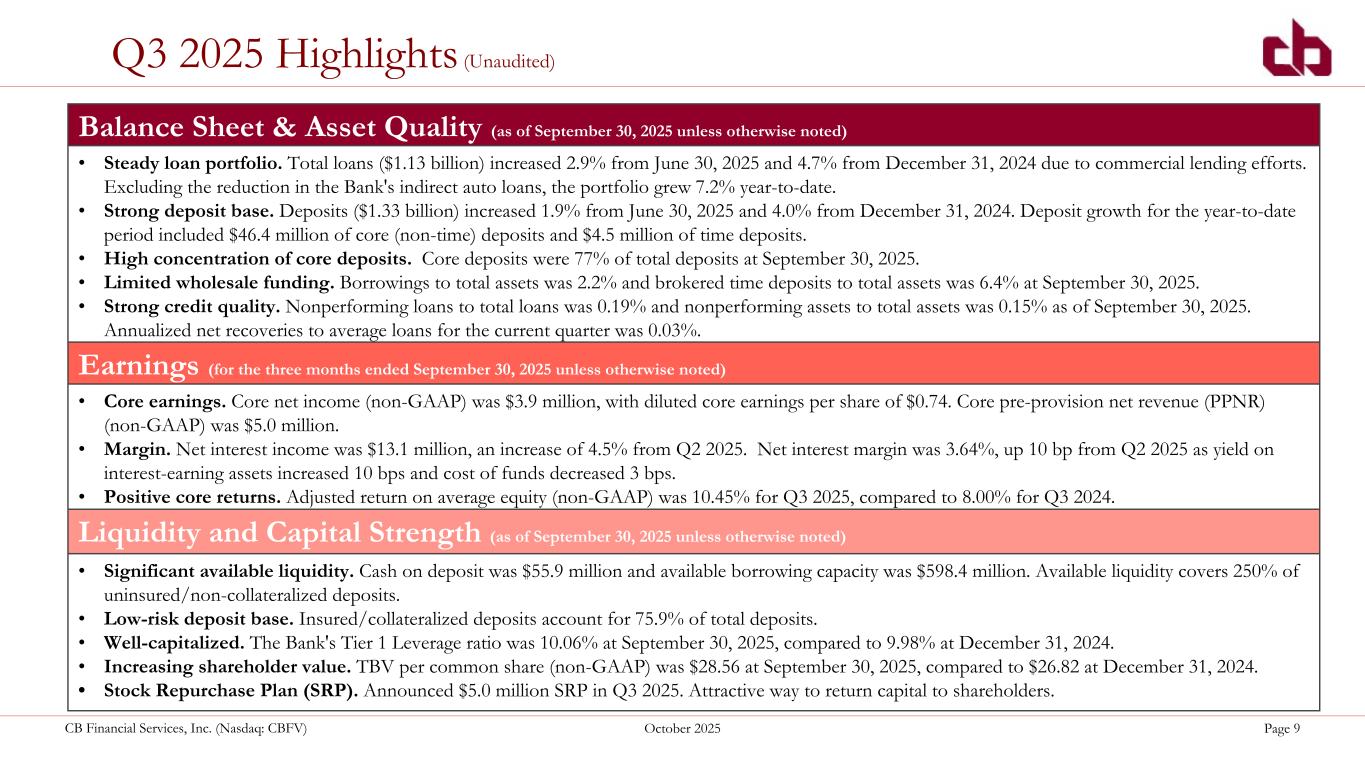 2025年10月23日、CB Financial Services, Inc.(以下「当社」)は、2025年9月30日に終了した3ヶ月間および9ヶ月間の業績を発表するプレスリリースを発表した。