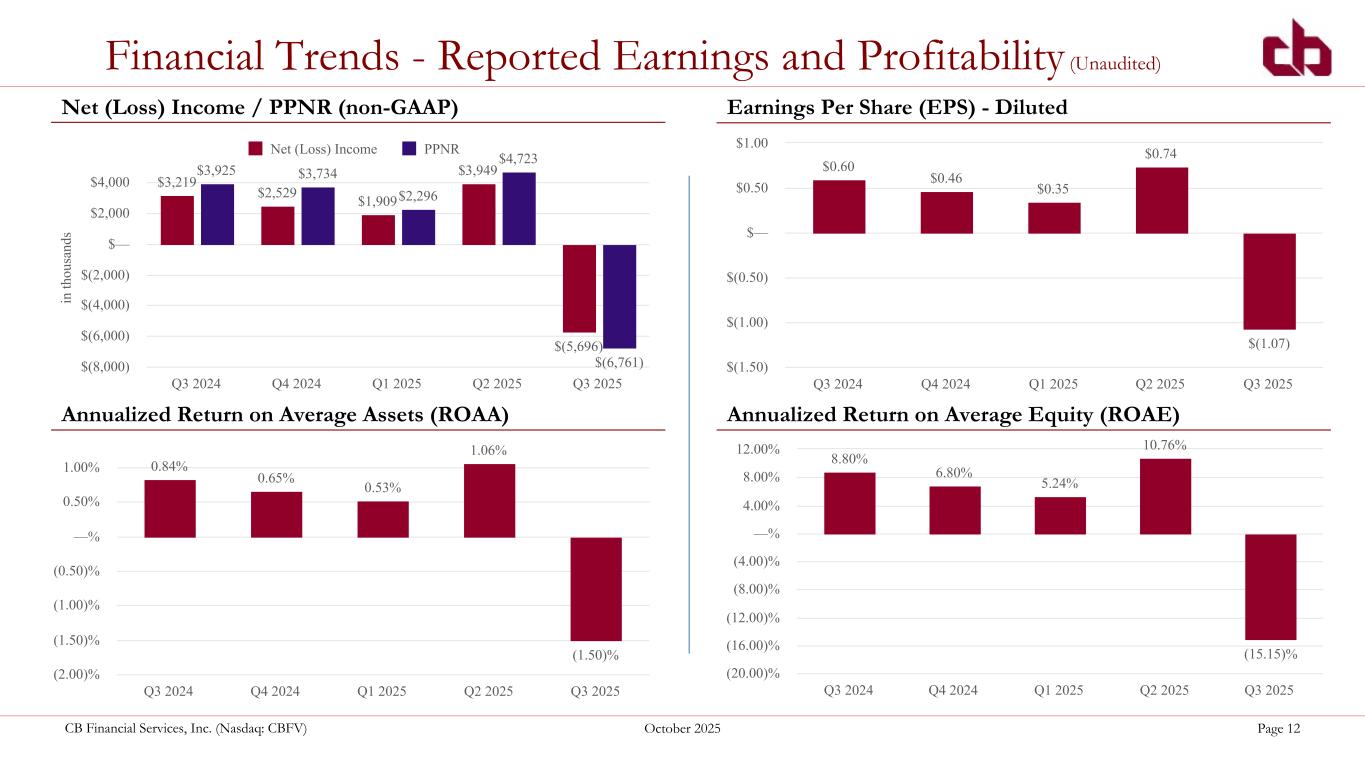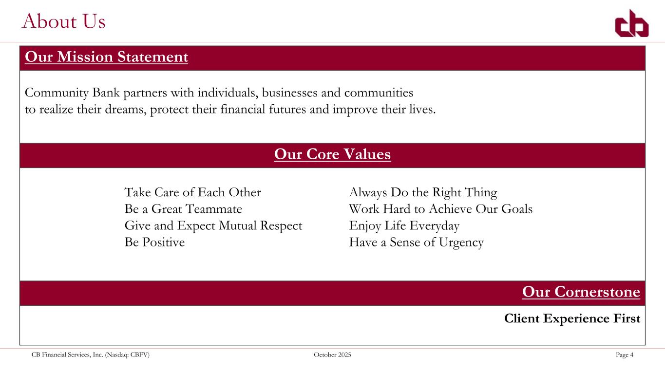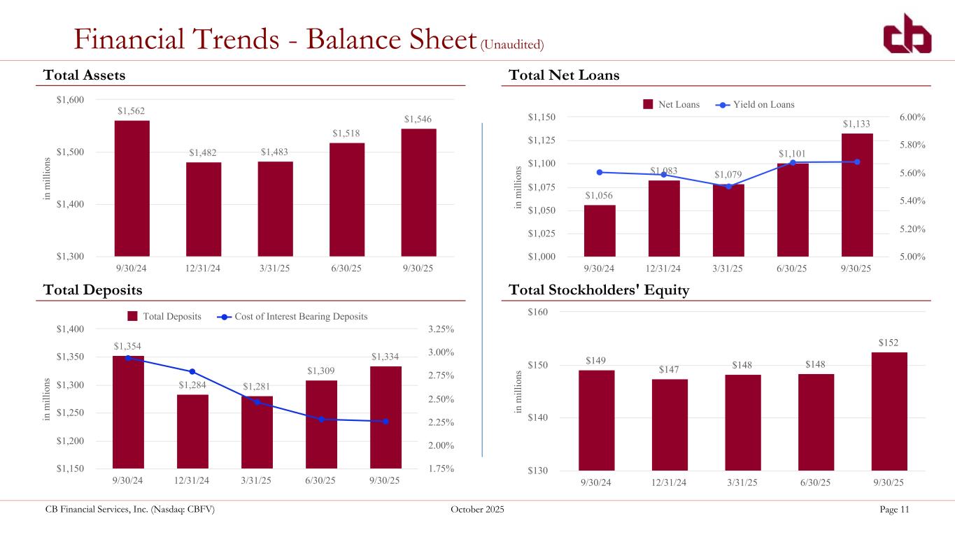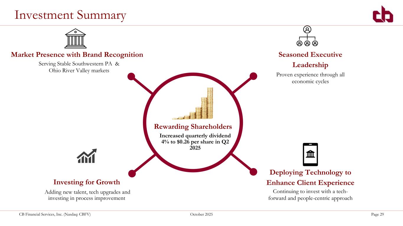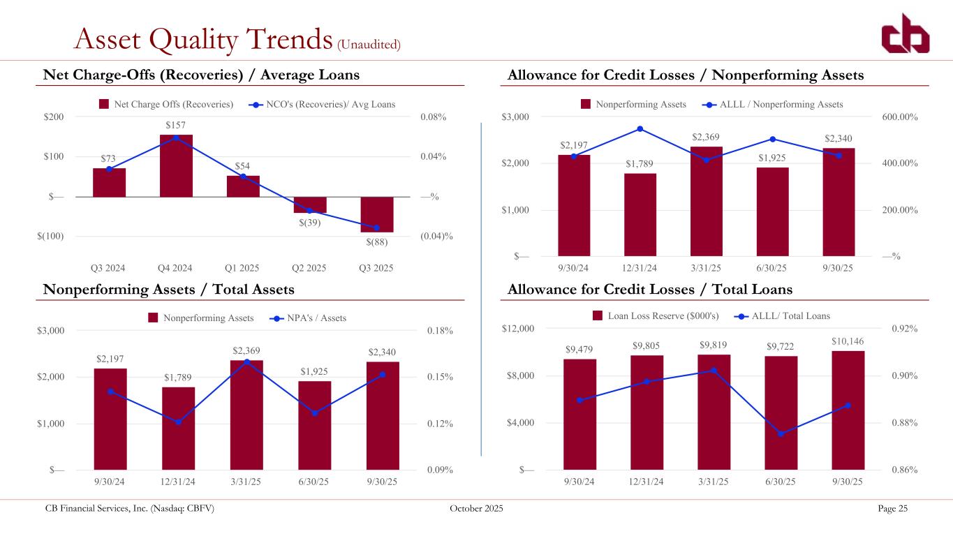 2025年10月23日、CB Financial Services, Inc.(以下「当社」)は、2025年9月30日に終了した3ヶ月間および9ヶ月間の業績を発表するプレスリリースを発表した。