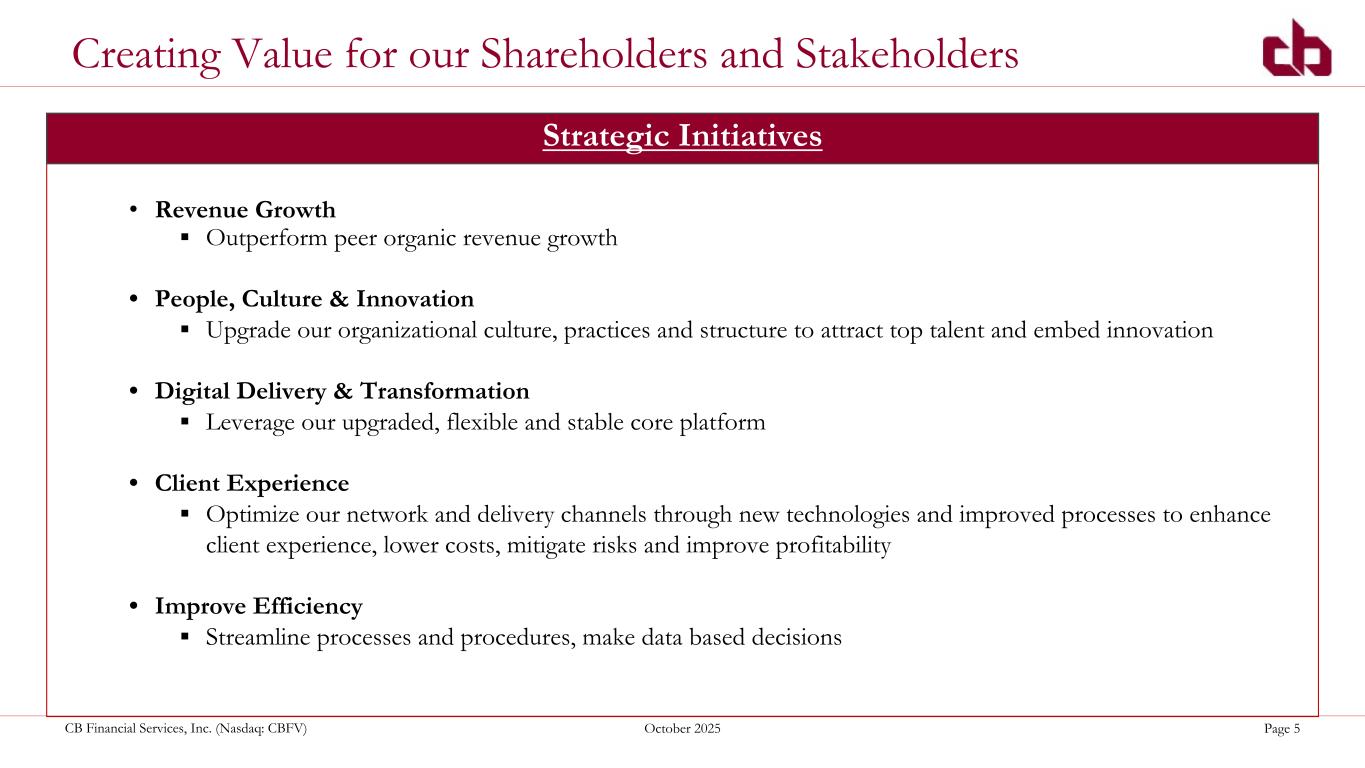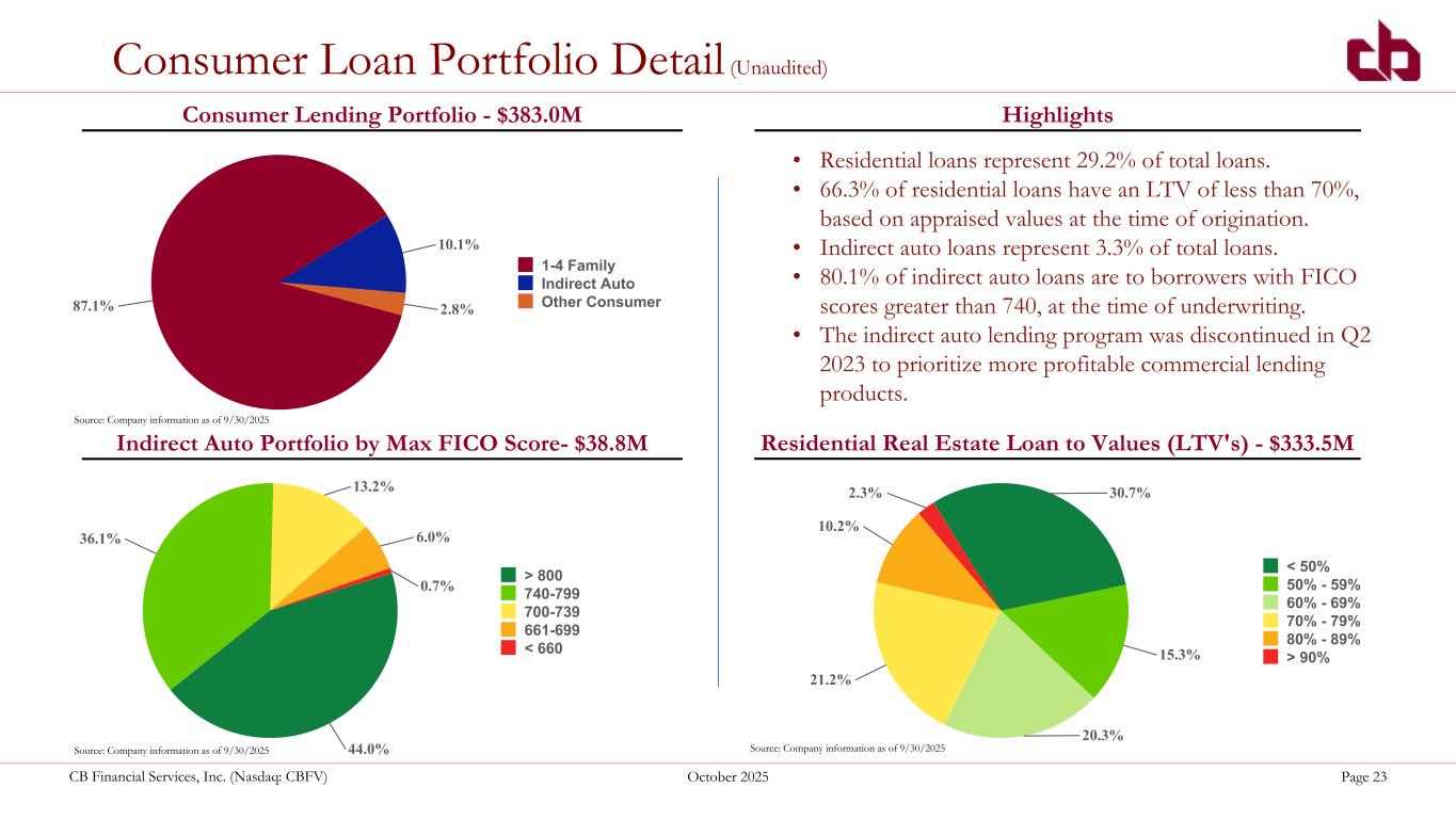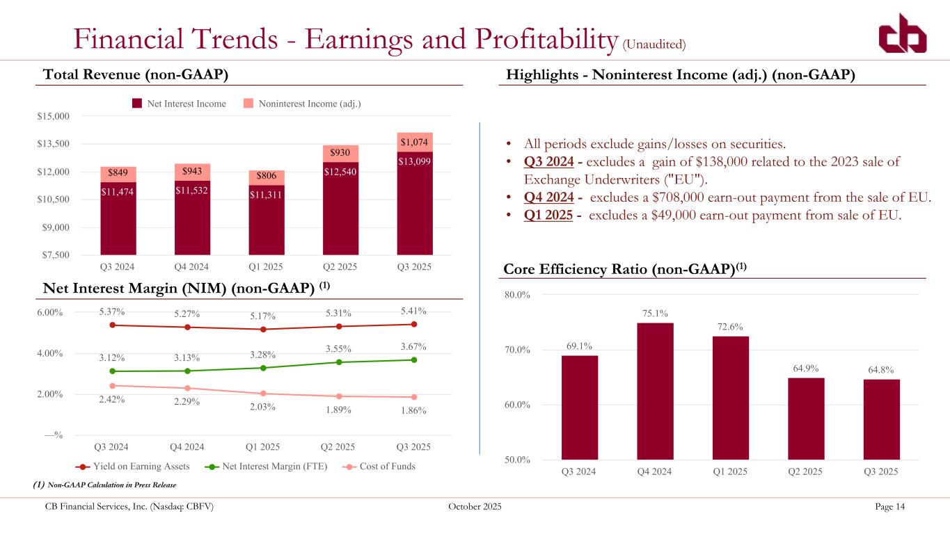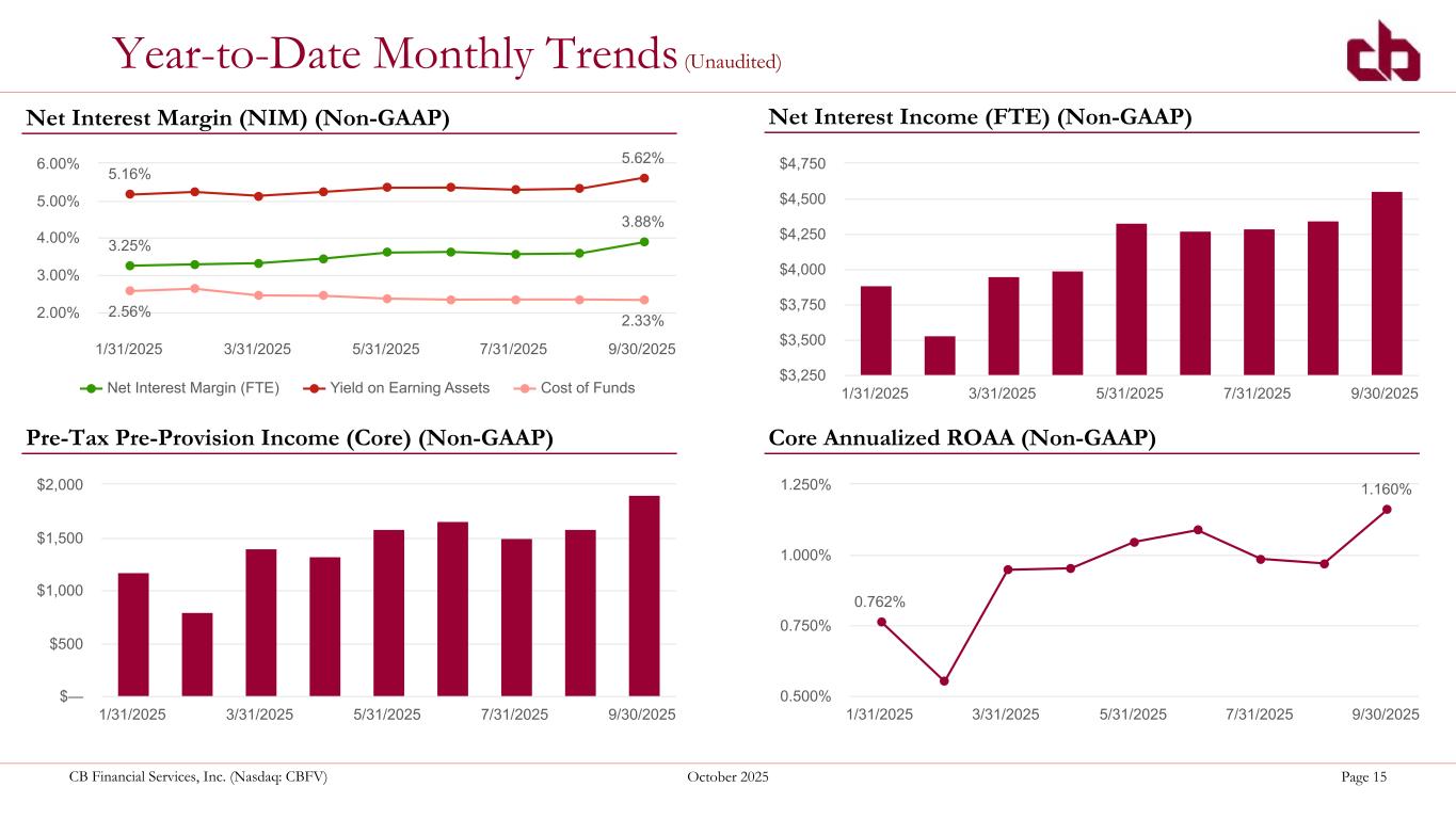 2025年10月23日、CB Financial Services, Inc.(以下「当社」)は、2025年9月30日に終了した3ヶ月間および9ヶ月間の業績を発表するプレスリリースを発表した。