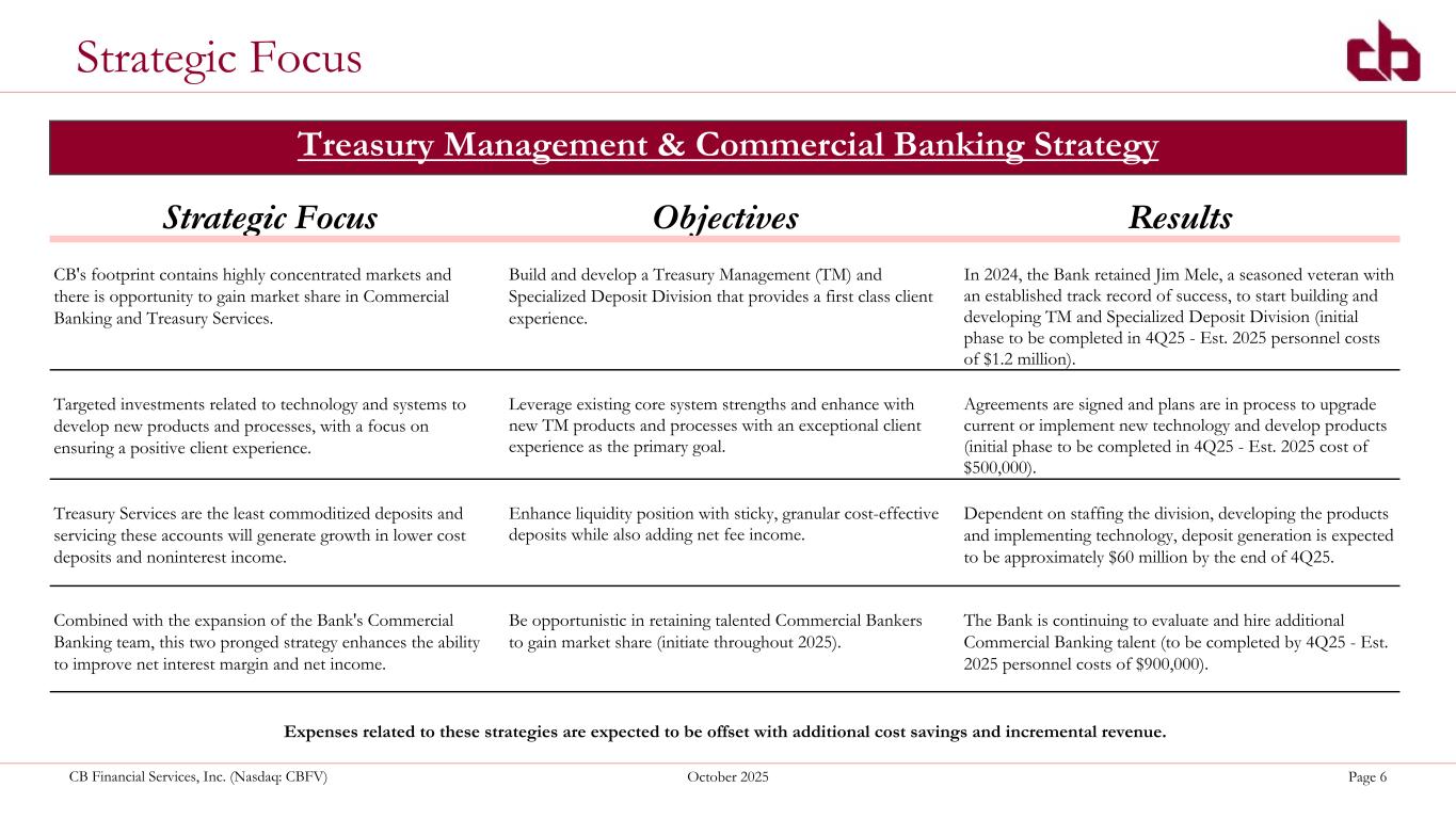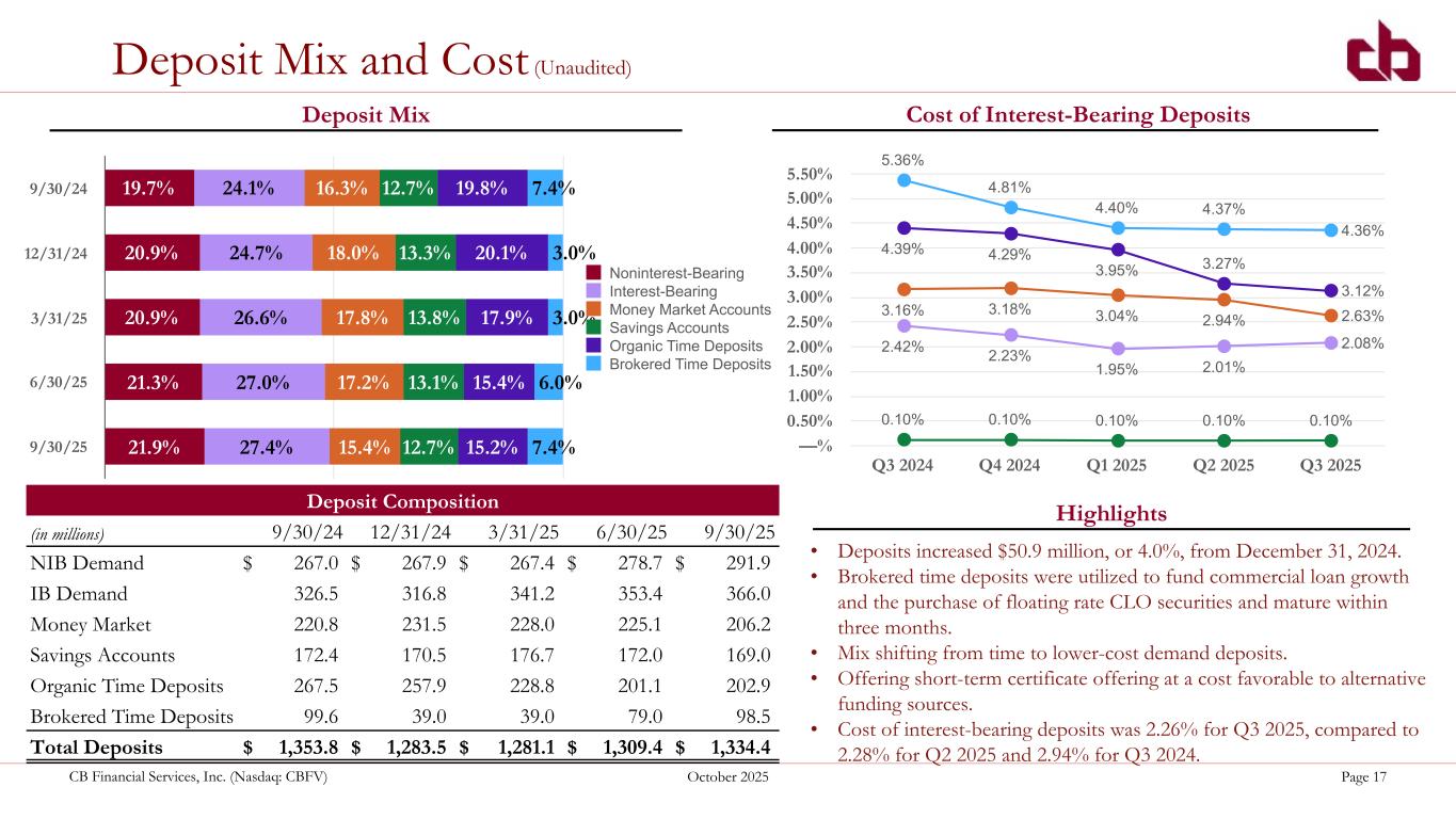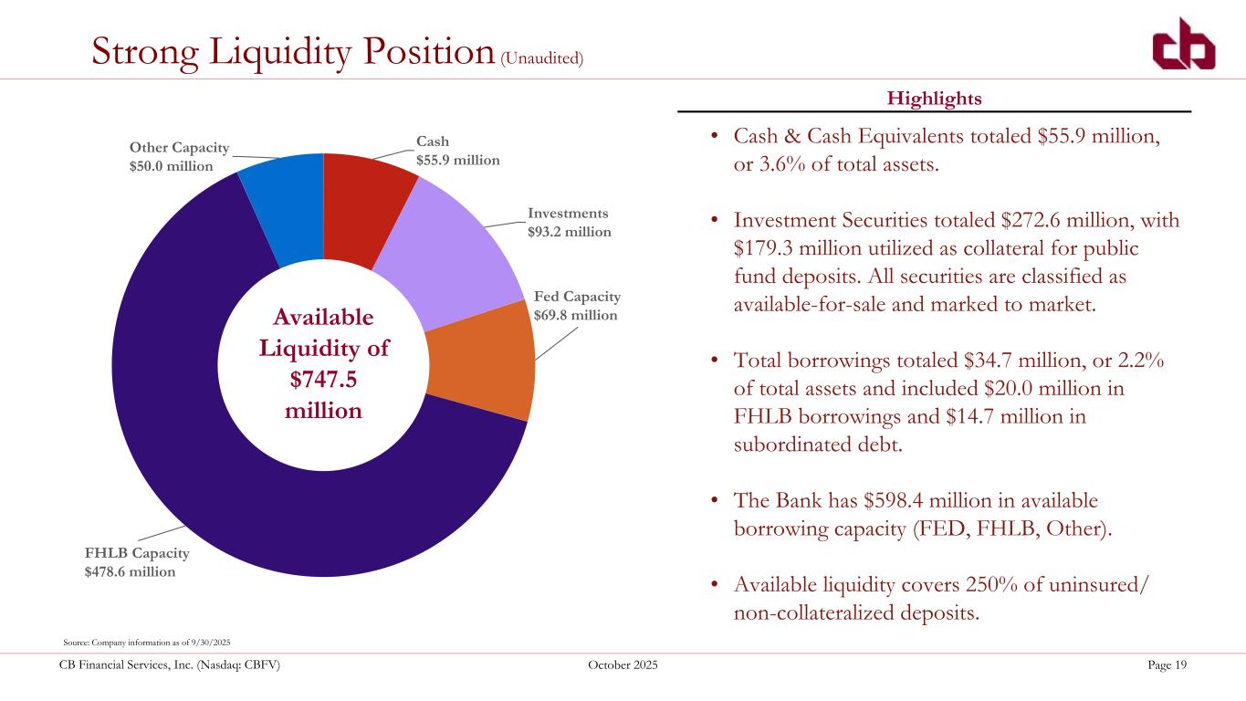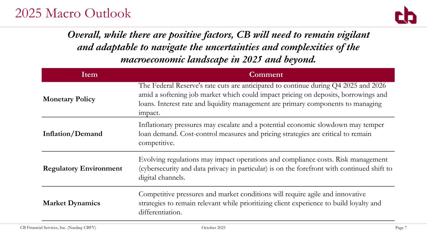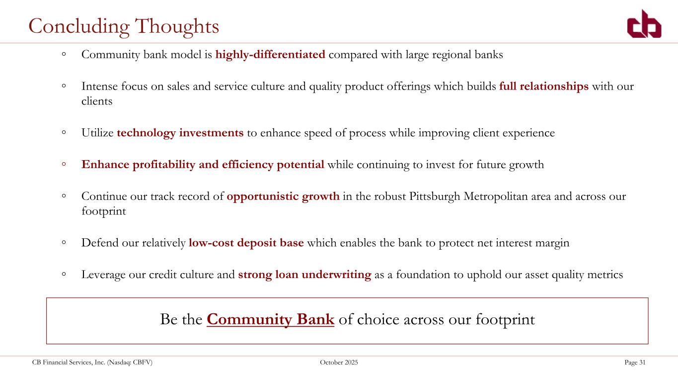2025年10月23日、CB Financial Services, Inc.(以下「当社」)は、2025年9月30日に終了した3ヶ月間および9ヶ月間の業績を発表するプレスリリースを発表した。