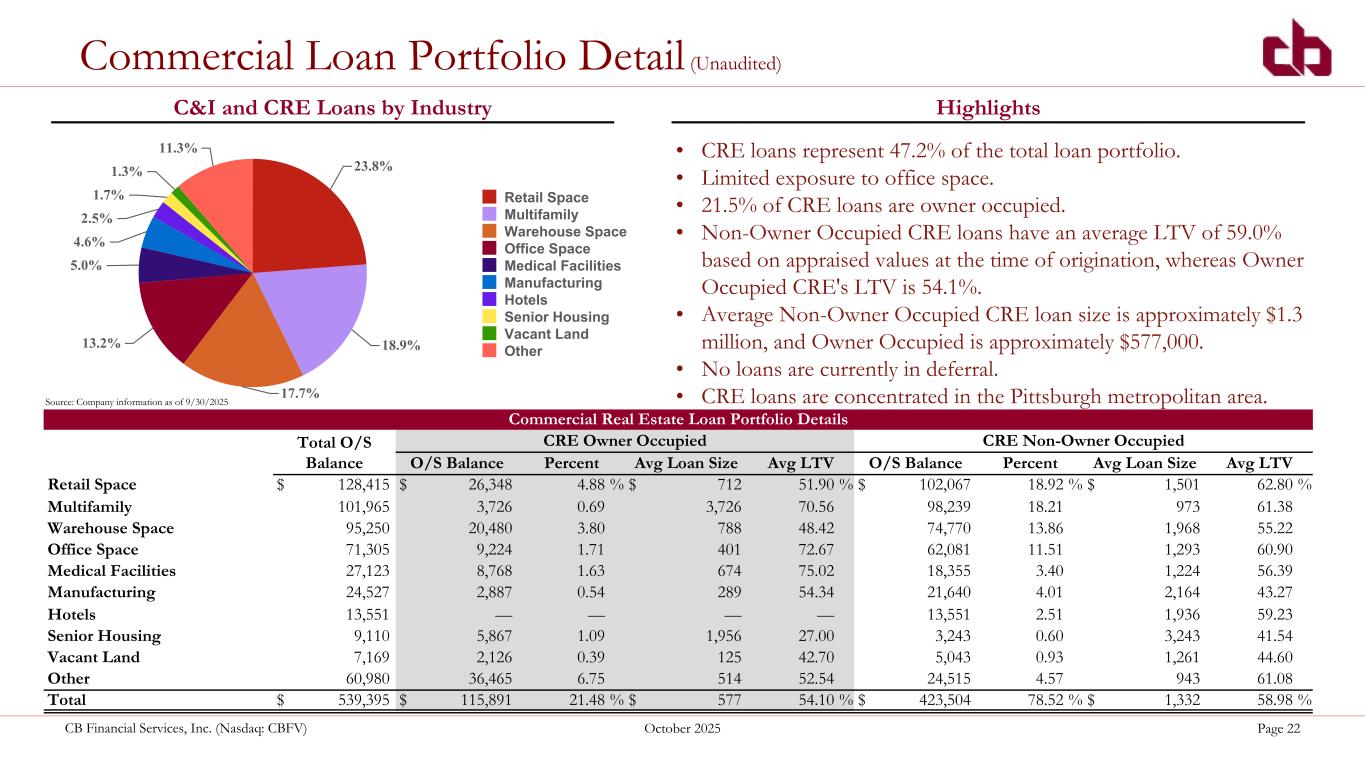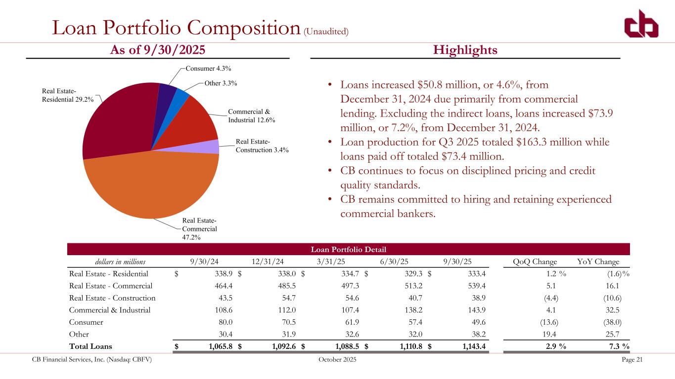 ペンシルベニア州ウォシントン、2025年10月23日--コミュニティ・バンク(以下「当行」)の持株会社であるCBファイナンシャル・サービシズ(以下「CB」または「当行」)(NASDAQGM:CBFV)は本日、2025年第3四半期および累計決算を発表した。
