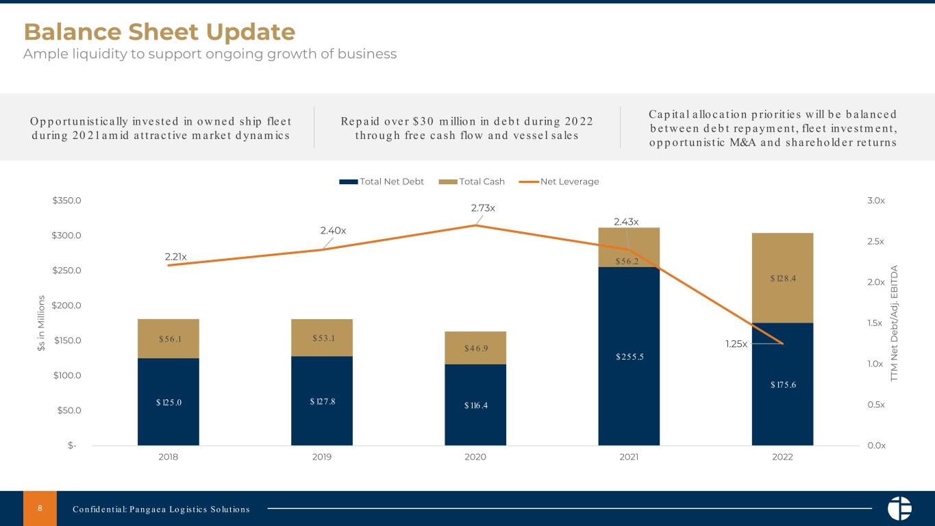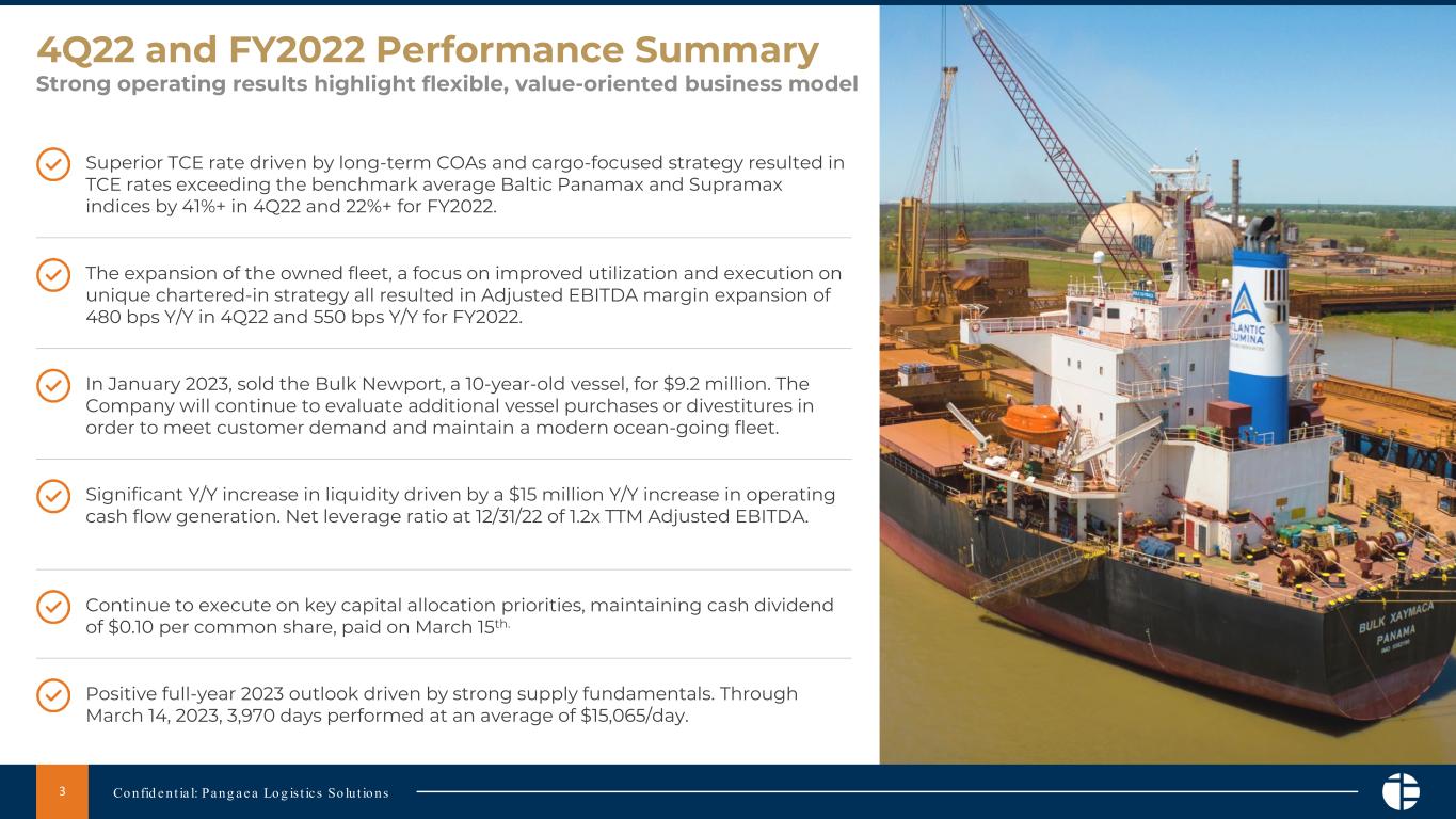 Continue to drive strong fleet utilization. In the fourth quarter Pangaea's twenty-five owned vessels were fully utilized and supplemented with an average of fifteen chartered-in vessels to support cargo and COA commitments. Utilizing its nimble fleet approach, the Company reduced its exposure to the market by redelivering chartered-in vessels and reducing its average chartered-in fleet from 26 vessels in Q3 22 to 15 vessels in Q4 22.