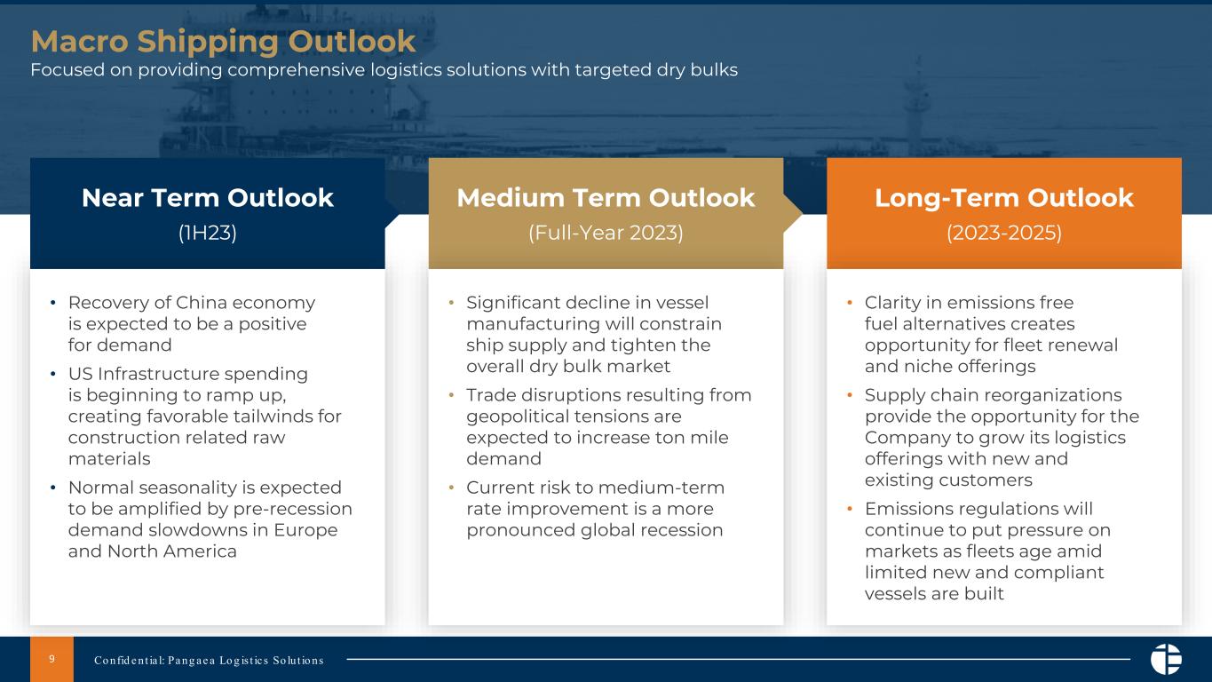 Continue to upgrade fleet, while divesting older, non-core assets. In January of 2023, the Company entered into an agreement to sell the Bulk Newport, a 2003 Shin Kurushima Toyohashi shipyard-built 52,587 dwt dry bulk vessel, for $9.2 million. With this sale, Pangaea now owns 24 ships, while continuing to operate a total fleet of approximately 40-60 vessels in worldwide trades. The sale of the Bulk Newport is consistent with the Company’s strategy of maintaining an average fleet age of less than 10 years, amid tightening global emission regulations. Looking ahead, the Company intends to opportunistically manage its fleet with the purpose of maximizing TCE rates, while continuing to support client requirements on an on-demand basis.