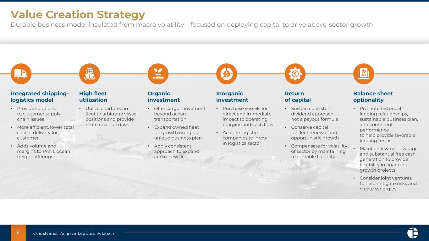 Pangaea remains committed to developing a leading dry bulk logistics and transportation services company of scale, providing its customers with specialized shipping and supply chain and logistics offerings in commodity and niche markets, which drive premium returns measured in time charter equivalent per day.
