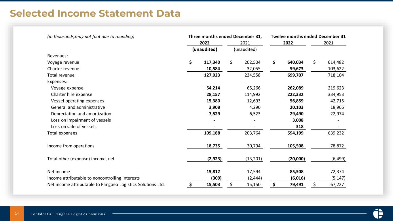 For the fourth quarter ended December 31, 2022, Pangaea reported non-GAAP adjusted net income of $14.3 million, or $0.32 per diluted share, on total revenue of $127.9 million. Fourth quarter TCE rates declined 38.5% on a year-over-year basis, while total shipping days, which include both voyage and time charter days, declined 29.2% to 3,681 days, when compared to the year-ago period.