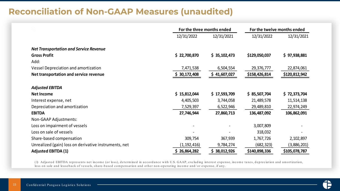 Adjusted EBITDA and adjusted EPS. Adjusted EBITDA represents net income (or loss), determined in accordance with U.S. GAAP, excluding interest expense, income taxes, depreciation and amortization, loss on sale and leaseback of vessels, share-based compensation and other non-operating income and/or expense, if any. Earnings per share represents net income divided by the weighted average number of common shares outstanding. Adjusted earnings per share represents net income attributable to Pangaea Logistics Solutions Ltd. plus, when applicable, loss on sale of vessel, loss on sale and leaseback of vessel, loss on impairment of vessel, unrealized gains and losses on derivative instruments, and certain non-recurring charges, divided by the weighted average number of shares of common stock.