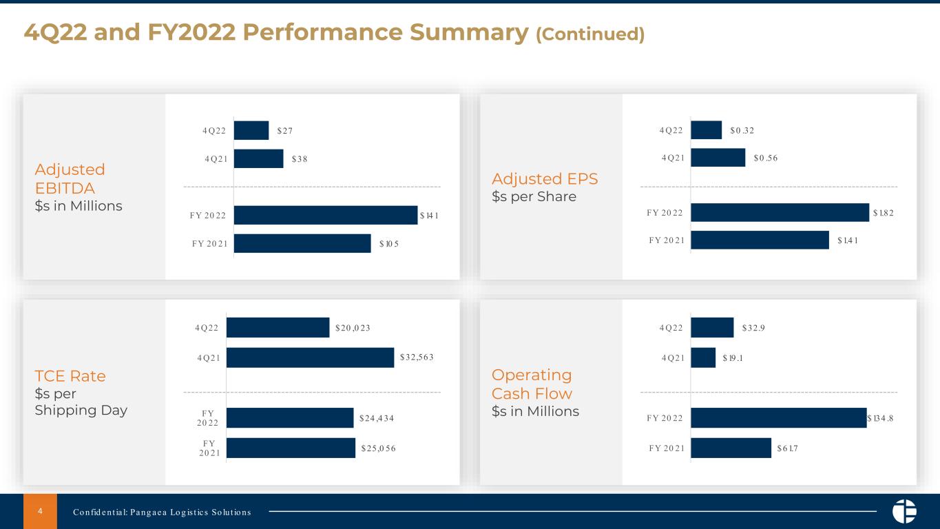 2022年12月31日に終了した第4四半期、パンゲアは総売上高1億2790万ドルに対し、非GAAP調整後純利益1430万ドル(希薄化後1株当たり0.32ドル)を計上しました。第4四半期のTCEレートは前年同期比で38.5%低下し、航海日数と定期傭船日数の両方を含む総出荷日数は前年同期比で29.2%低下し、3,681日となりました。
