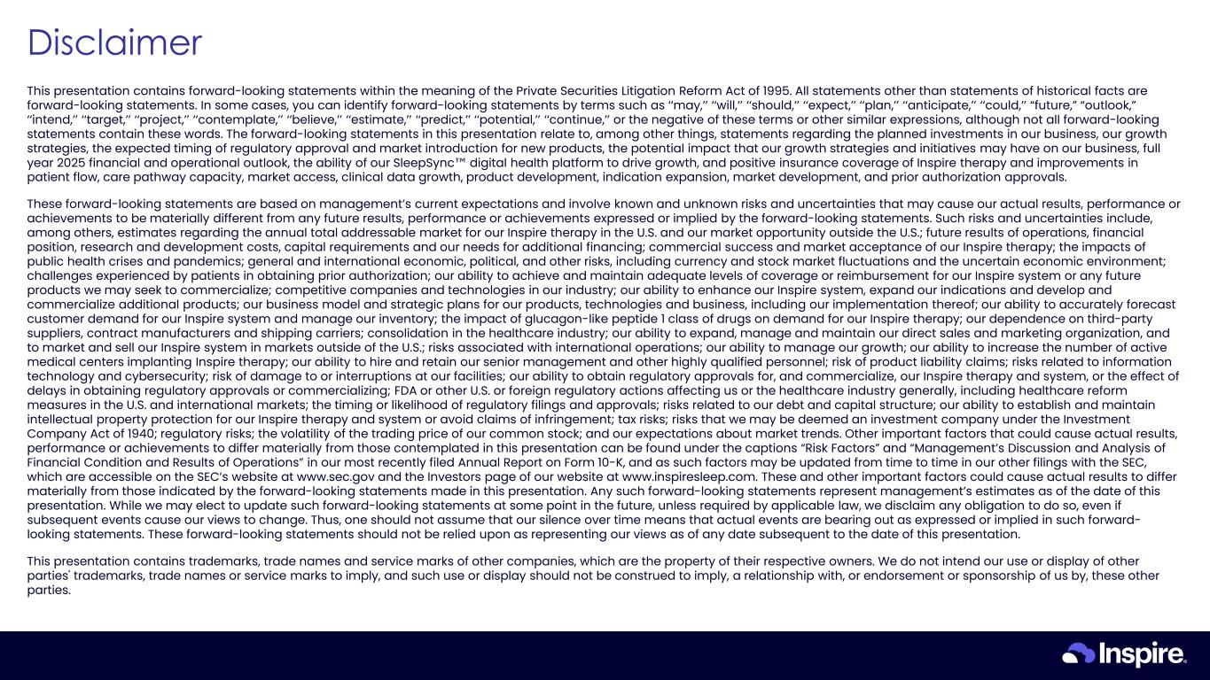 このようなリスクと不確実性には、特に、当社の営業損失の歴史と収益のInspireシステムへの依存、当社のInspire療法の商業的成功と市場受容性、当社のInspireシステムまたは当社が商業化を目指す将来の製品に対して適切なレベルの保険適用または償還を達成し維持する当社の能力、当社業界における競合企業、技術および医薬品、現在または将来の法的紛争または規制手続きへの当社の関与、当社の適応症を拡大し、追加の製品およびInspireシステムの機能強化を開発し商業化する当社の能力などが含まれます;将来の経営成績、財政状態、研究開発費、必要資本および追加融資の必要性、当社のInspireシステムに対する顧客需要を正確に予測し、在庫を管理する能力、第三者の供給業者、契約製造業者および輸送業者への依存、ヘルスケア業界における統合、当社の直接販売・マーケティング組織を拡大、管理、維持する能力、米国外の市場でInspireシステムを販売する能力、米国外の市場でInspireシステムを販売する能力。S.国際的な事業展開に伴うリスク、当社の成長を管理する能力、当社の上級管理職およびその他の優秀な人材を雇用し、維持する能力、製造物責任賠償請求のリスク、当社のInspireシステムで発生する可能性のある品質問題に対処する能力、買収した事業、製品、または技術をうまく統合する能力、世界的なマクロ経済動向の変化、患者が事前承認を得る際に経験する課題、当社のInspireシステムまたは当社が商業化を目指す将来の製品に対して適切なレベルの保険適用または償還を達成し、維持する能力;当社の製品、技術および事業に関するビジネスモデルおよび戦略的計画(その実施を含む)、グルカゴン様ペプチド1クラスの薬剤が当社のInspire療法に対する需要に与える影響、情報技術およびサイバーセキュリティに関するリスク、当社施設の損傷または中断のリスク、当社のInspire療法およびシステムの商業化または規制当局の承認取得の能力、または商業化または規制当局の承認取得の遅延の影響、FDAまたはその他の米国または外国の規制当局による当社への影響。米国および国際市場における医療制度改革措置を含む、当社または医療業界全般に影響を及ぼす米国または外国の規制当局の措置、規制当局への申請および承認の時期または可能性。実際の結果、業績、達成状況が本プレスリリースに記載されたものと大きく異なる可能性のあるその他の重要な要因については、当社の12月31日に終了した会計年度のForm 10-K年次報告書の「リスク要因」および「経営陣による財政状態および経営成績の検討および分析」に記載されています、2023年12月31日に終了した会計年度のForm 10-K年次報告書、2024年9月30日に終了した会計年度のForm 10-Q四半期報告書、および2024年12月31日に終了した会計年度のForm 10-K年次報告書において更新される予定です。sec.govおよび当社ウェブサイト(www.inspiresleep.com)の投資家ページでご覧いただけます。これらおよびその他の重要な要因により、実際の結果が本プレスリリースに記載された将来の見通しに関する記述と大きく異なる可能性があります。このような将来予想に関する記述はすべて、本プレスリリースの日付時点における経営陣の推定を表しています。当社は将来のある時点でかかる将来予想に関する記述を更新することを選択する可能性がありますが、適用される法律で義務付けられている場合を除き、後発事象により当社の見解が変更されたとしても、当社はその義務を負いません。従って、当社が沈黙を守っている間に、実際の出来事がかかる将来見通しに関する記述で表明または暗示されている通りになると考えるべきではありません。これらの将来見通しに関する記述は、本プレスリリースの日付以降のいかなる日付においても、当社の見解を表すものとして依拠すべきではありません。