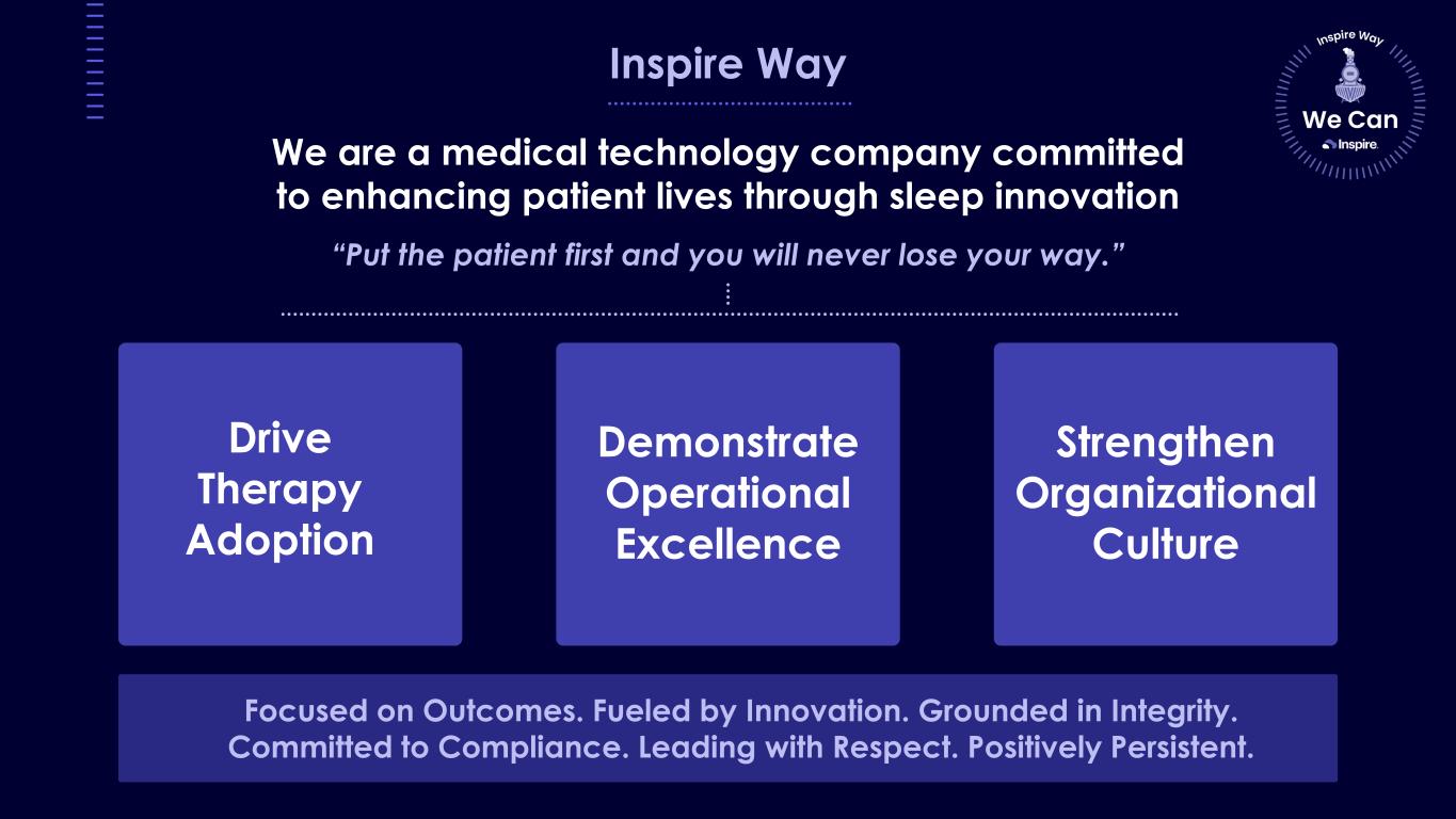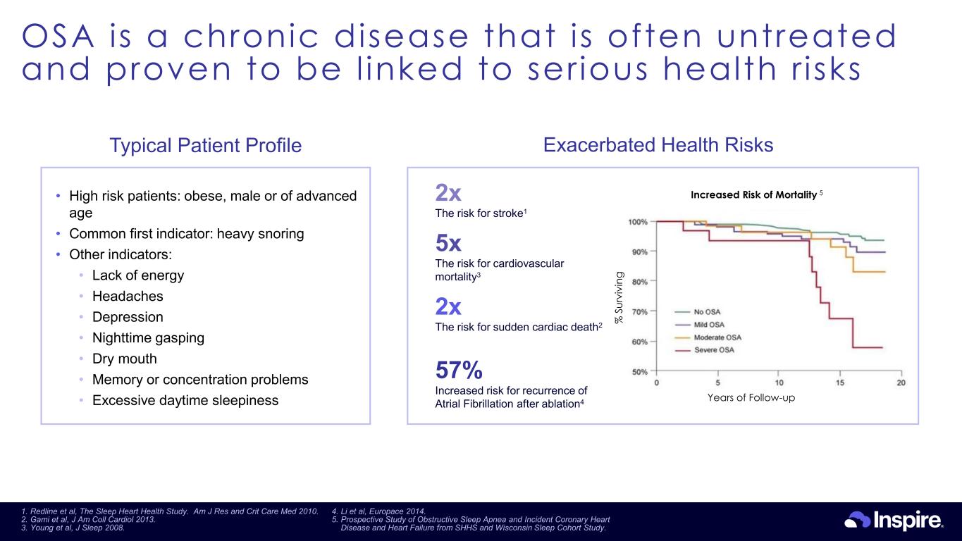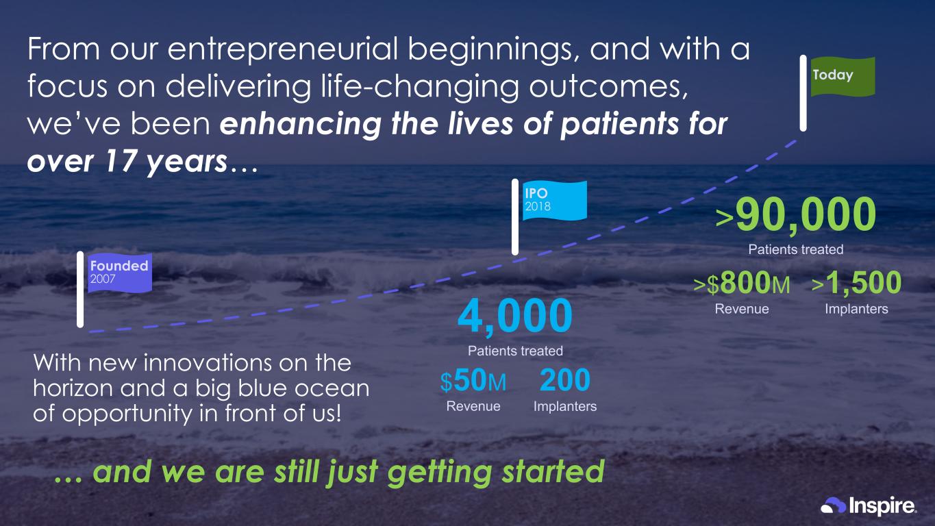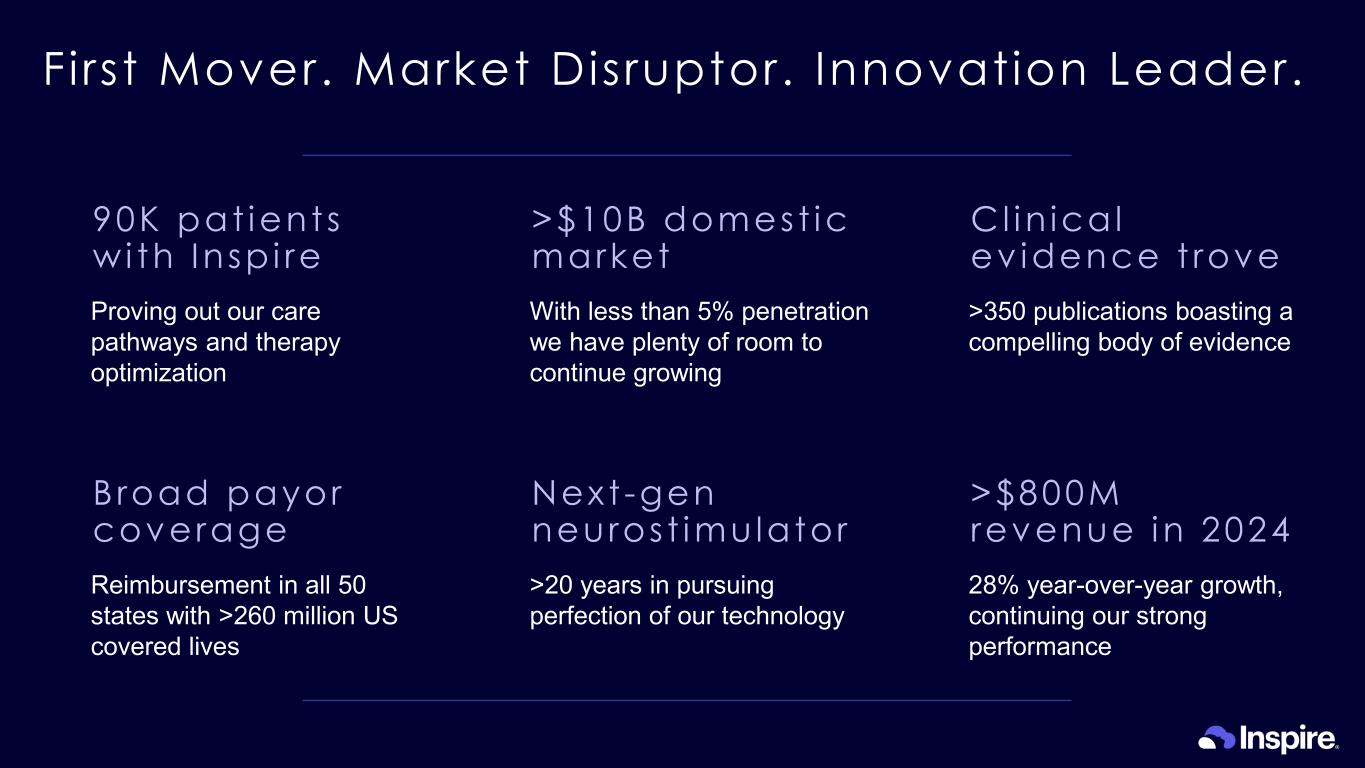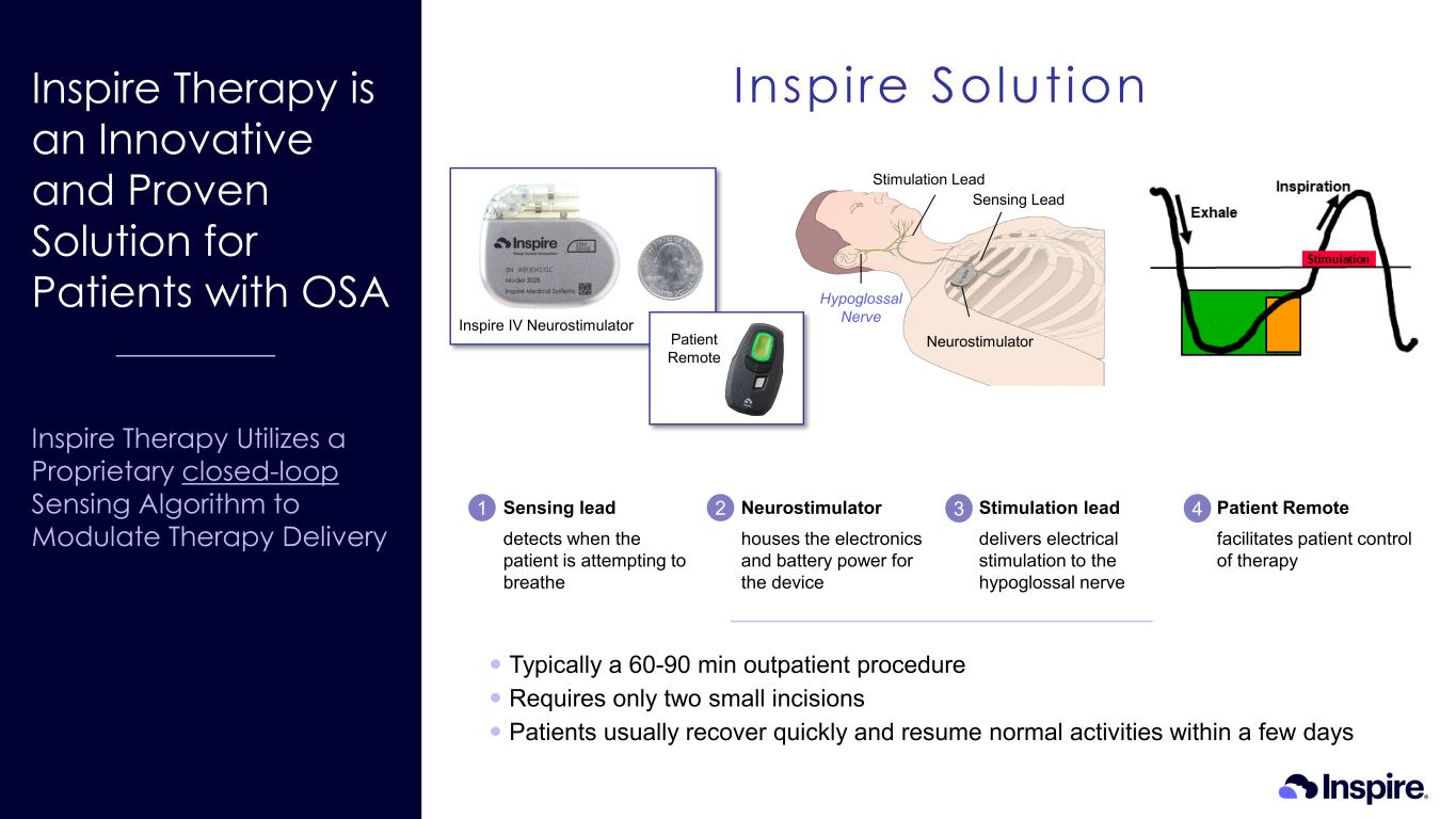 Inspire社は、閉塞性睡眠時無呼吸症候群患者のための革新的で低侵襲なソリューションの開発と商品化に重点を置く医療技術企業である。Inspire社独自のInspire療法は、中等度から重度の閉塞性睡眠時無呼吸症候群に安全で効果的な治療を提供する、FDA、EU MDR、PDMAに承認された最初で唯一の神経刺激技術である。