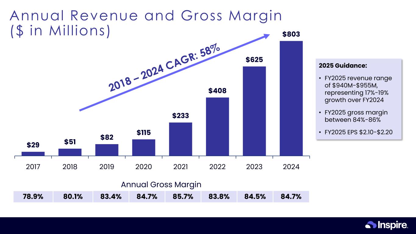 インスパイア社が先に発表した2025年通年の売上高ガイダンスは9億4,000万ドルから9億5,500万ドルのままであり、これは2024年通年の売上高8億2,080万ドルに対して17%から19%の成長が見込まれることを示している。